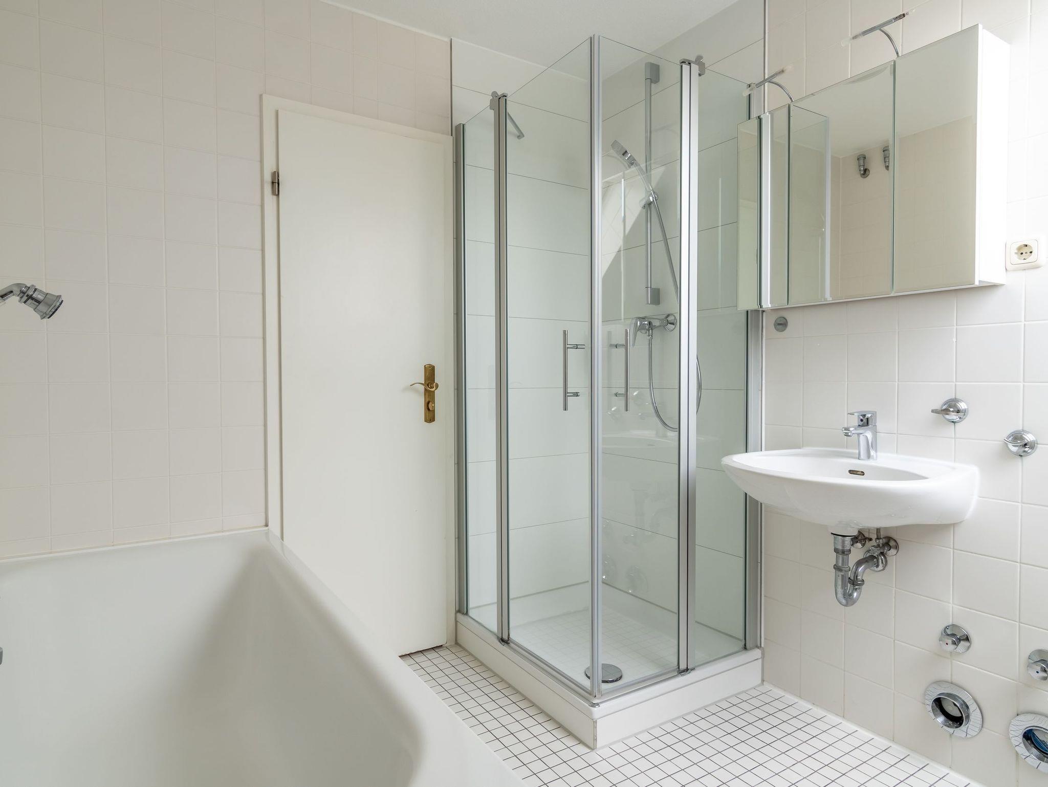Im Bad mit Tageslicht befindet sich eine Badewanne und eine Dusche.