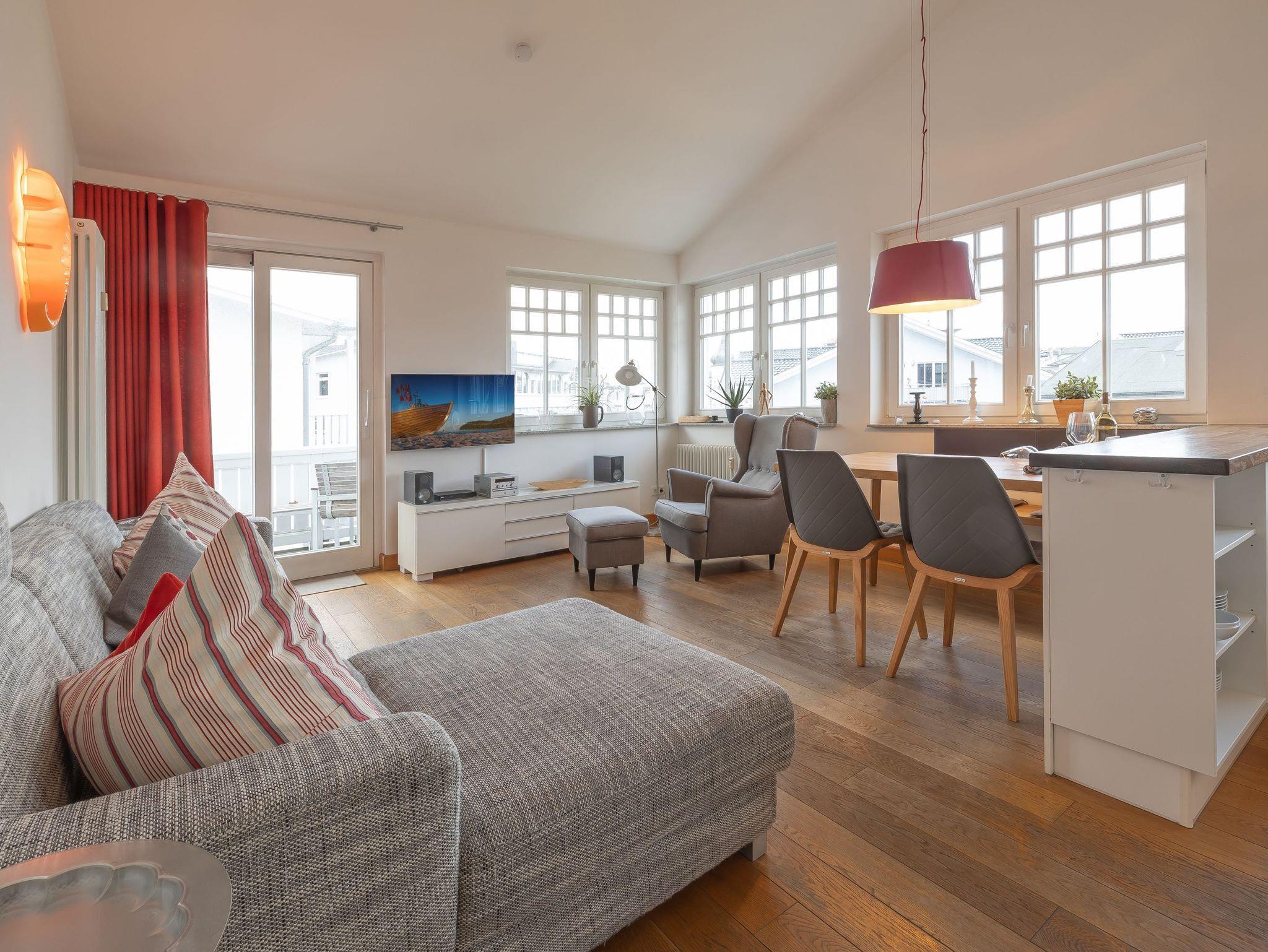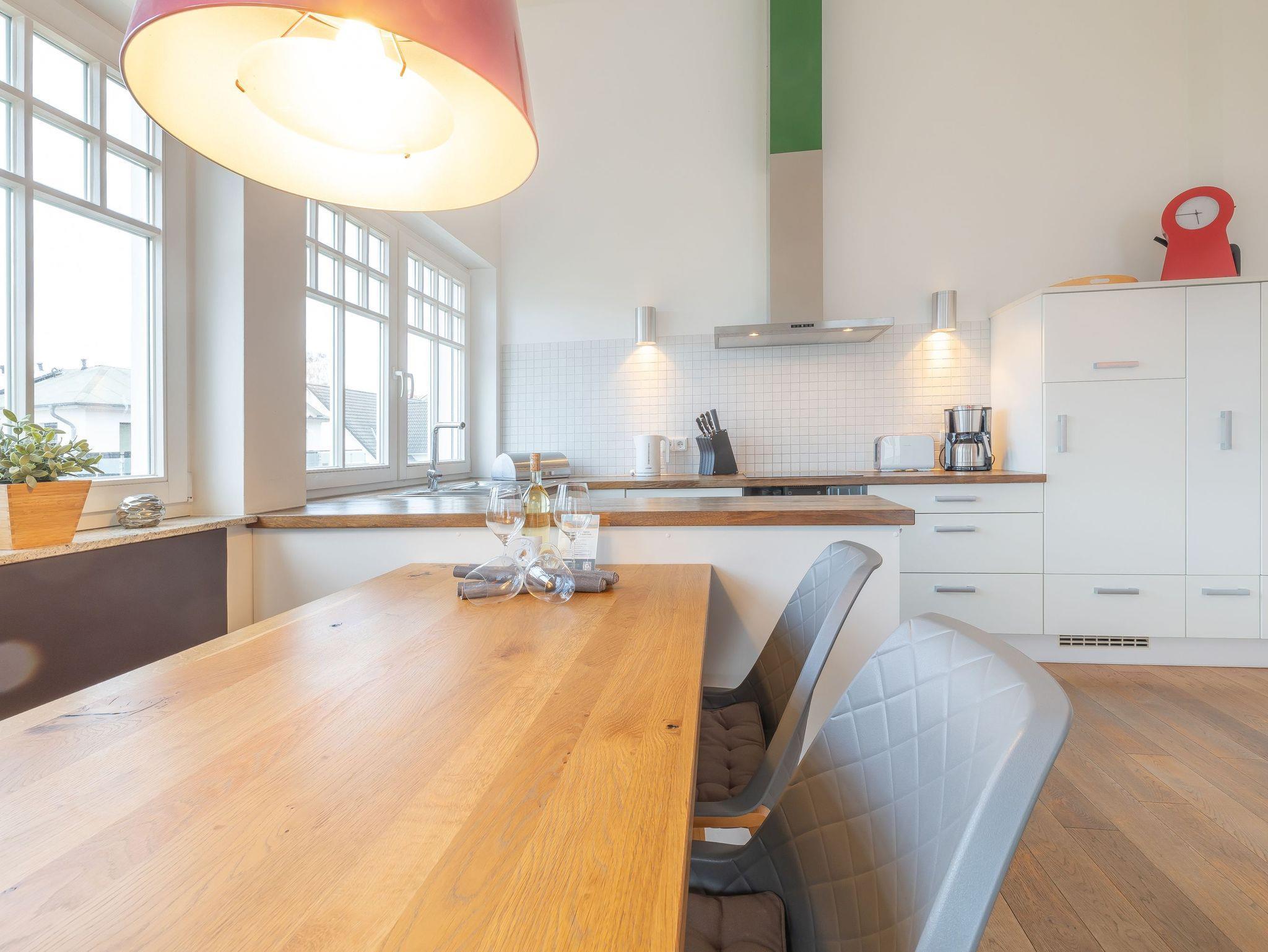 Der moderne und helle Küchenbereich ist zum Wohnbereich durch einen Tresen abgegrenzt. [nbsp]Gerade dieses offene Wohnkonzept lässt ein sehr gemütliches und kommunikatives Wohnerlebnis im Urlaub zu, und die hohen Decken entfalten geradezu einen Loft-Charme. Ein Esszimmertisch mit Platz für 4 Personen grenzt direkt an den integrierten Tresen an.