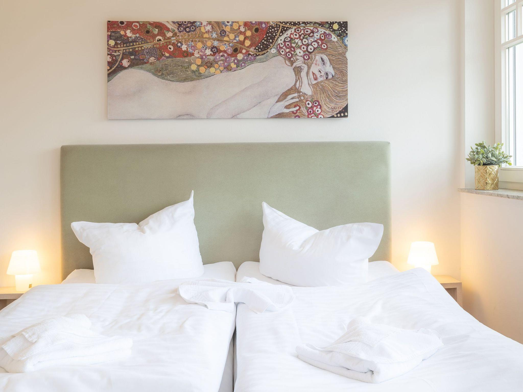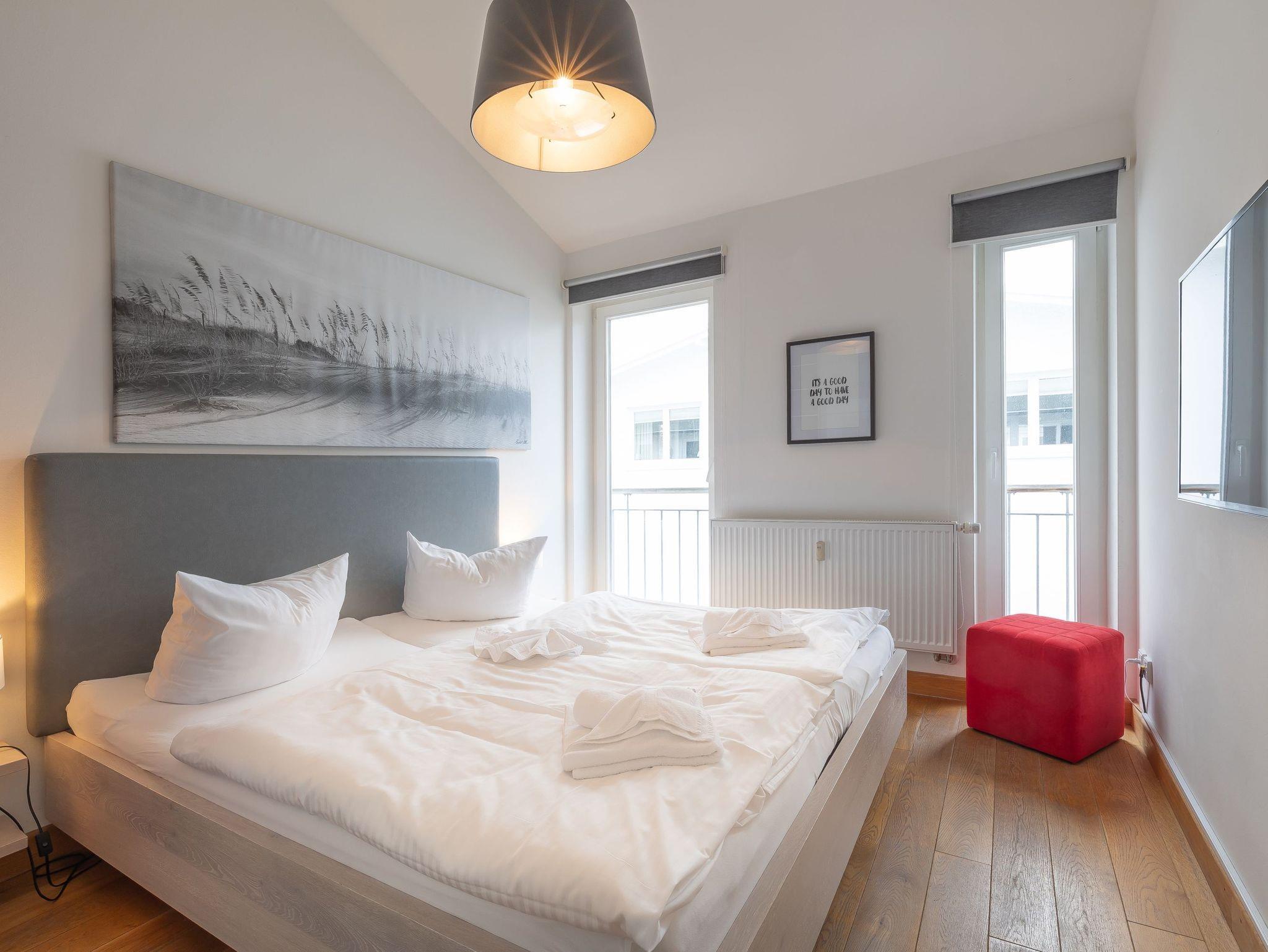 Die Wohnung verfügt über zwei Doppelschlafzimmer mit je einem Doppelbett (1,80 m x 2,00 m) .
