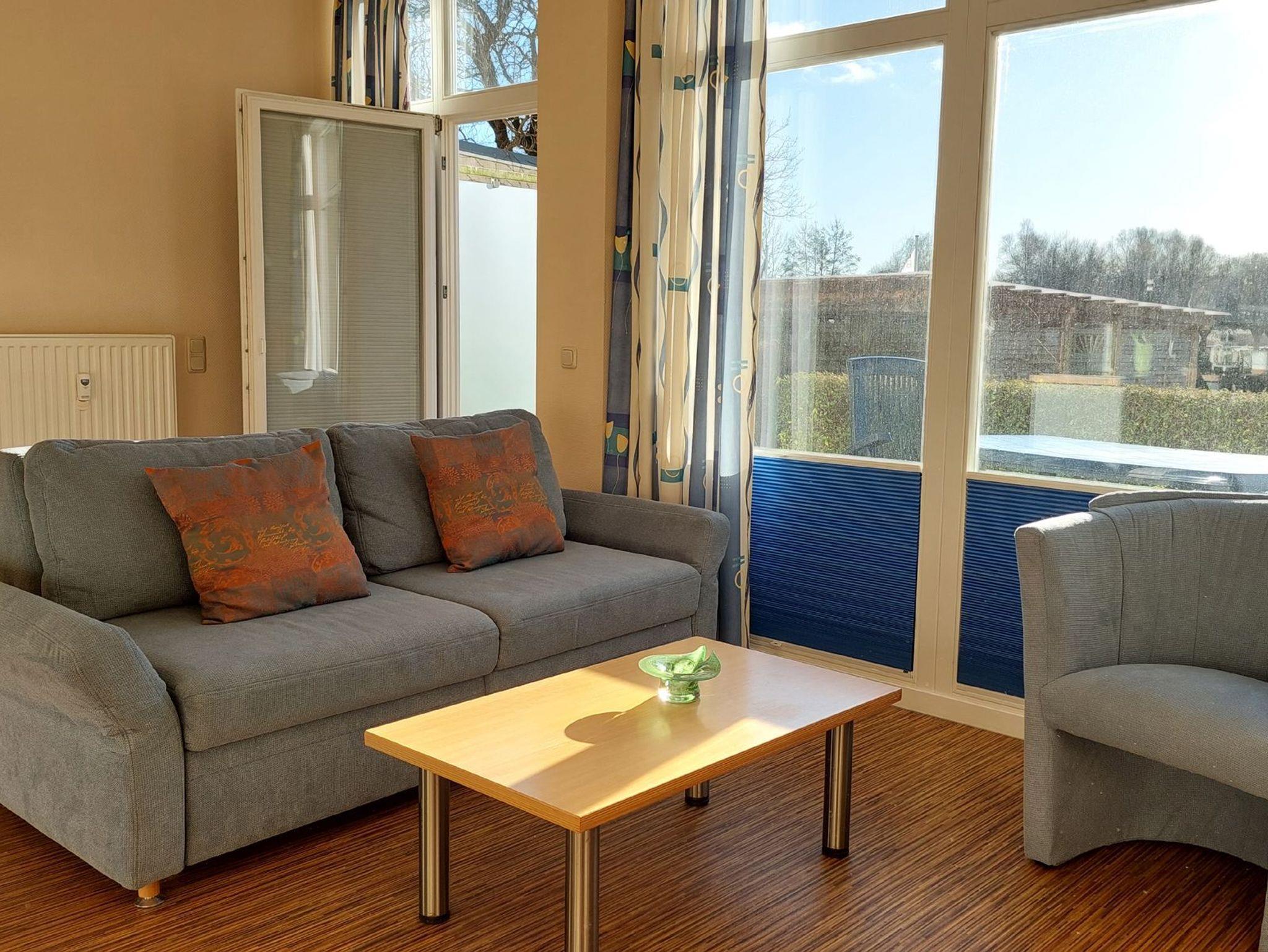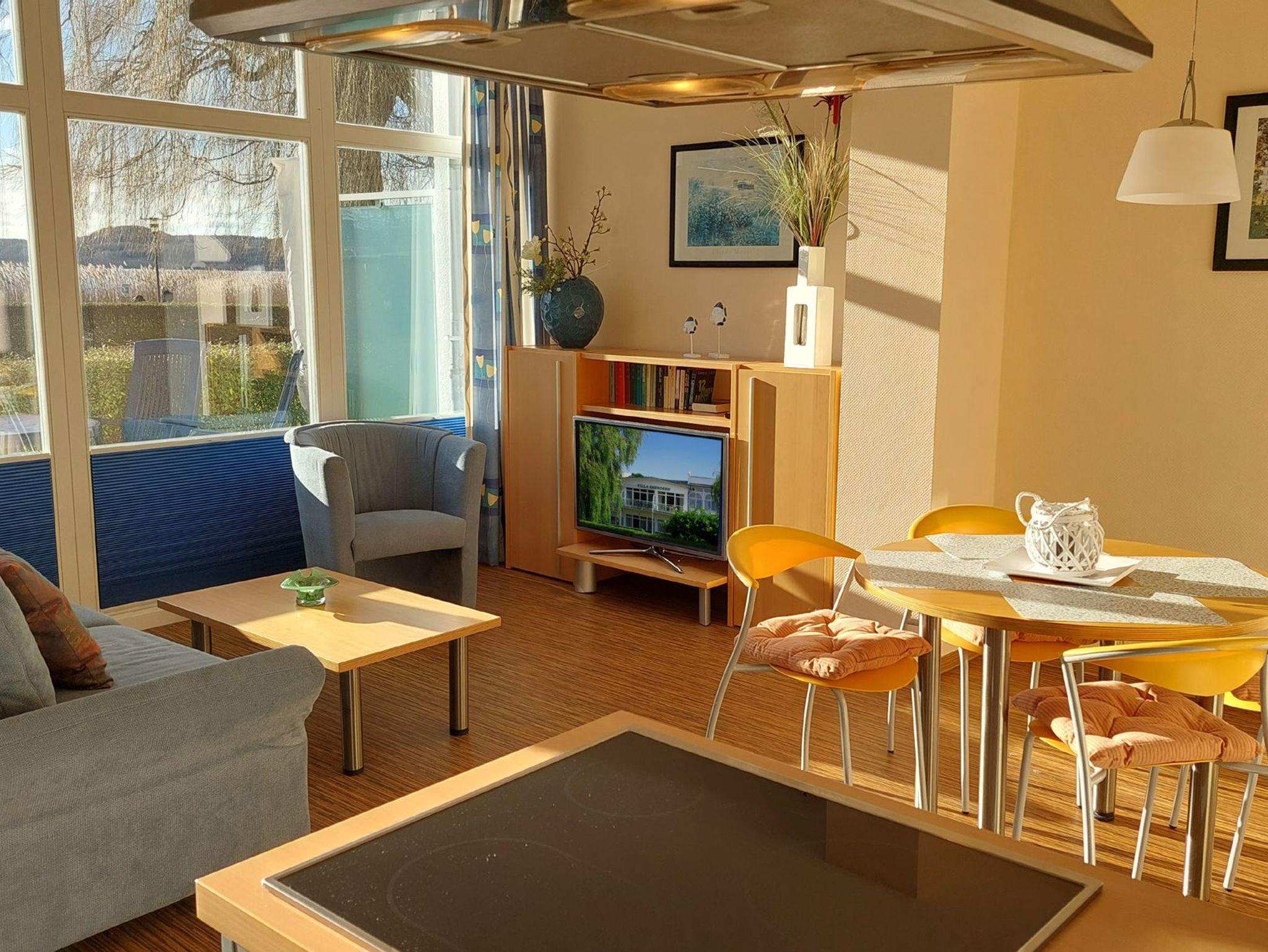 Der lichtdurchflutete Wohn- und Essbereich verfügt über ein gemütliches Sofa (mit Schlaffunktion), einen Smart-TV, eine kleine Hifi-Anlage und einen Essbereich mit 4 Sitzgelegenheiten.