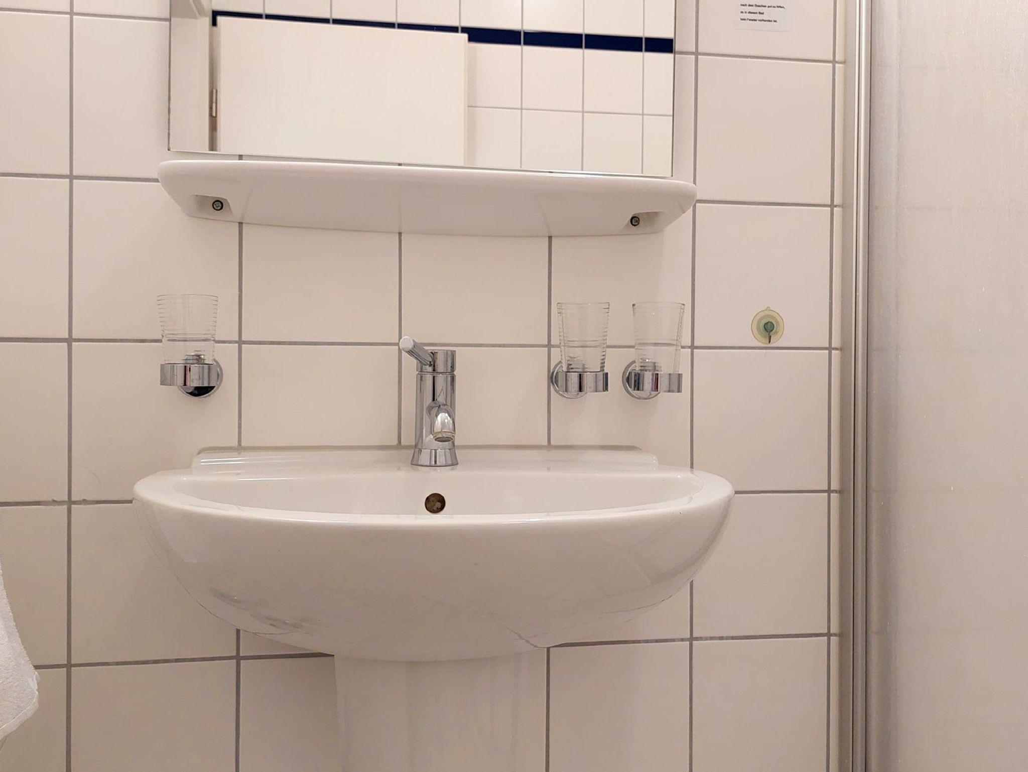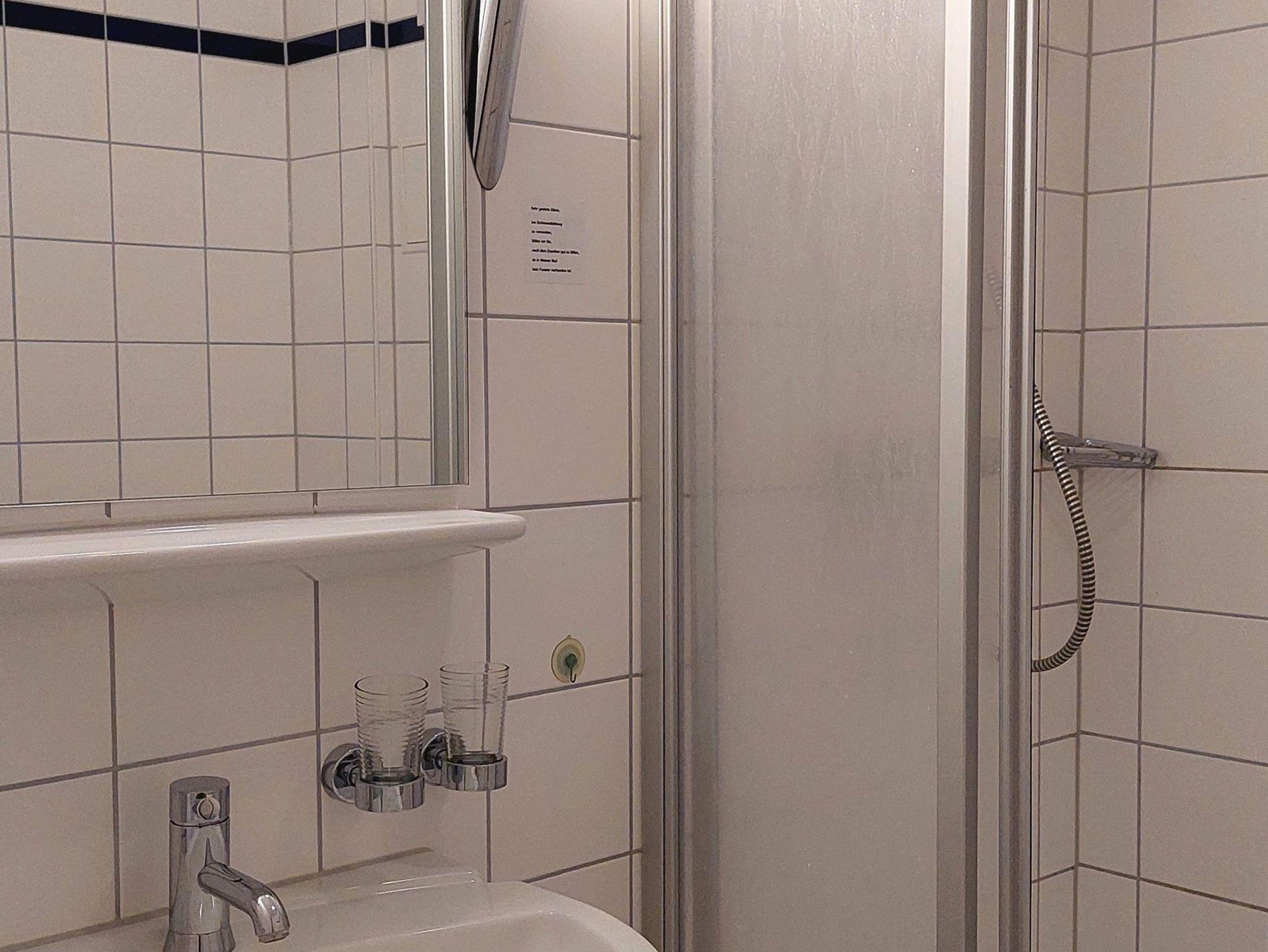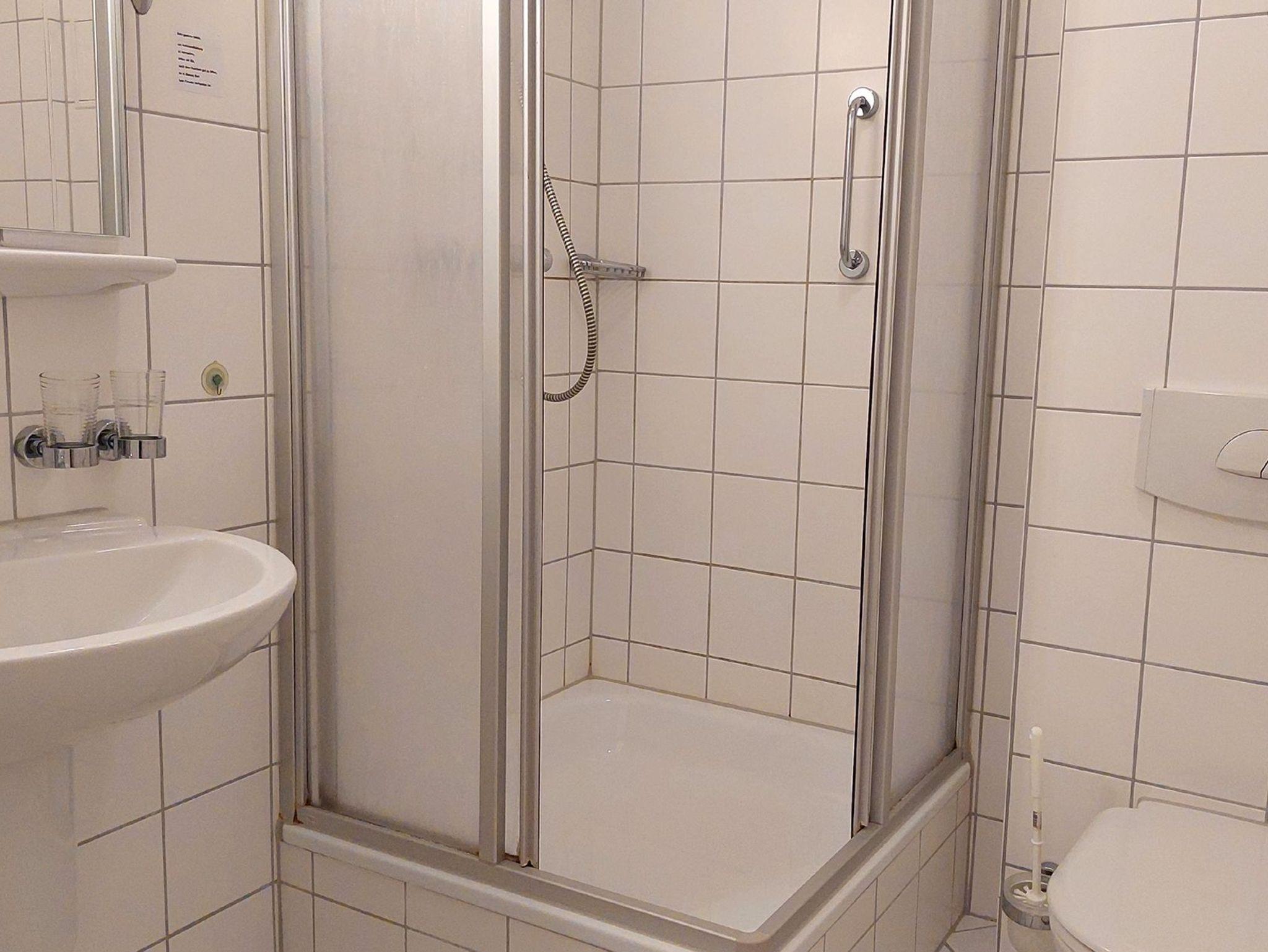 Im Badezimmer befindet sich eine Dusche, WC und ein Waschtisch samt Kosmetikspiegel und Fön.