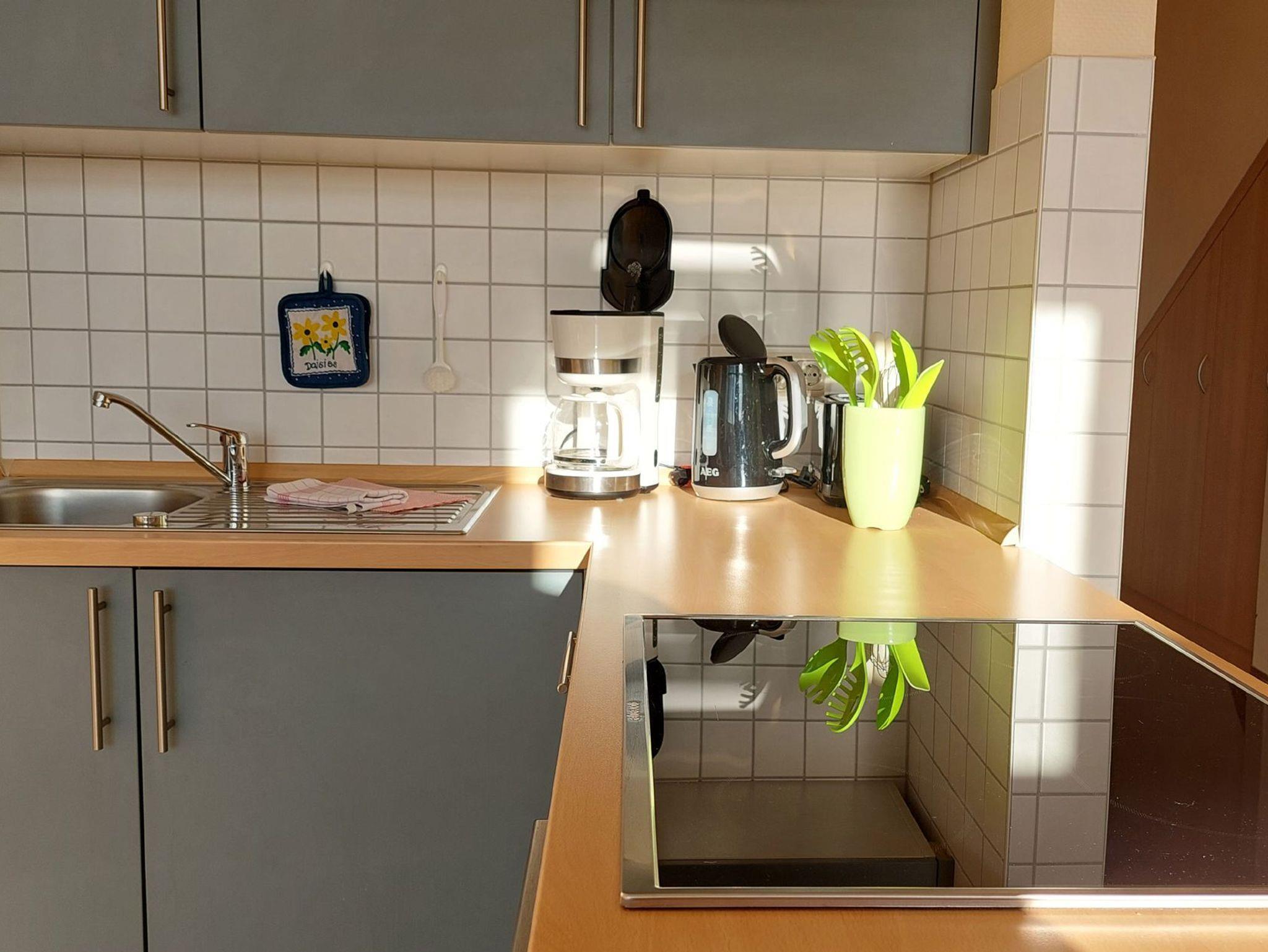 Die neue Kochzeile ist mit Kühlschrank, Backofen, Cerankochfeld, Kaffeemaschine, Wasserkocher, Toaster und diversen Küchenhelfern ausgestattet.