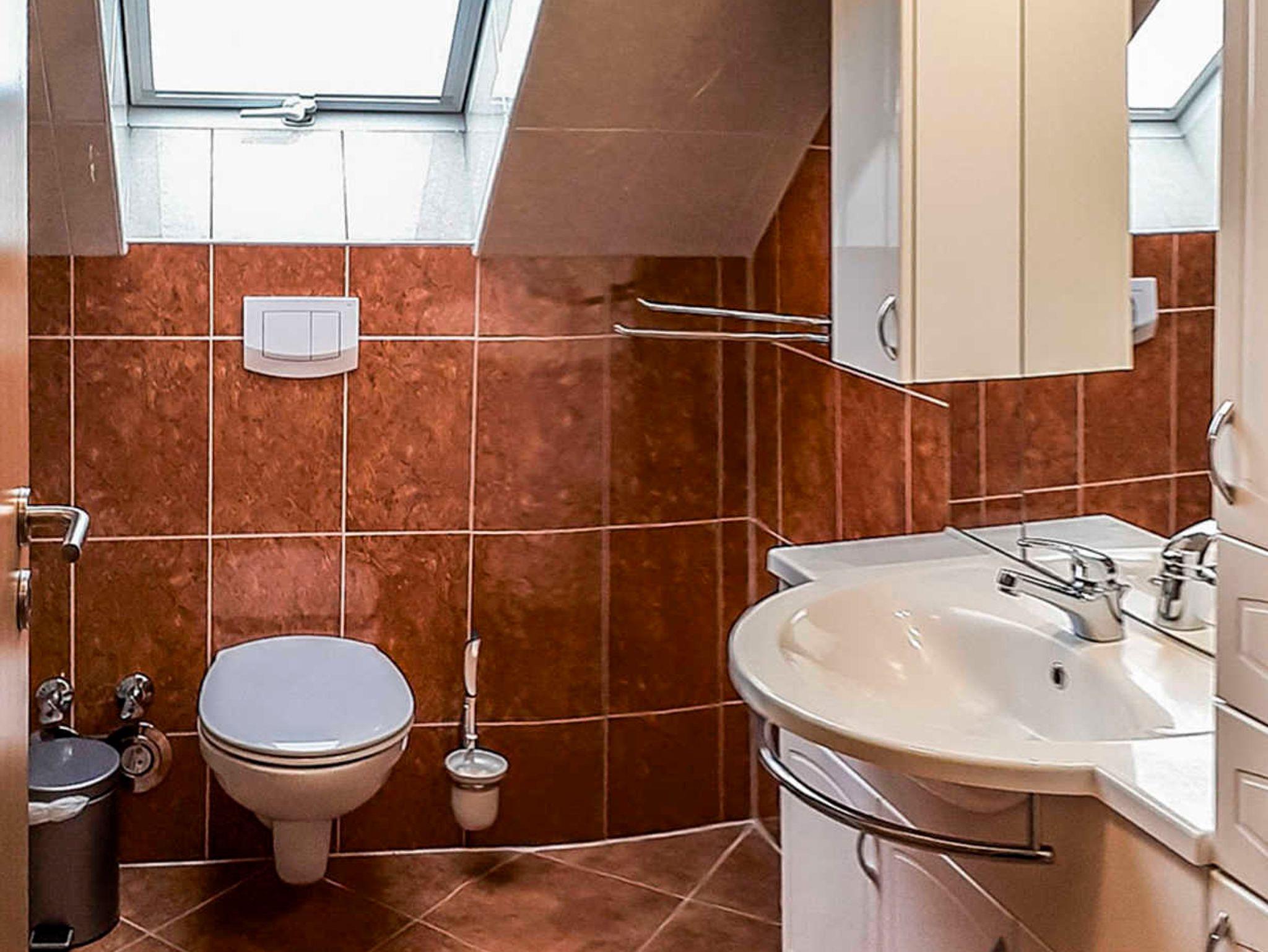 Die gemütliche und modern eingerichtete 3-Zimmerwohnung Nr. 16 befindet sich im Dachgeschoss des Hauses. Die Nichtraucherwohnung verfügt über eine Größe von ca. 53 qm und ist mit bis zu 3 Personen belegbar. Die helle Wohnung ist aufgeteilt in einem vorgelagerten Flur mit einer Garderobe, einem gemütlichen Wohnbereich mit Wohnküche sowie einem Essplatz, zwei Schlafzimmer und ein Tageslichtbad. Im Wohnbereich erwartet Sie eine bequeme Sitzecke. Die technische Einrichtung umfasst einen SMART Flachbildfernseher, ein Radio mit CD-Player sowie einen gebührenfreien WLAN-Zugang. In der Küchenzeile erwartet Sie unter anderem ein Backofen, 4 Plattenkochfeld, Kühlschrank mit Gefrierfach, Kaffeemaschine, Toaster, Wasserkocher sowie umfangreiches Kücheninventar. Das Schlafzimmer verfügt über ein großes Doppelbett mit Nachttischen, einen Kleiderschrank mit Spiegel sowie Verdunklungsvorhänge für eine erholsame Nachtruhe. Das zweite Schlafzimmer begrüßt Sie mit einem Einzelbett. Im Bad erwartet Sie eine Dusche, ein Waschtisch, Kosmetikspiegel und WC.