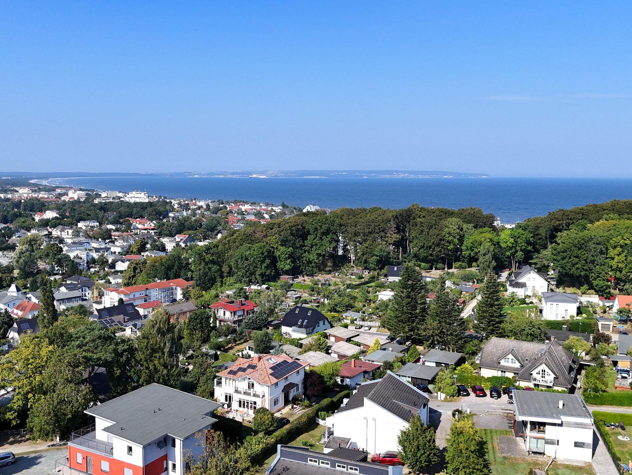 Der lichtdurchflutete Wohnbereich mit hochwertiger Einrichtung führt ebenfalls auf die großzügige Dachterrasse, die einen atemberaubenden Blick über die Dächer von Binz bietet. Eine moderne, voll ausgestattete Küche lässt keine Wünsche offen.