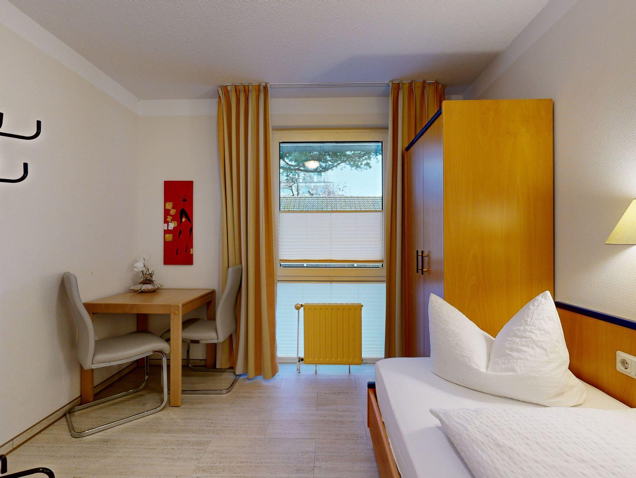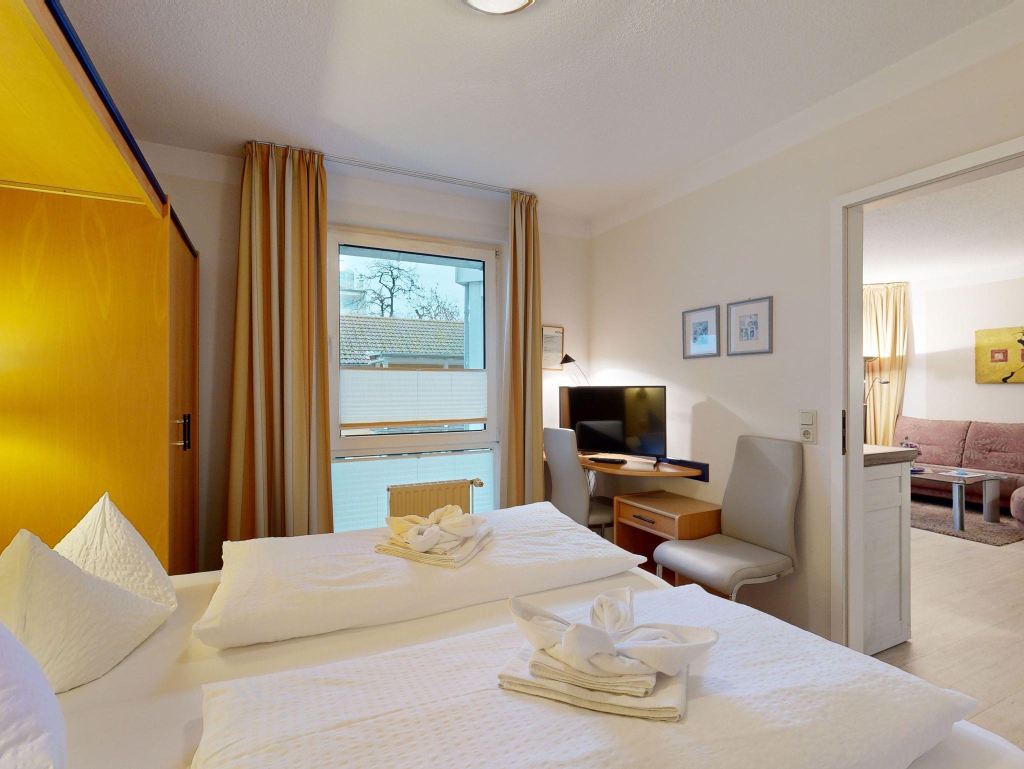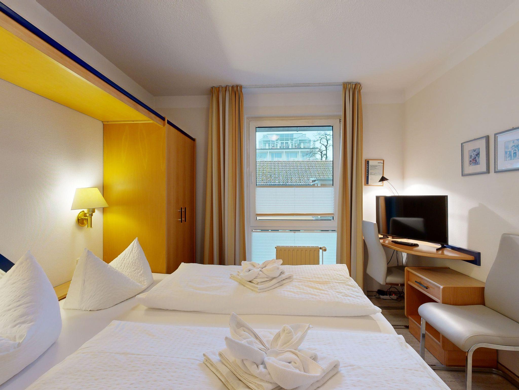 Komfort-Ferienwohnung im Haus Strelasund in der 1. Etage (3 Zimmer / 62 m²) mit zwei Schlafzimmern und einem seitlichen Balkon mit Meerblick. Das Haus liegt direkt an der Strandpromenade