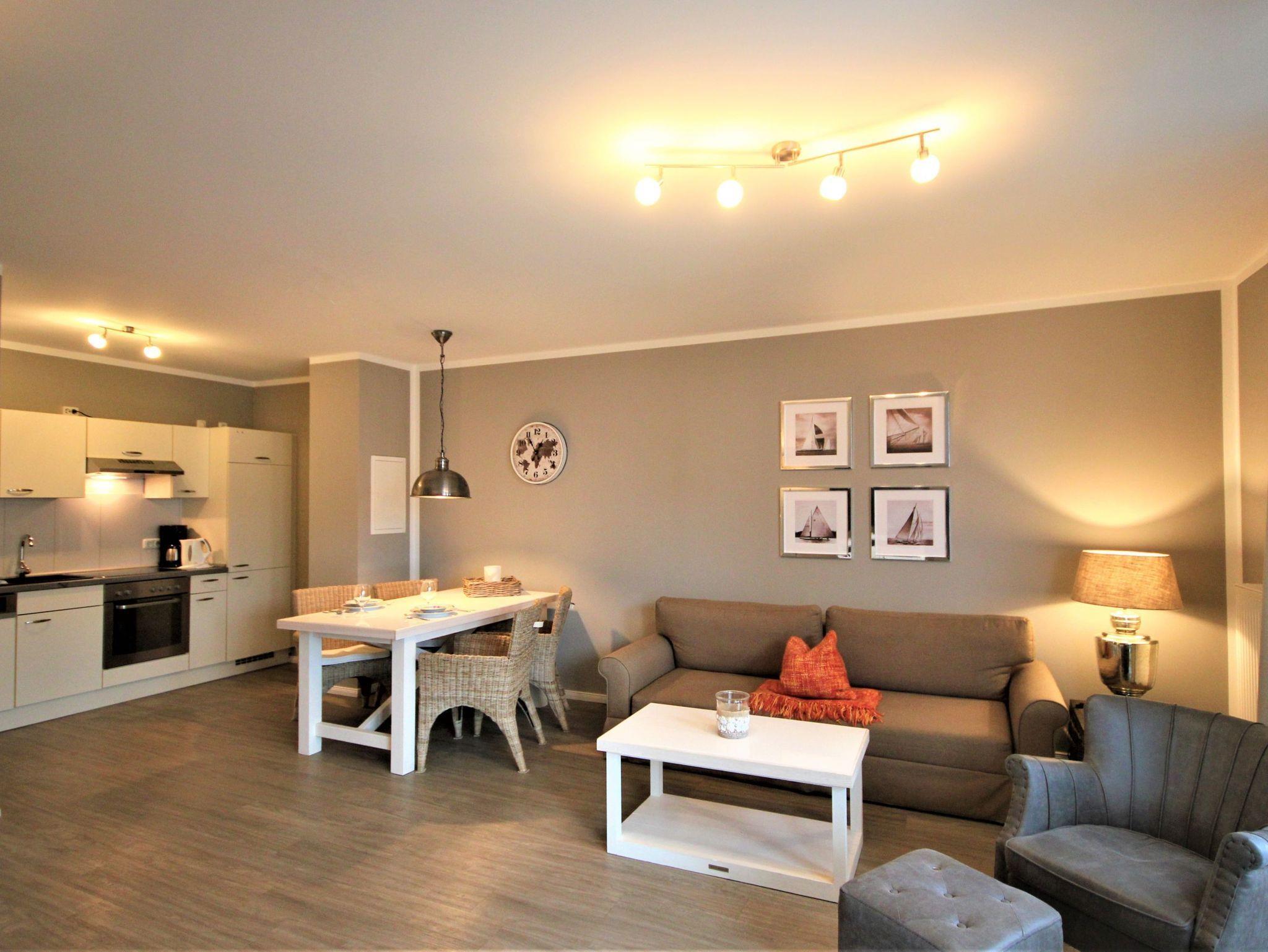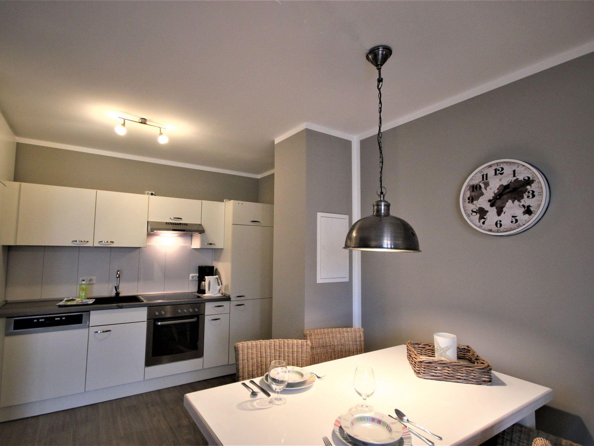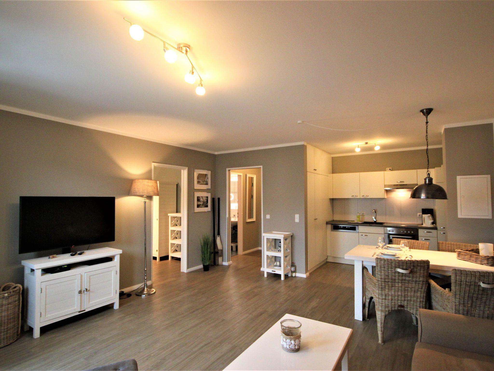Ihre 2-Zi. Wohnung 219RB11 (Nichtraucher) besitzt eine Größe von ca. 57 qm und ist mit bis zu 4 Personen belegbar. Sie befindet sich im 1. Obergeschoss des Hauses. Auf dem Frühstücksbalkon werden Sie von der Morgensonne gekitzelt. Hier befindet sich auch ein Strandkorb, welcher zum Verweilen einlädt. Die moderne Ferienwohnung in Vintage-Optik teilt sich auf in einen Flur mit Garderobe und großem Schrank für Ihr Gepäck, einen Wohnraum mit offener Küche und Essbereich, ein separates Schlafzimmer sowie ein Duschbad. Der großzügige Wohnbereich verfügt über eine Sitzecke mit Schlaffunktion für die 3. / 4. Person, einen Flachbild-TV samt DVD-Player, Radio sowie einen gebührenfreien WLAN-Zugang. Im Schlafraum befindet sich ein Doppelbett, ein zusätzlicher TV und ein Kleiderschrank. Vom Schlafzimmer und auch vom Wohnbereich gelangen Sie auf den Balkon. Verdunklungsstoffe im Wohn- und Schlafbereich bereiten eine behagliche Nachtruhe. Die Küchenzeile ist mit Geschirrspüler, Ceranfeld, Backofen, Kühl-/Gefrierkombination, Kaffeemaschine, Wasserkocher, Toaster und anderen diversen Küchenhelfern komplett ausgestattet. Das Badezimmer verfügt über einen Waschtisch mit großem Spiegel, eine Dusche, WC und einen Handtuchheiztrockner. Ein kostenfreier Tiefgaragenstellplatz steht Ihnen während Ihres Aufenthaltes zur Verfügung. Rundum eine schön eingerichtete Wohnung, die zum Entschleunigen einlädt. Genießen Sie Ihren Urlaub und machen Sie diese Wohnung zu Ihrem zweiten Zuhause!