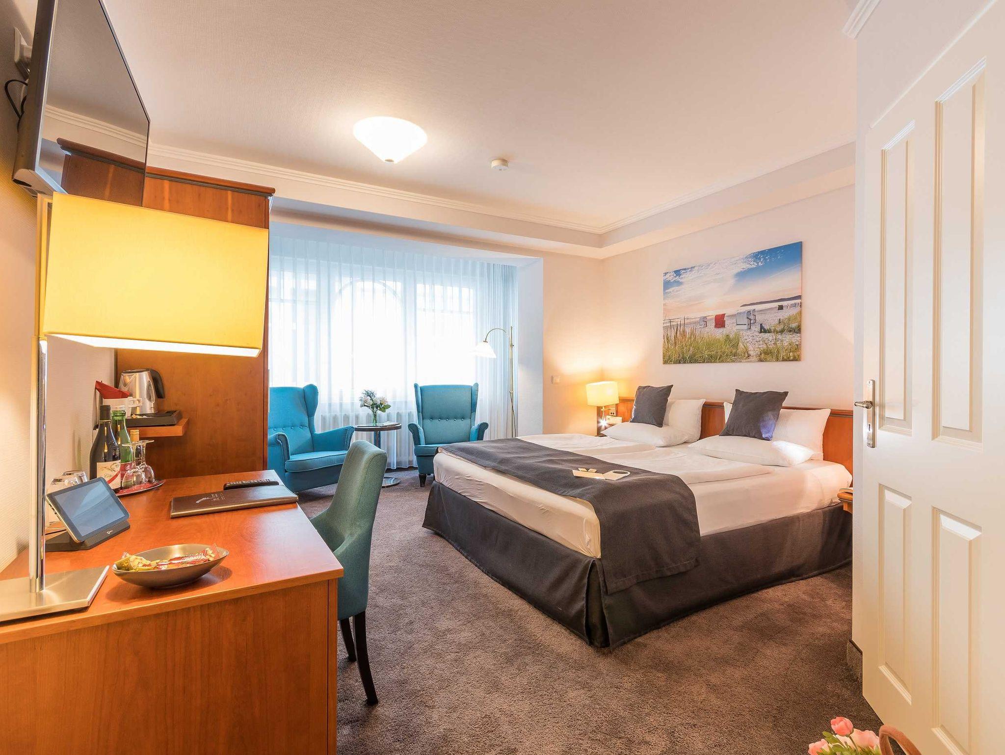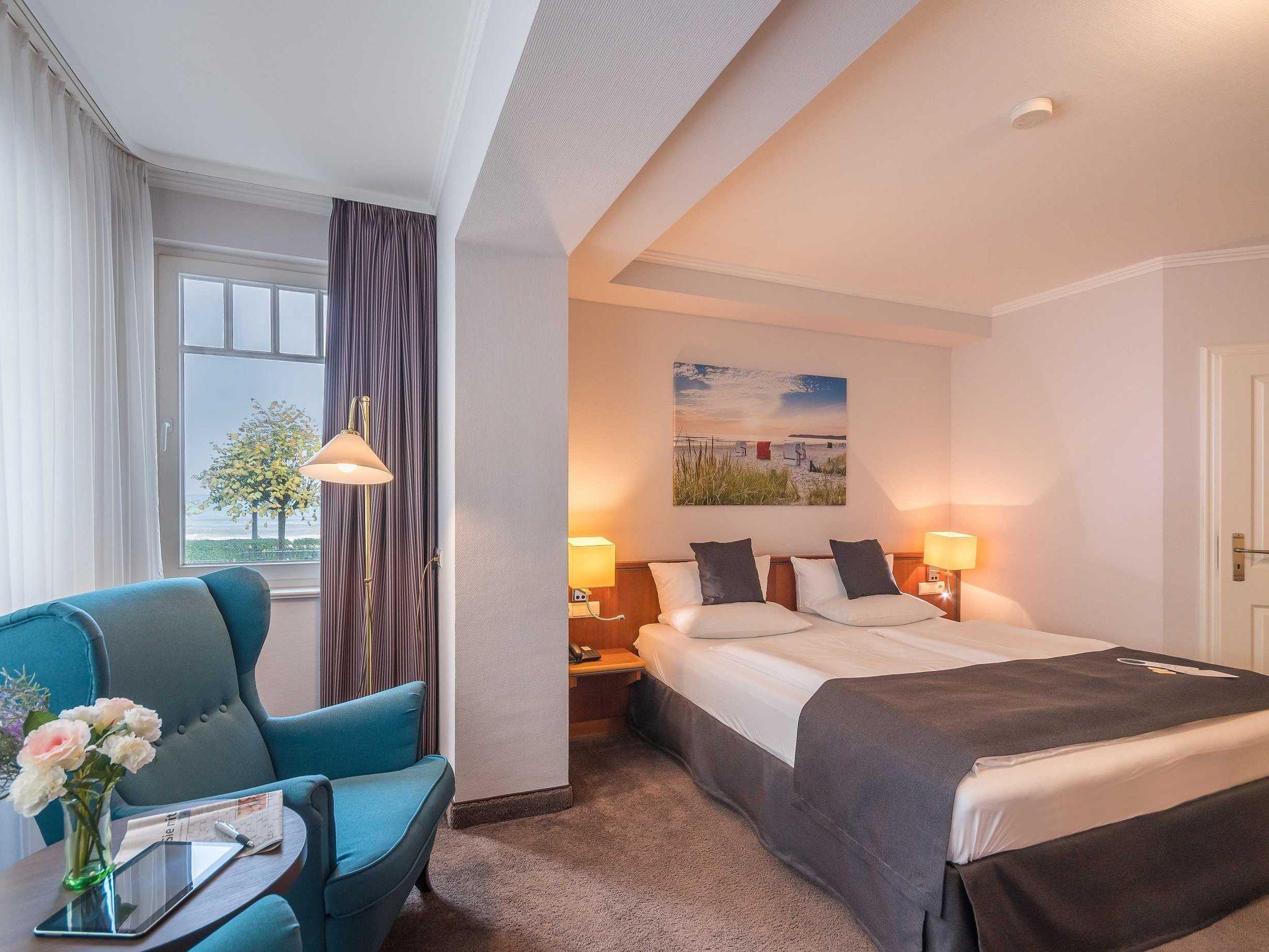 Alle unsere Zimmer sind liebevoll eingerichtet und bestechen mit einmaligem Komfort. Die modernen Bäder sind kleine Wohlfühl-Oasen mit viel Raum zur freien Entfaltung, alle Räumlichkeiten sind mit TV, Telefon, Zimmersafe und einer Minibar ausgestattet. Unsere mondänen Suiten verfügen außerdem über einen vollausgestatteten Küchenbereich sowie eine einladende Badewanne ? zum Träumen und Genießen. Besonders eindrucksvoll: Aus vielen unserer Doppelzimmer und Juniorsuiten haben Sie einen unvergesslichen Panoramablick auf die Ostsee.