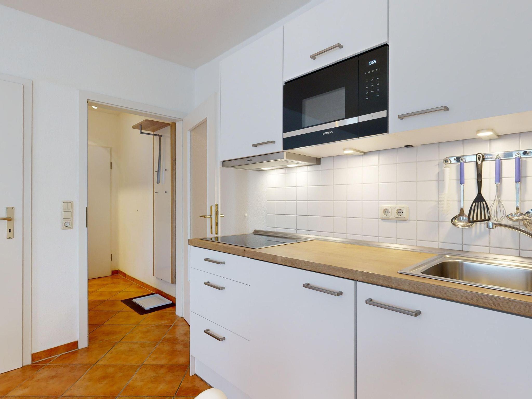 Küchenzeile mit Spülmaschine, Ceranfeld, Mikrowelle mit Grillfunktion, Kaffeemaschine, Toaster und Kühlschrank mit Gefrierfach