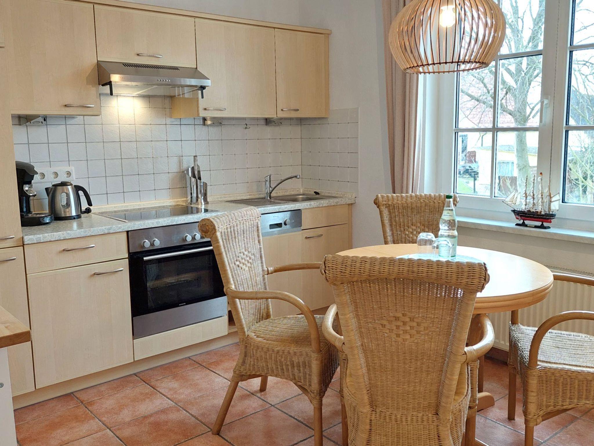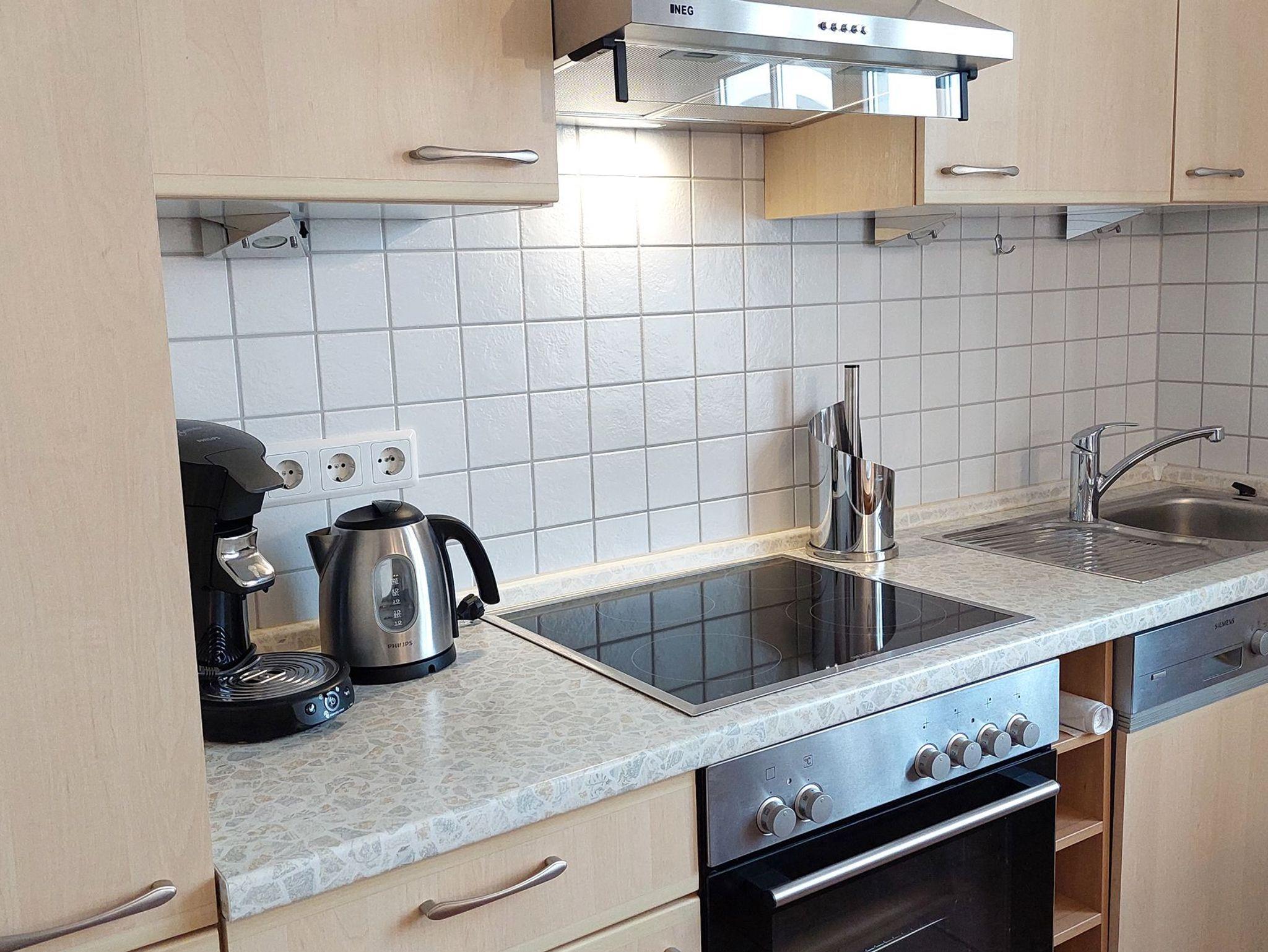 Der Kochbereich läd zur Selbstversorgung ein mit Cerankochfeld, Backofen, Geschirrspüler und Kühlschrank mit Gefrierfach.