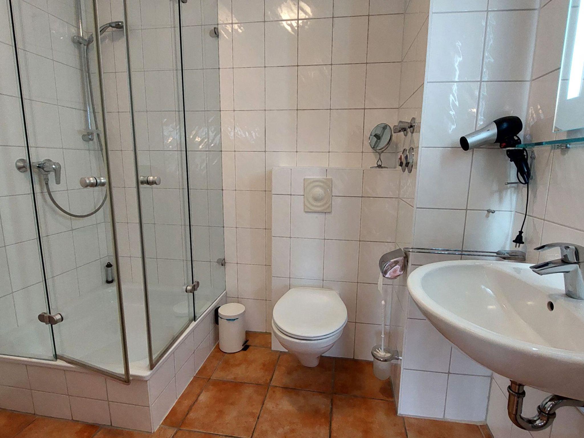 Im Badezimmer befindet sich WC, Dusche, Fön und eine Handtuchheizung,