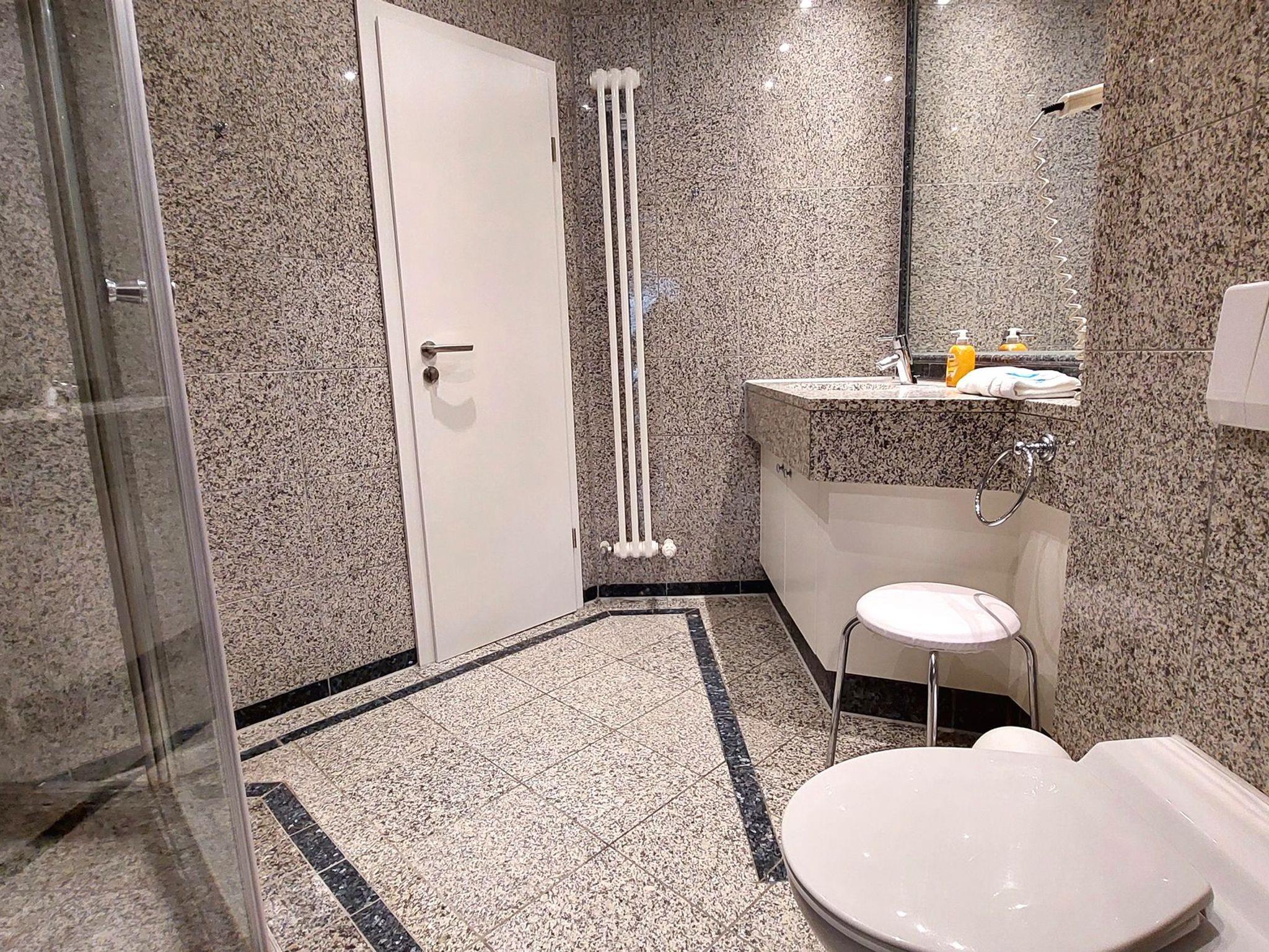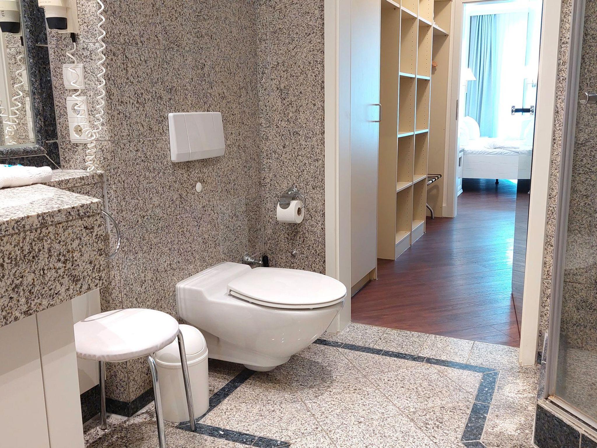 Das Badezimmer ist in Marmoroptik gehalten und verfügt über eine Toilette, einen Waschtisch, eine ebenerdige Dusche, einen Kosmetikspiegel, Fön und Zugang zum Ankleidezimmer mit viel Stauraum.