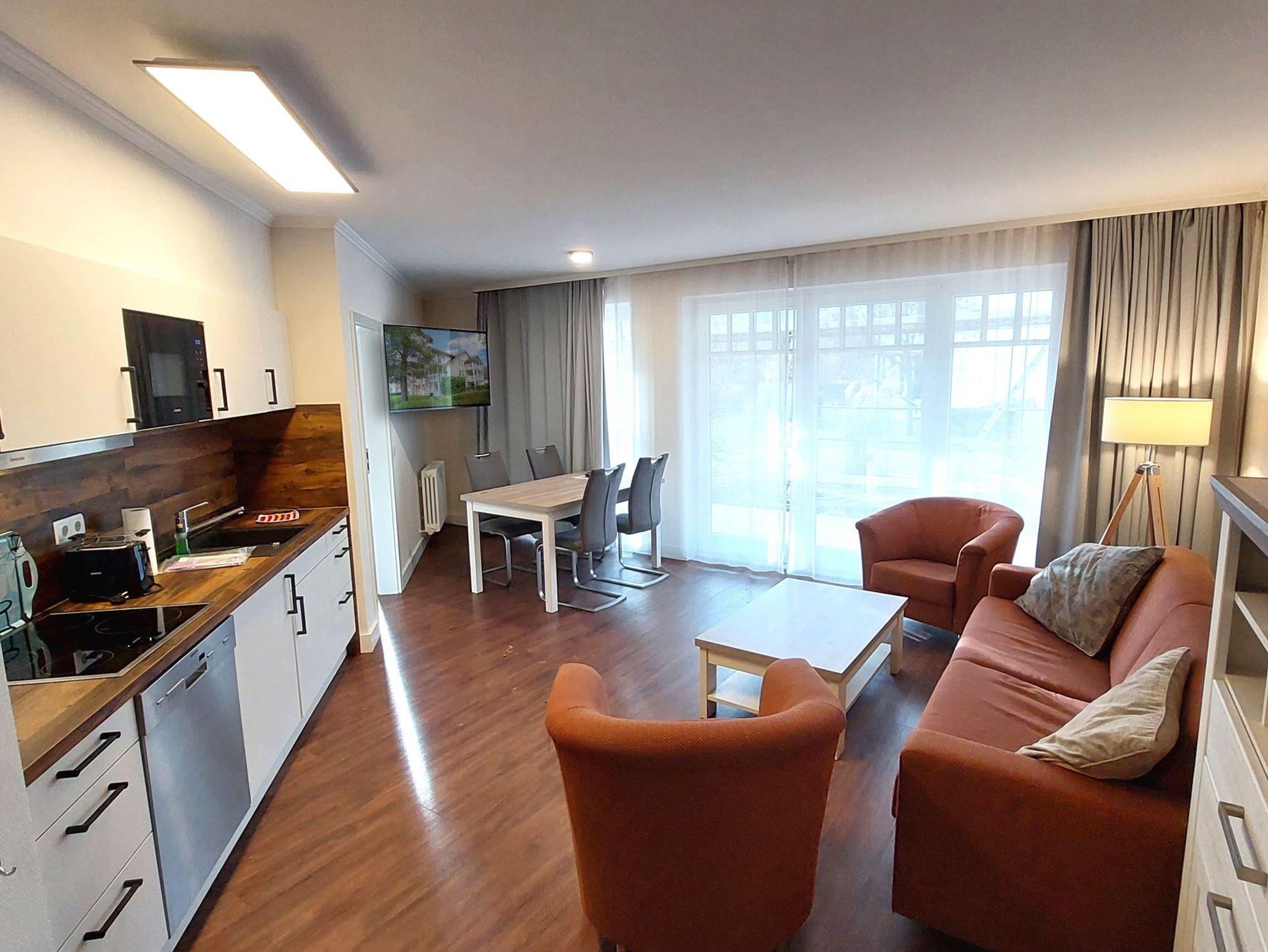 Der Wohn- und Essbereich beherbergt eine moderne Küchenzeile mit Ceran-Kochfeldern, einem Geschirrspüler, einem Kühlschrank mit Gefrierfach, einer Mikrowelle und verschiedenen Küchenutensilien. Der Essbereich bietet Platz für 4 Personen und eine gemütliche Sitzlandschaft lädt zum Verweilen ein. Zur technischen Ausstattung gehören kostenfreies WLAN, ein Smart-TV und eine kleine Musikanlage.