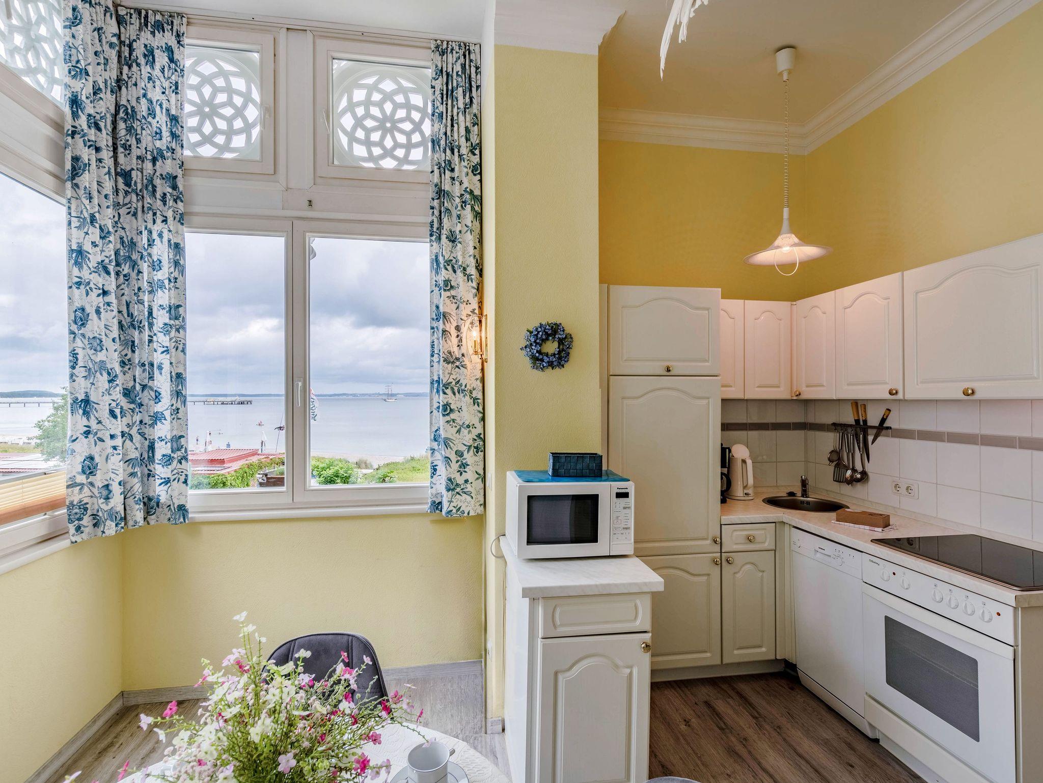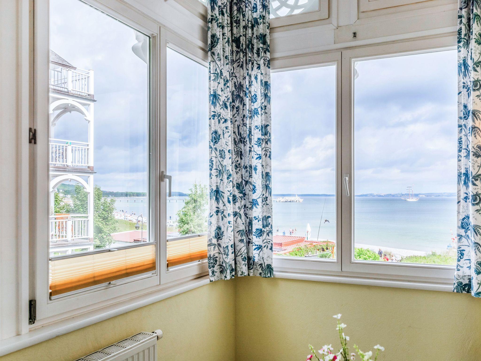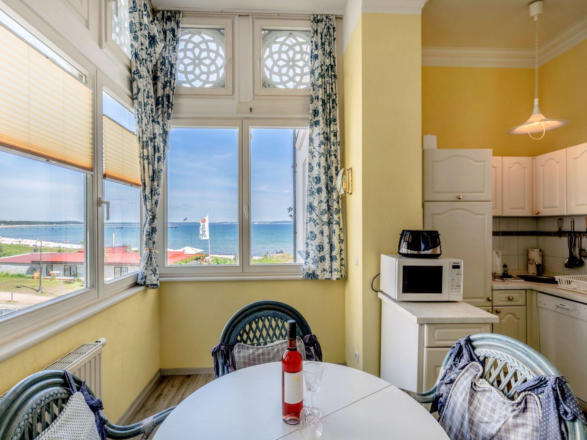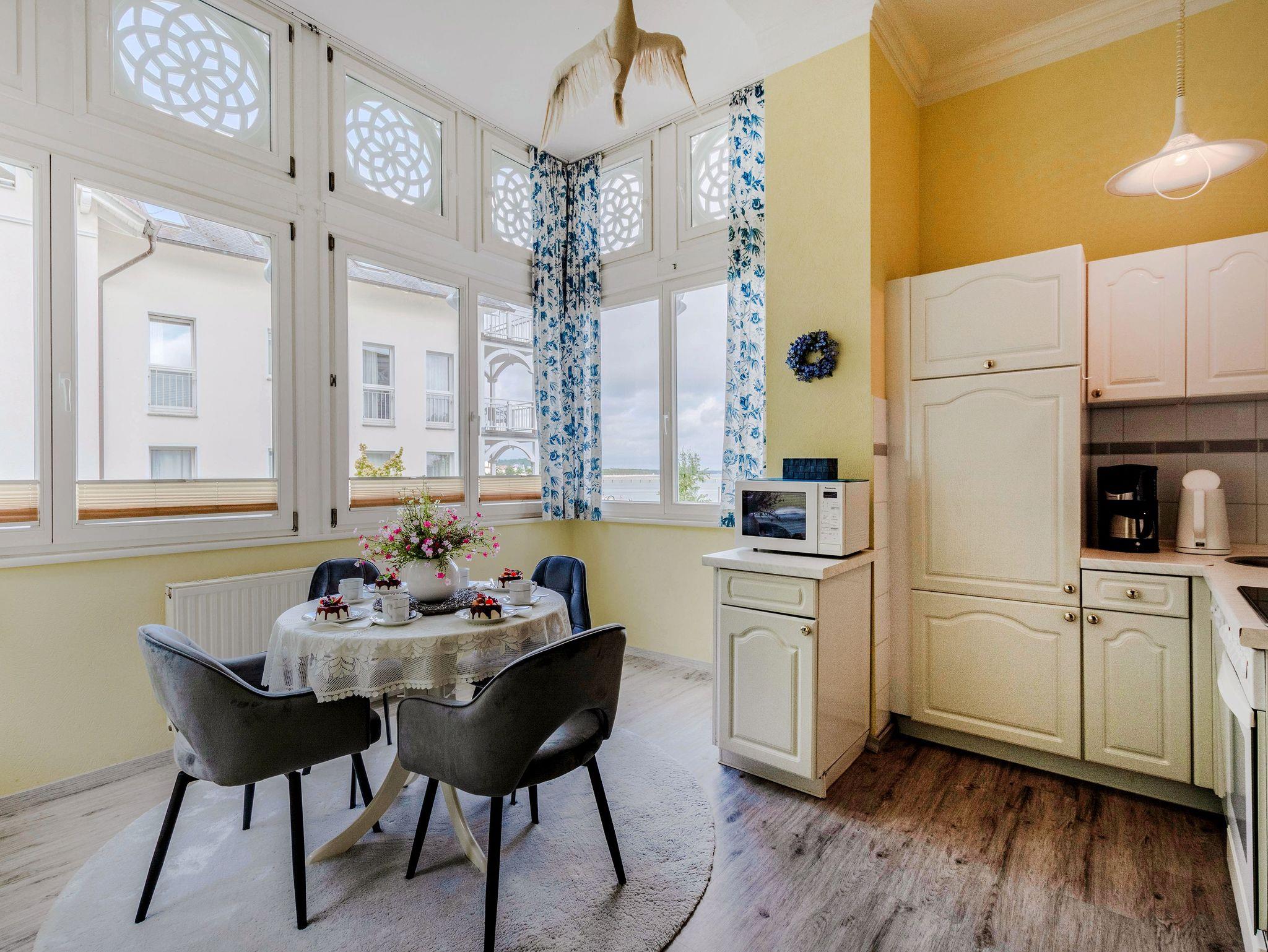 Ein lichtdurchflutetes Apartment mit wunderschönen Ostseeblick aus der Loggia (geschlossener Balkon) mit den historischen Verzierungen lädt zum idyllischen schlemmen in den gemütlichen Eßbereich ein.
