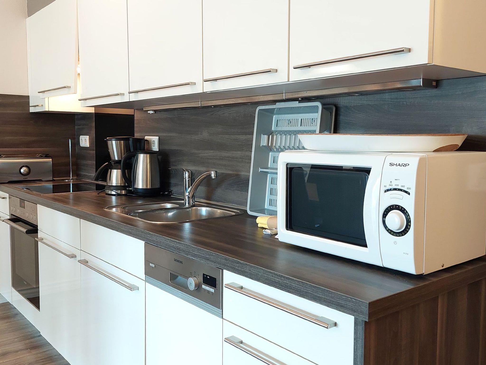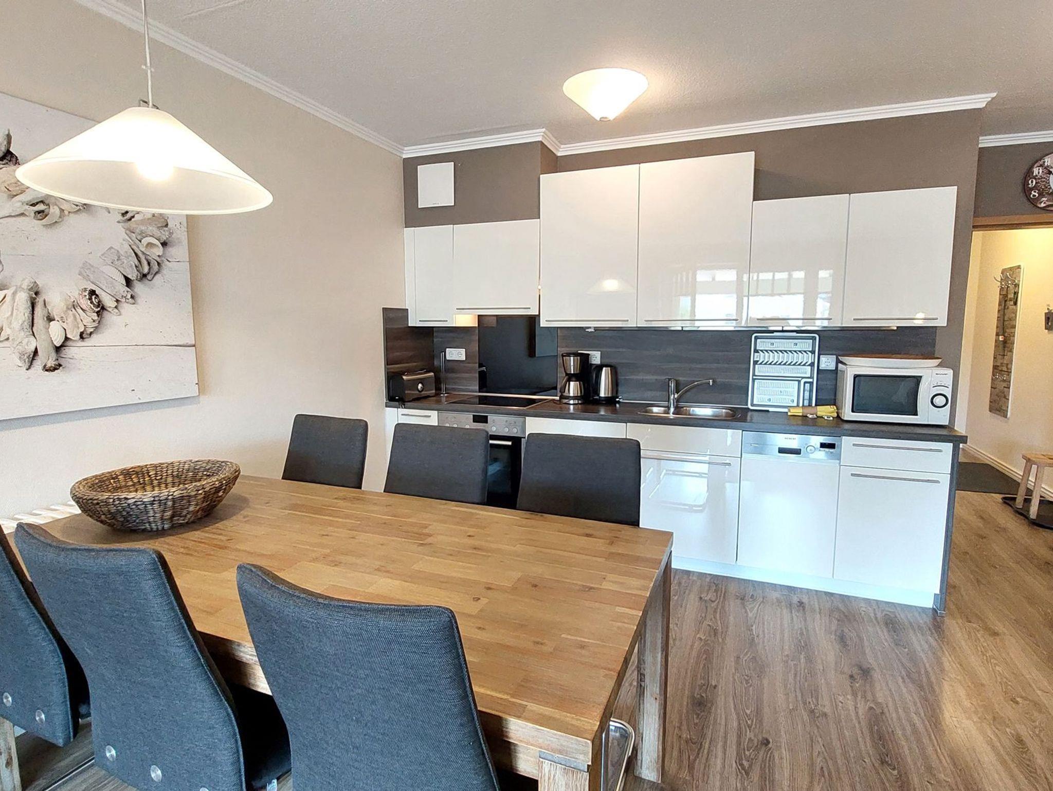 Im geräumigen Wohn- und Essbereich befindet sich eine moderne Küchenzeile mit Backofen, Ceranfeld, Geschirrspüler, Kühlschrank mit Gefrierfach, Mikrowelle und vielen nützlichen Küchenhelfern.