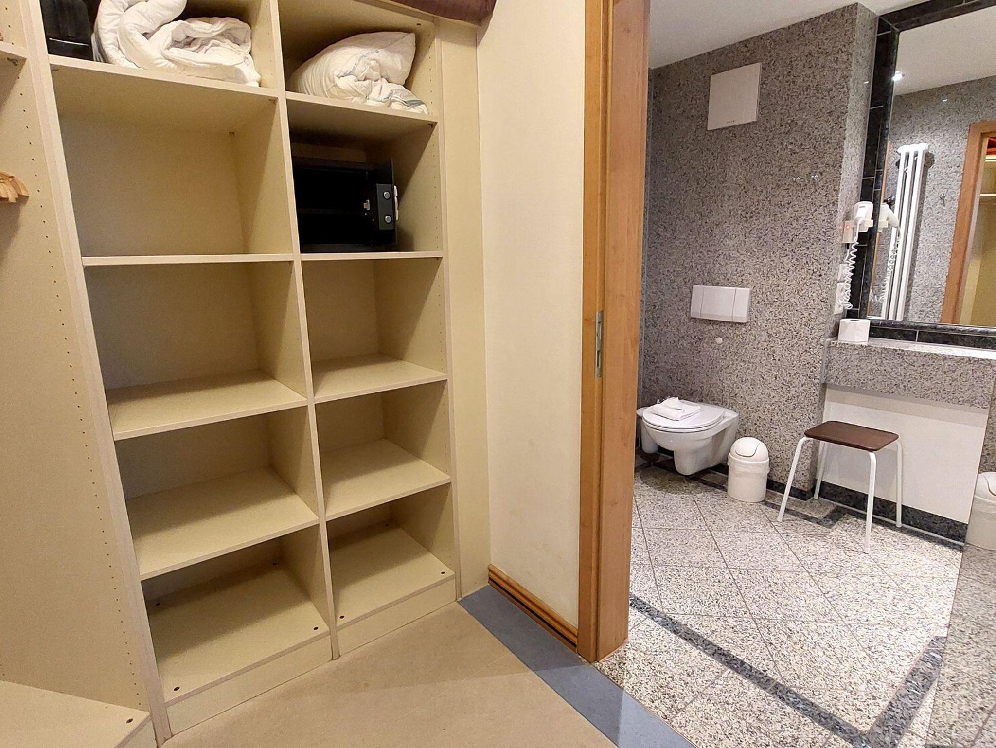Im Schlafzimmer finden Sie ein Doppelbett, eine Kommode sowie ein separates Ankleidezimmer mit Kleiderschrank, Safe und zusätzlichem Badzugang.