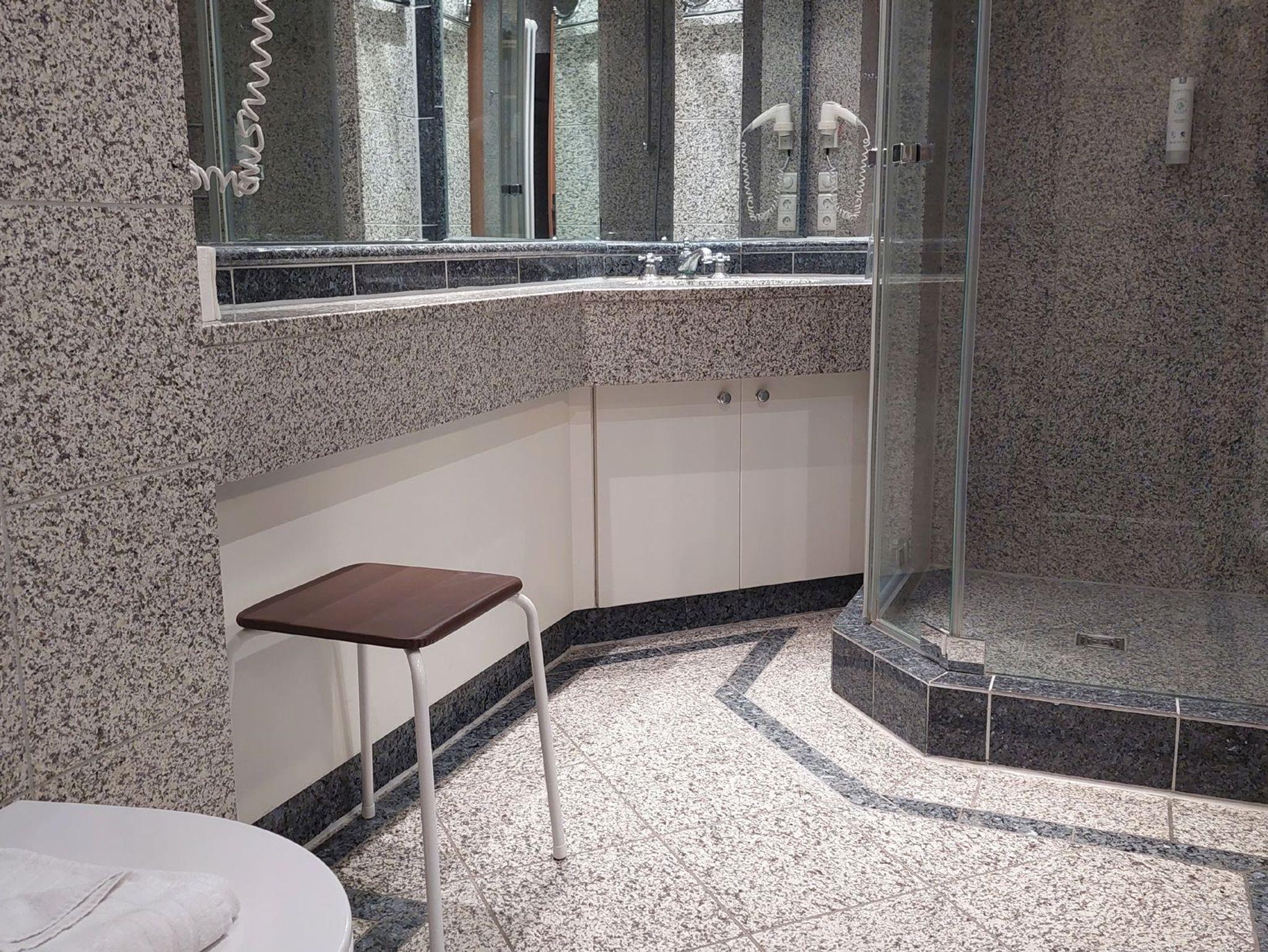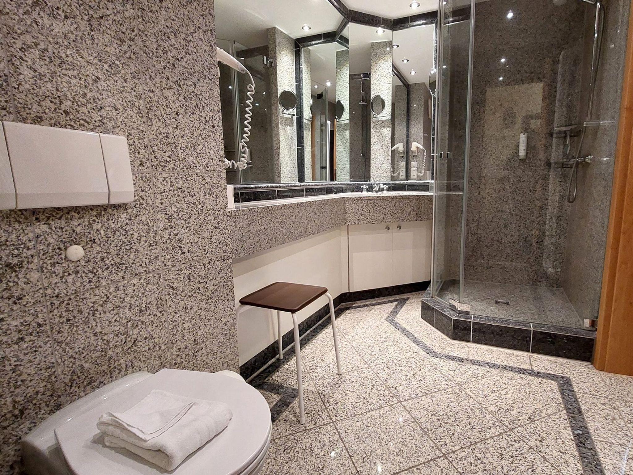 Das Bad in Marmoroptik verfügt über WC, Waschtisch, Dusche, Kosmetikspiegel und Fön.