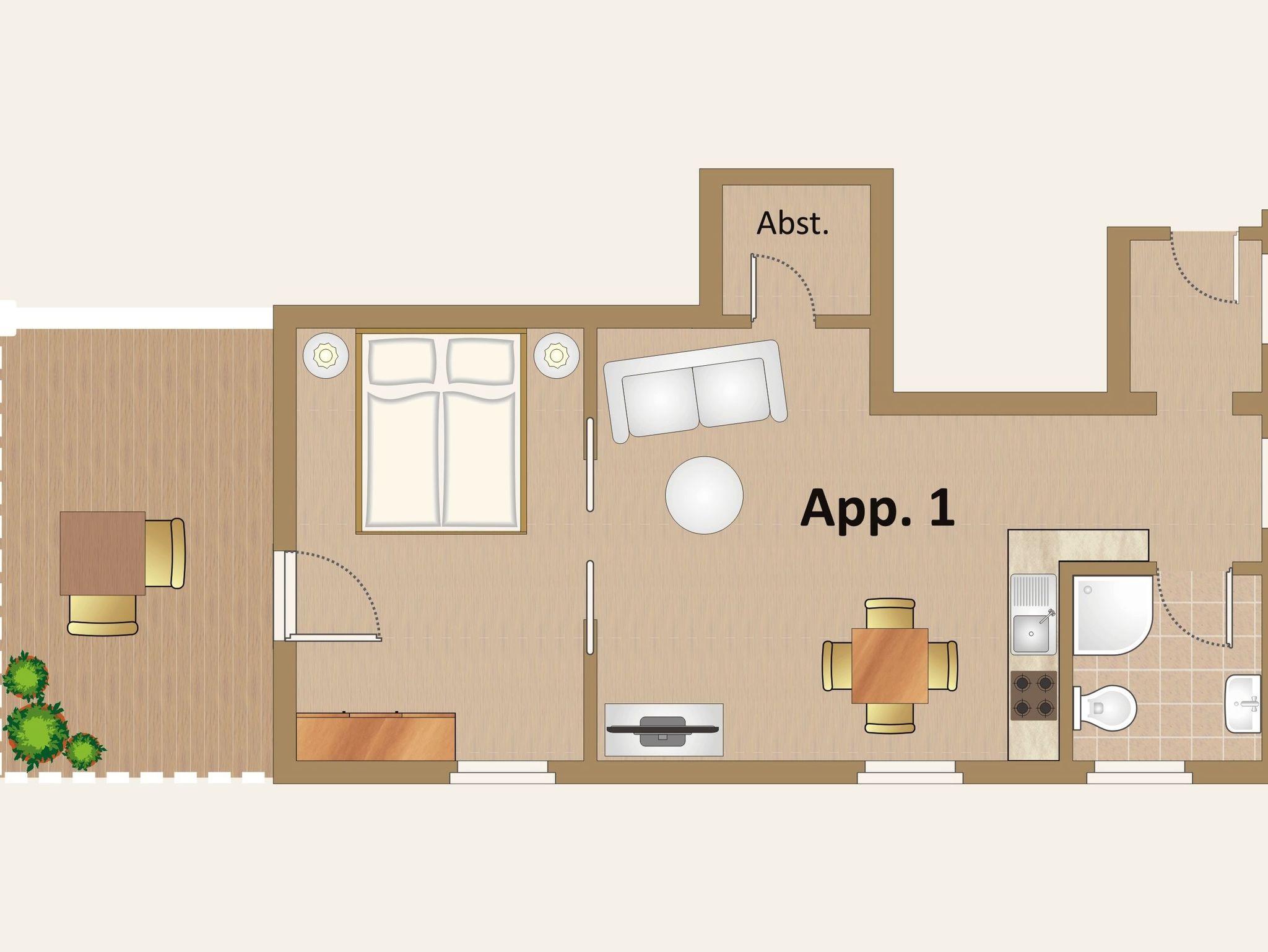 Das Appartement Nr.1 befindet sich im 1. Obergeschoss und bietet bei einer Größe von ca. 52 qm (inkl. Balkon) Platz für 2 bis 3 Personen. Es ist aufgeteilt in ein kombiniertes Wohn- und Esszimmer mit gemütlicher Sitzecke, Sat-TV und Radio. Die intergrierte Küchenzeile ist komplett ausgestattet mit Ceran-Herd, Backofen, Mikrowelle, Kühlschrank, Geschirrspülmaschine und allen möglichen Küchenutensilien. Eine separate Essecke ist ebenso vorhanden. Im Schlafzimmer befinden sich ein Doppelbett und ein großer Kleiderschrank. Das Bad ist ausgestattet mit Dusche und WC.