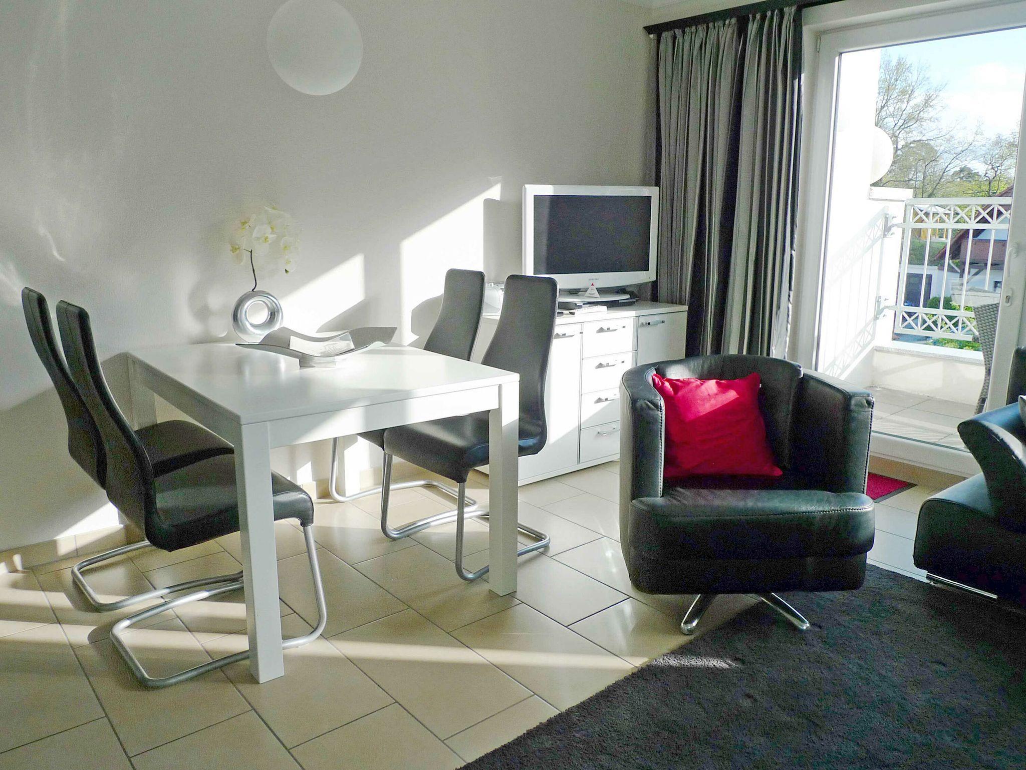 Dieses 58 m² große und exklusiv eingerichtete 3-Raum-Appartement Meeresbrise befindet sich im 1. Obergeschoss des zweistöckigen Hauses und hat einen 8 m² großen möblierten Süd-Balkon, der vom Wohnzimmer aus zu betreten ist.