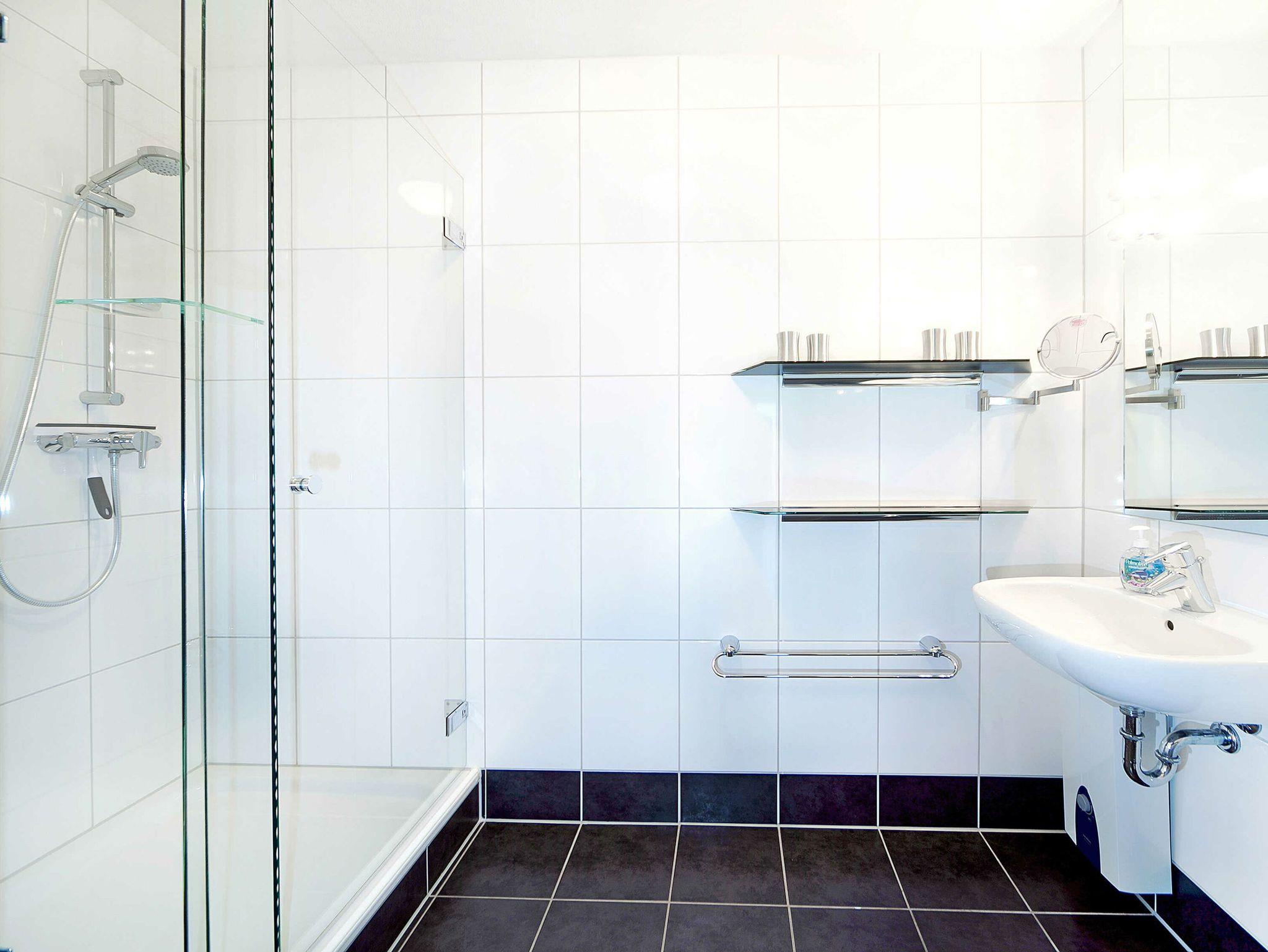 Das Appartement ist mit einem modernen Duschbad mit Handtuchheizung, Fön und Schminkspiegel ausgestattet. Ein Kinderhochstuhl sowie Bügeleisen und Bügelbrett stehen kostenfrei zur Verfügung.