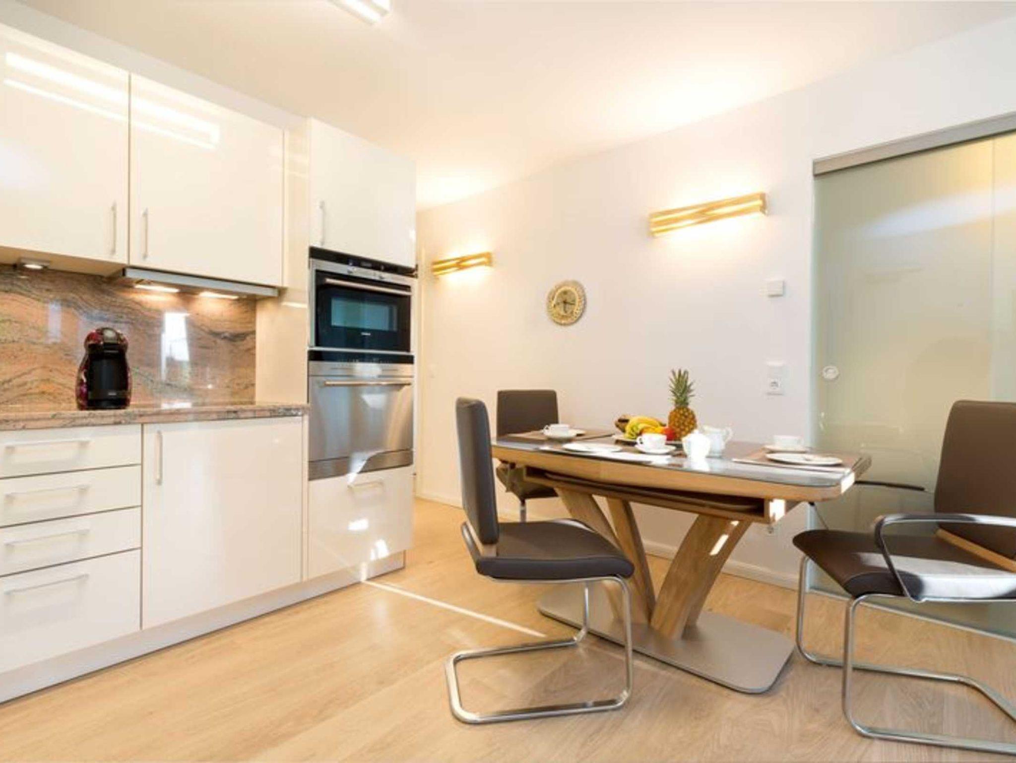 Küche mit Cerankochfeld, Mikrowelle und Geschirrspüler,