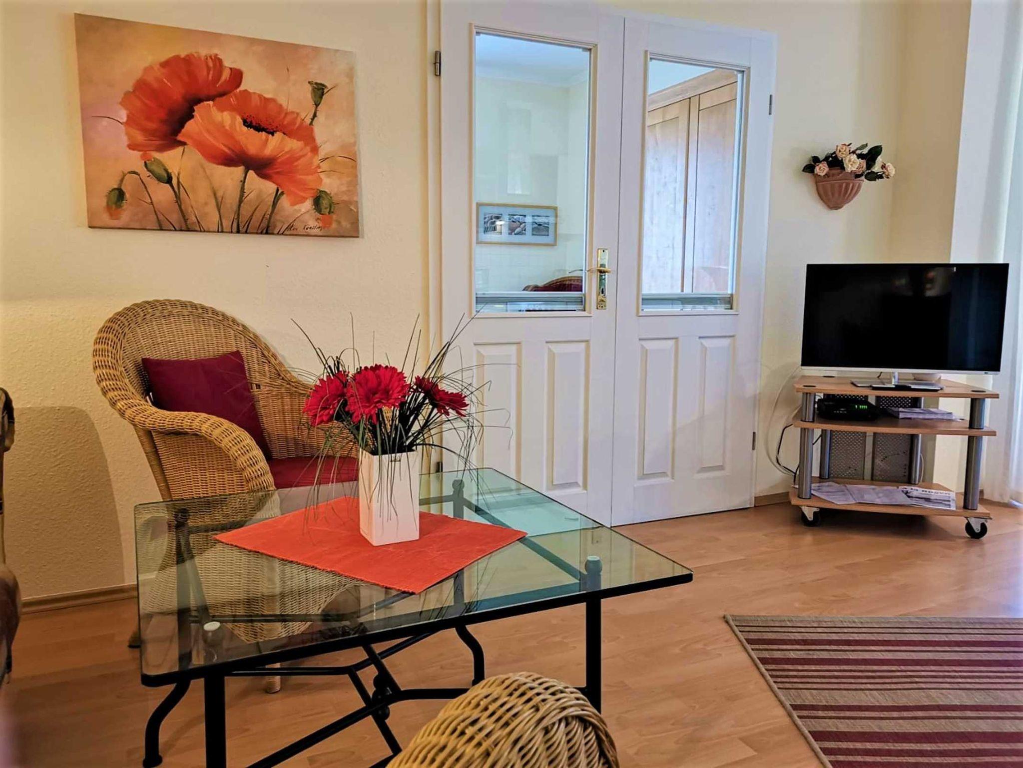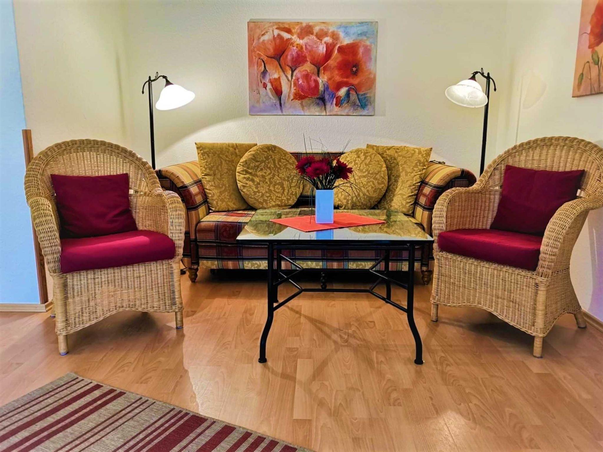 Das Appartement im 1.OG ist mit viel Liebe zum Detail eingerichtet und bis 4 Personen belegbar. 1. Schlafraum mit Doppelbett, Kleiderschrank und Balkon, 2. Schlafraum mit Schlafliege, Schrank , gemütlicher Lesecke sowie mit Balkon ausgestattet. Die Küche offen zum Wohnbereich verfügt über Ceranfeld, Minibackofen, Mikrowelle und diversen Kleingeräten sowie über einen grosszügiger Essbereich und zusätzliche Schlafcouch.