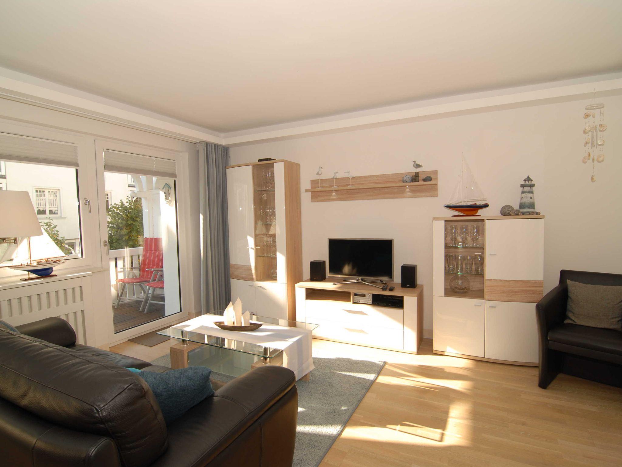 Das stilvoll maritim ausgestattete 3-Zimmer-Appartement hat eine Größe von 84 qm und befindet sich im 1. Obergeschoss. Es ist auch mit einem Fahrstuhl erreichbar. Alle Räume verfügen über Eichenparkett bzw. Marmorfußböden. Die Fenster sind mit Plissees, die Decken mit modernen Lichtleisten versehen.