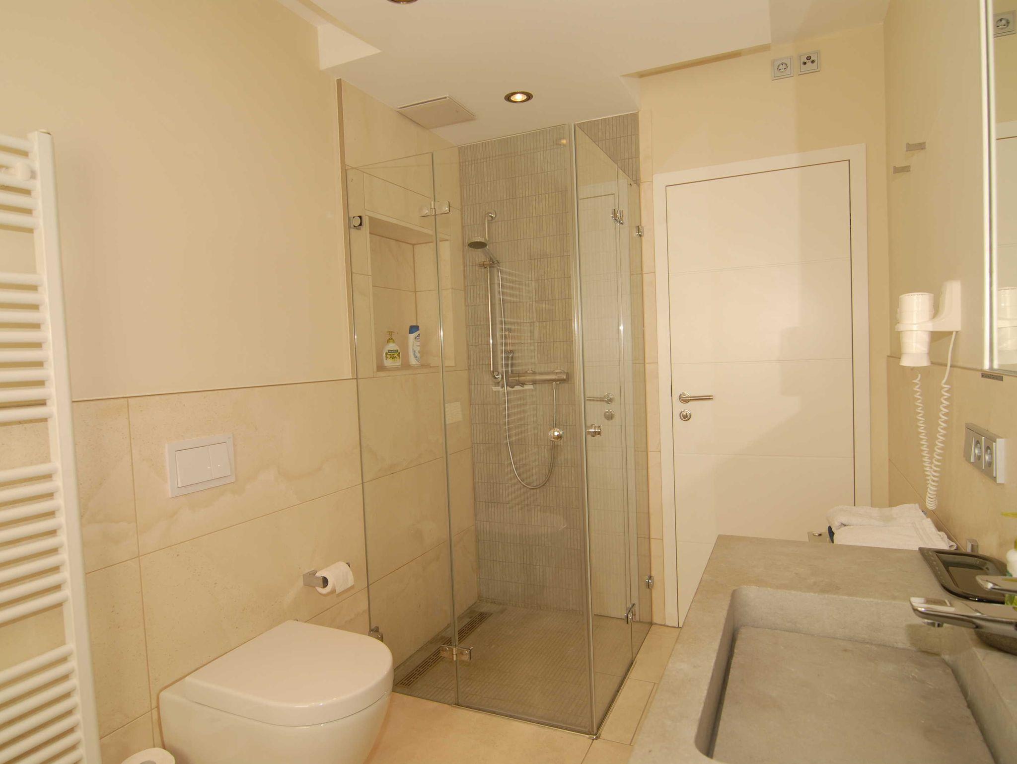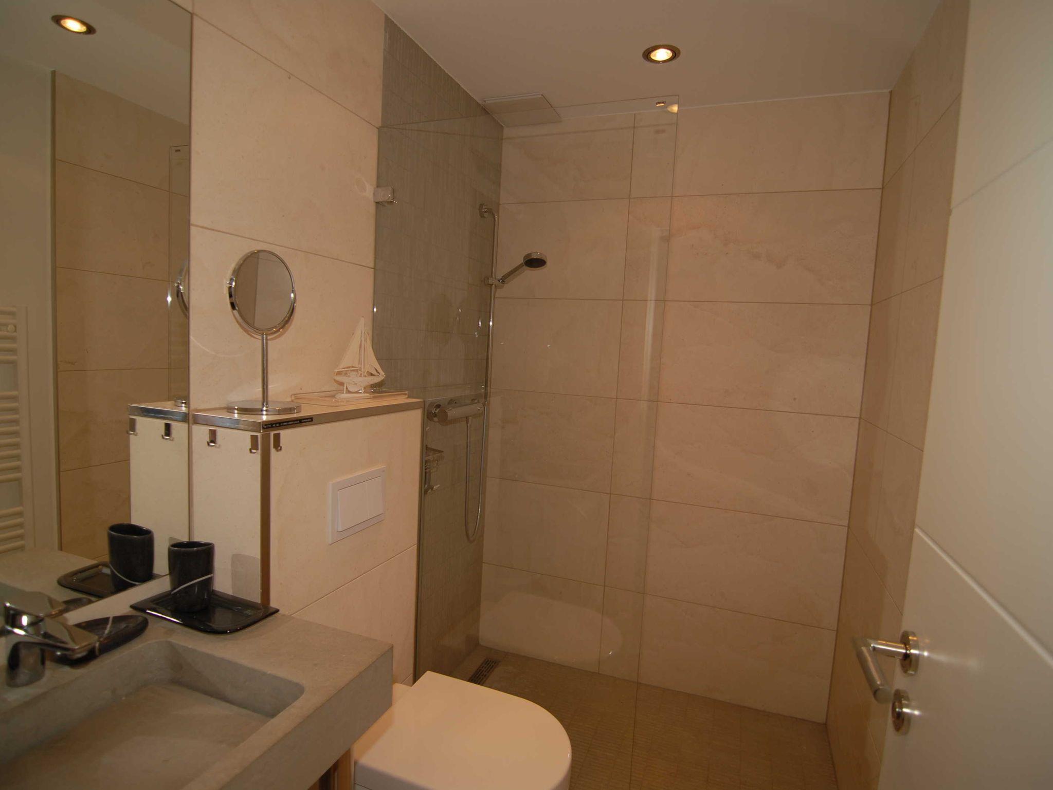 Die beiden Bäder sind mit Marmorfliesen und Natursteinwaschbecken, WC, geräumigen Duschen, Fußboden- und Handtuchheizung und Haartrocknern ausgestattet, das Masterbad zusätzlich mit einer Badewanne.