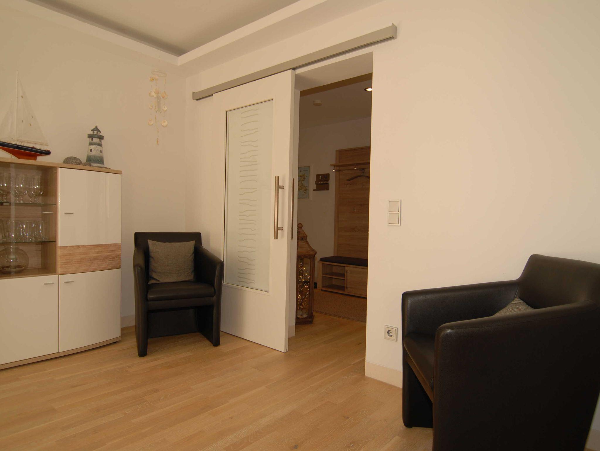 Das lichtdurchflutete Wohnzimmer schafft mit seiner Ledergarnitur und der Schrankwand eine freilassende Atmosphäre zum Wohlfühlen. Es bietet SMART-TV, DVD- Player, Stereoanlage (Radio, CD, MP3 über USB) und einen schnellen kostenlosen Internetzugang über WLAN.