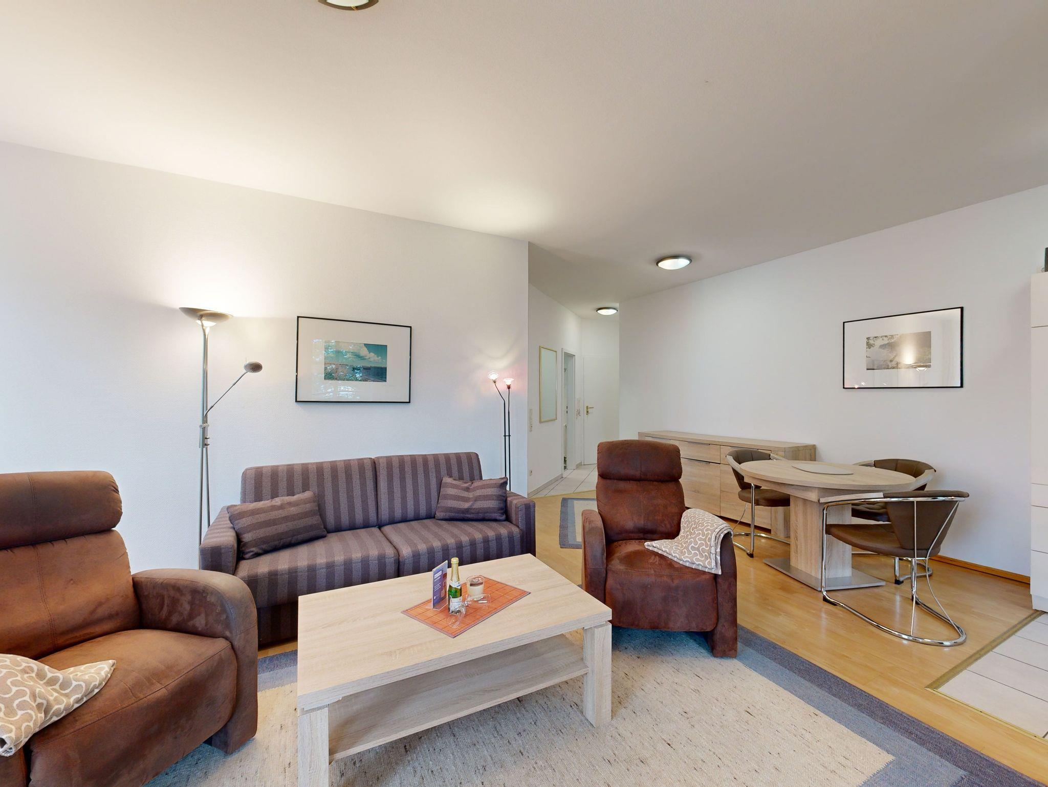 * Wohnzimmer: Couchgarnitur (Schlafgelegenheit für 2 Personen), Kabel-TV, Radio mit CD, Essplatz, W-LAN-Internetanschluss