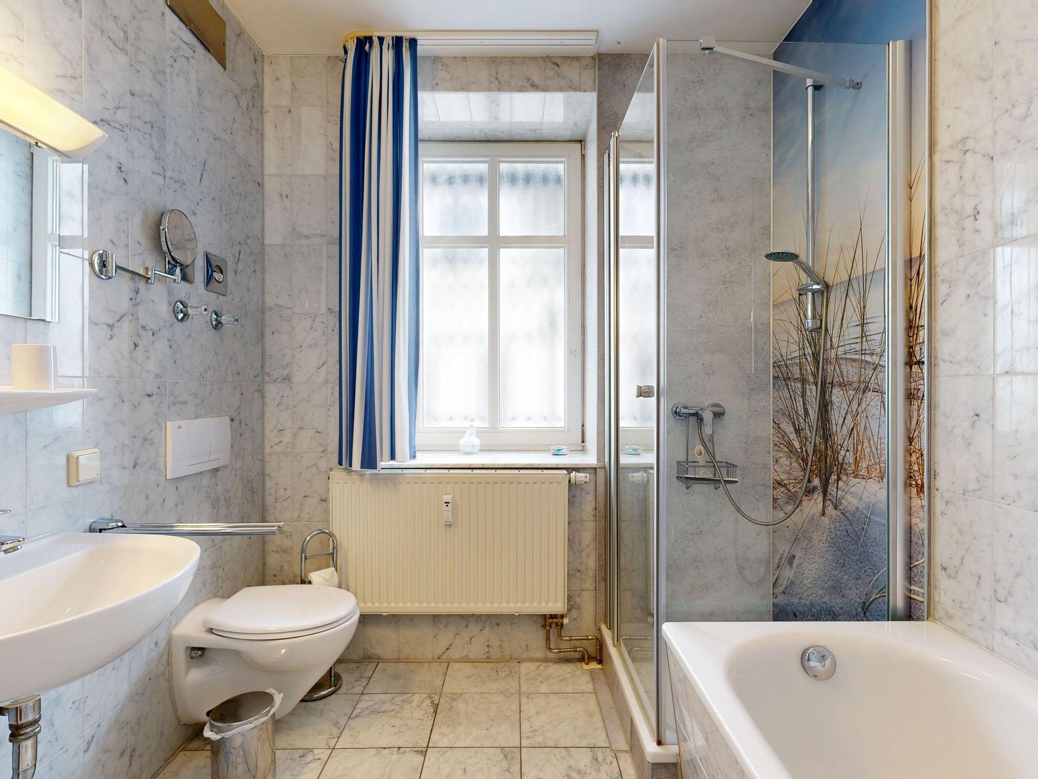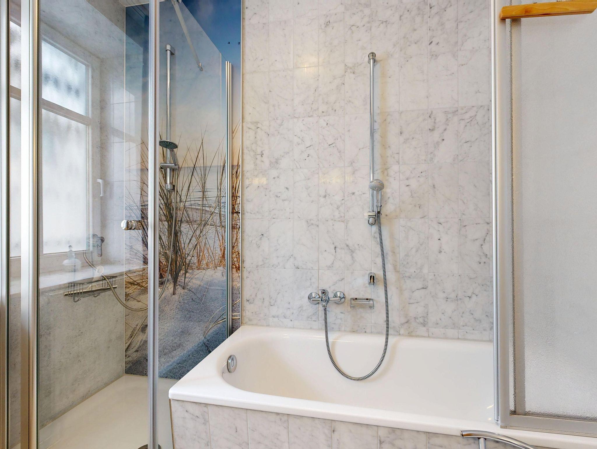 1 Badezimmer mit Wanne, Dusche, WC und Föhn