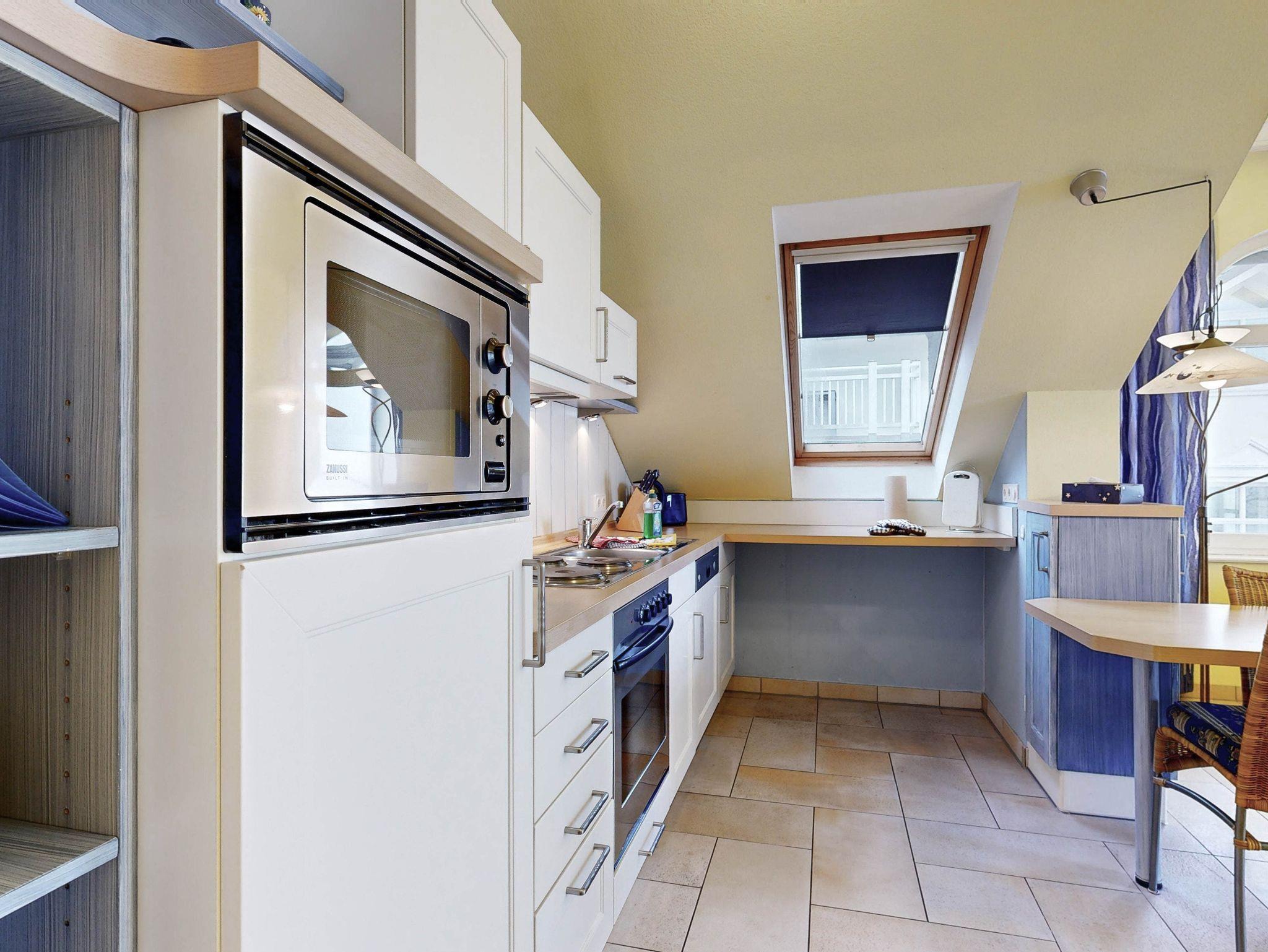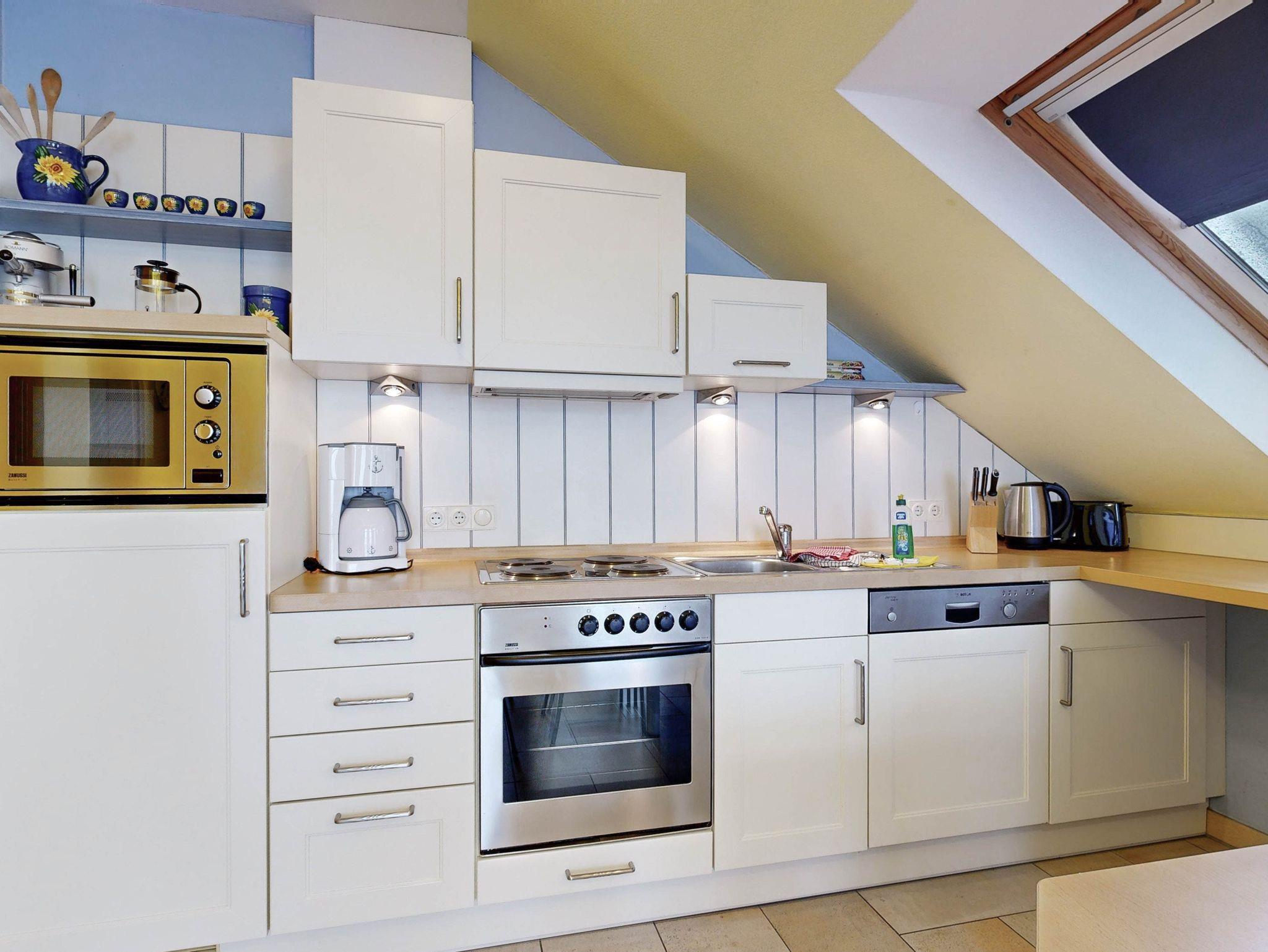? Küche: Moderne Küchenzeile mit Spülmaschine, E-Herd mit Backofen, Mikrowelle, Essplatz, Wasserkocher, Kaffeemaschine, Toaster