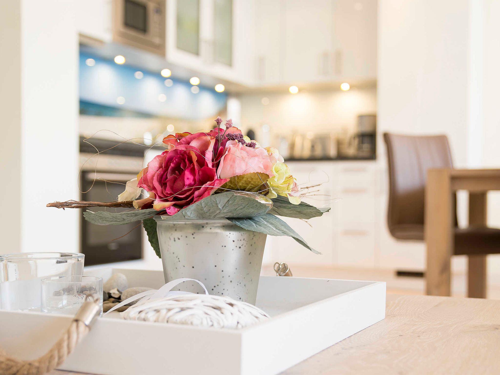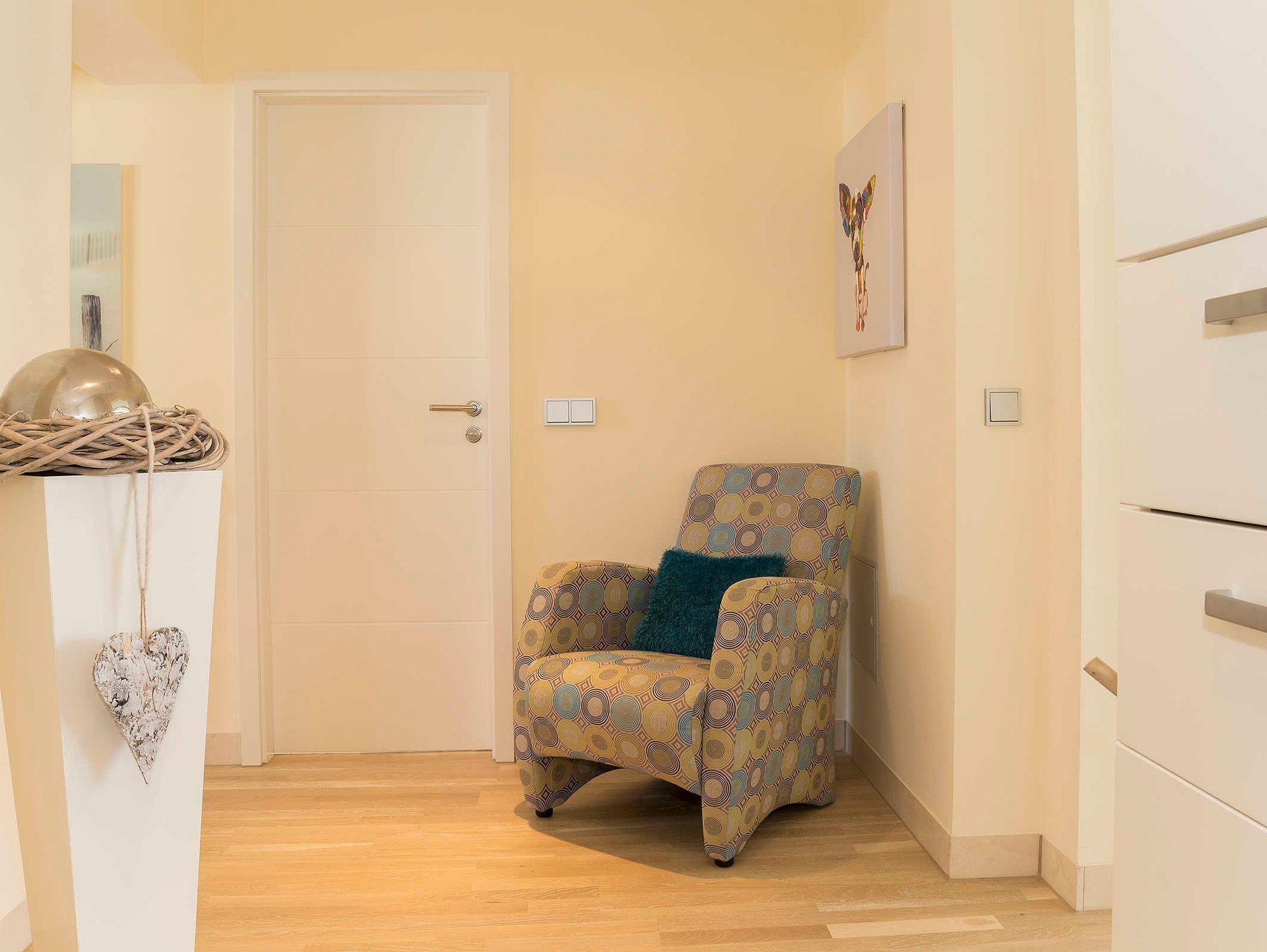 Ein großer Eingangsbereich, großzügiger, heller Wohnraum mit Sitzbereich, offener Küche und Essbereich. Es besteht ein Südbalkon vom 3m² mit Sitzgelegenheit und Strandkorb zum Sonnen.