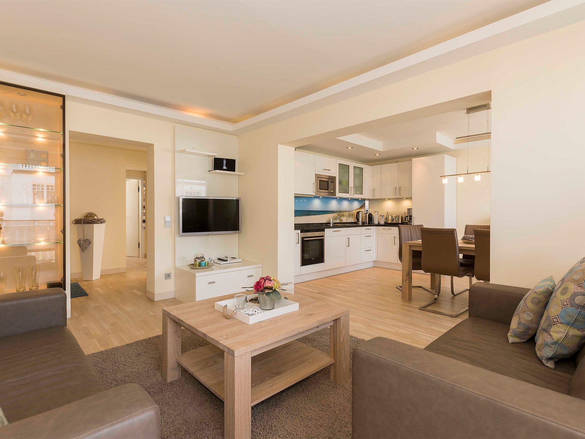Die integrierte Küchenzeile ist mit Backofen,Cerankochfeld, Geschirrspüler, Kühlschrank und Gefrierschrank ausgestattet. Die komfortablen, modernen Sofa´s im Wohnraum können bequem als Schlafgelegenheit für eine 5.+6. Person genutzt werden.