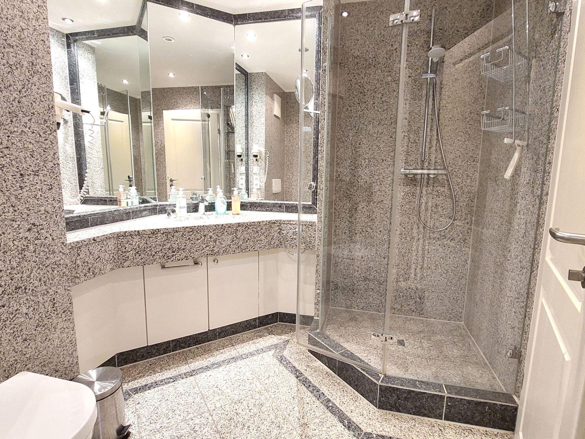 Das Badezimmer im Mamoroptik verfügt über einen großen Waschtisch, WC und eine Dusche.