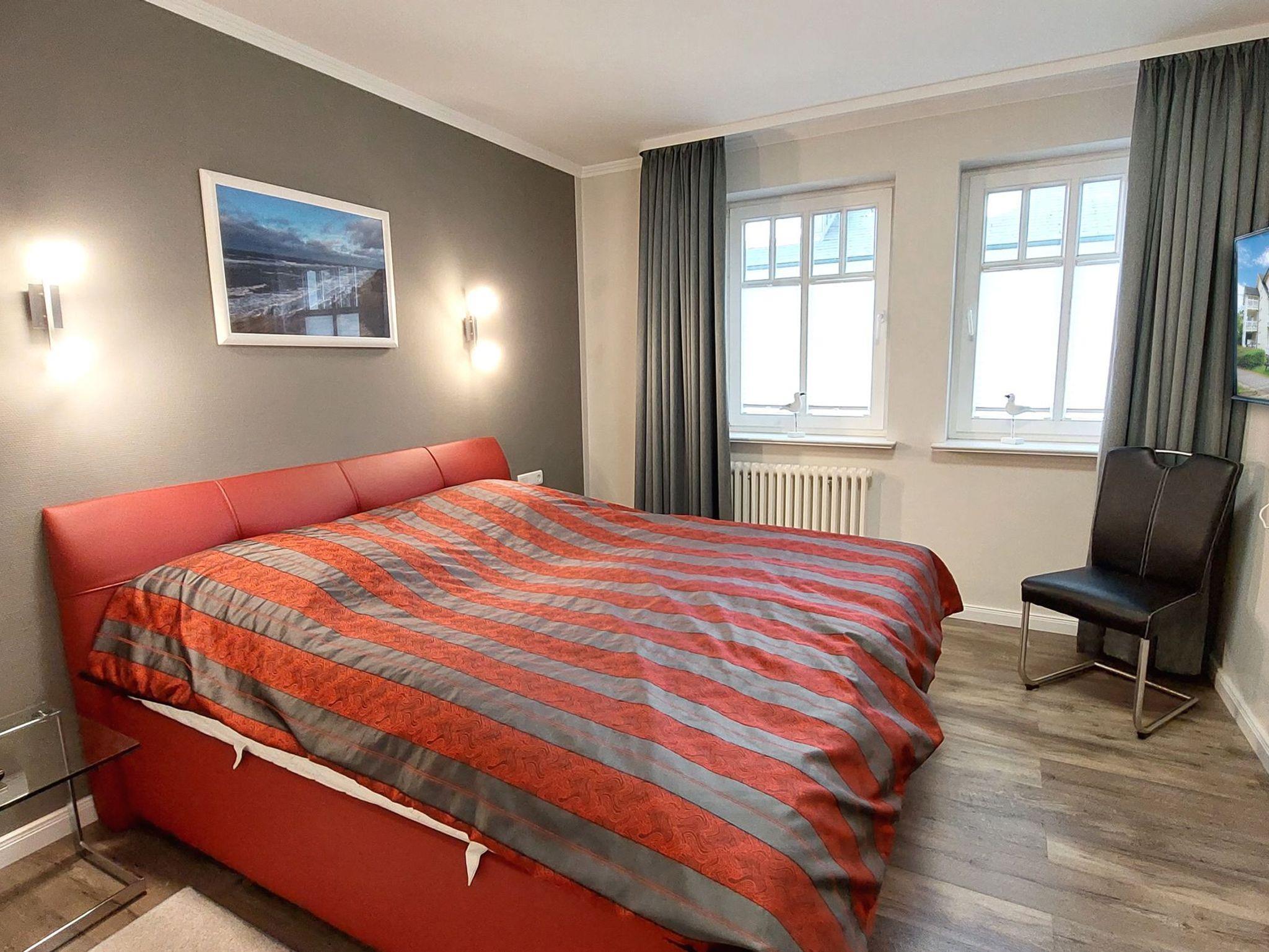 Das Schlafzimmer verfügt über ein Doppelbett mit Nachttischen sowie einen Smart-TV.