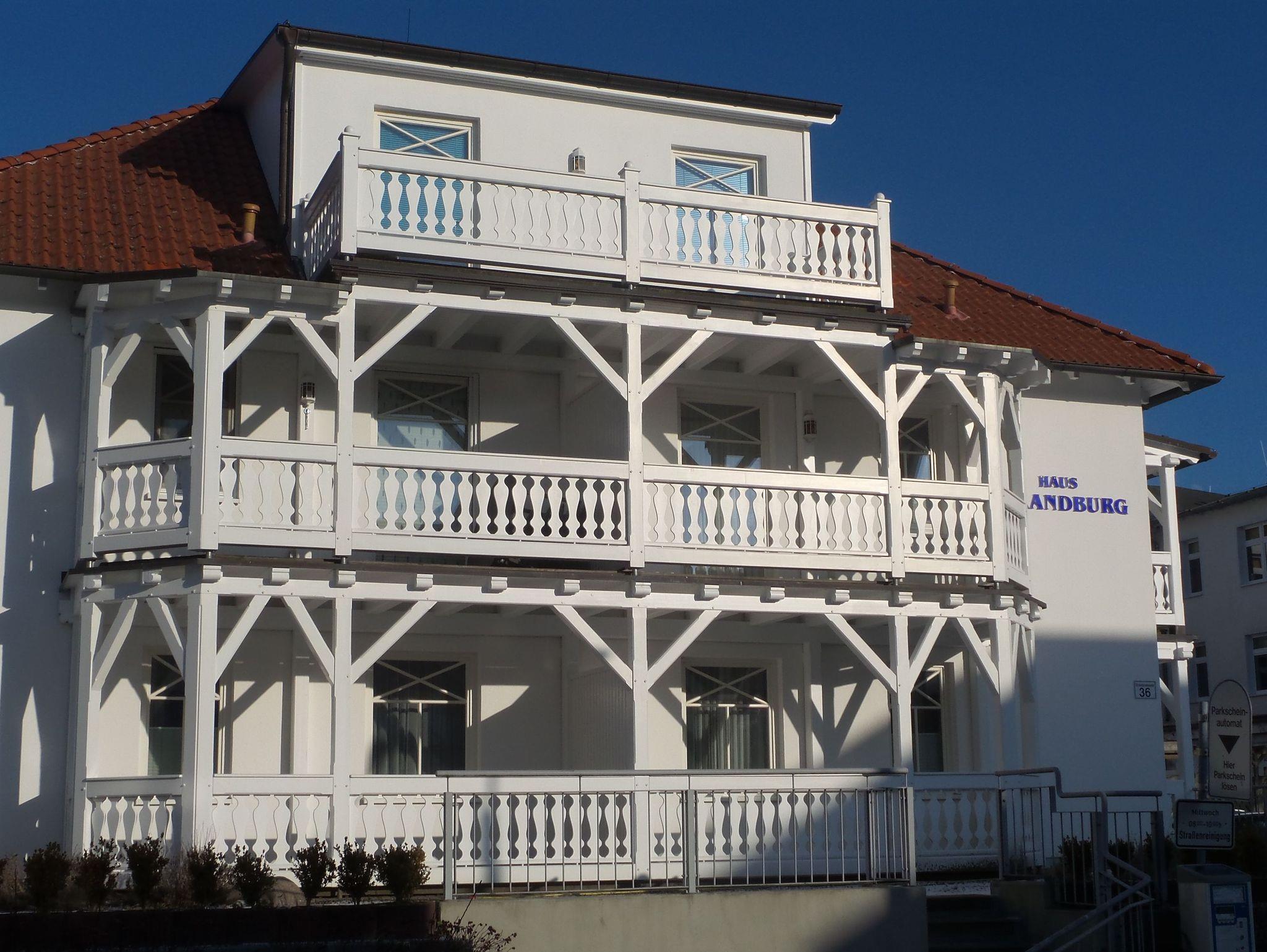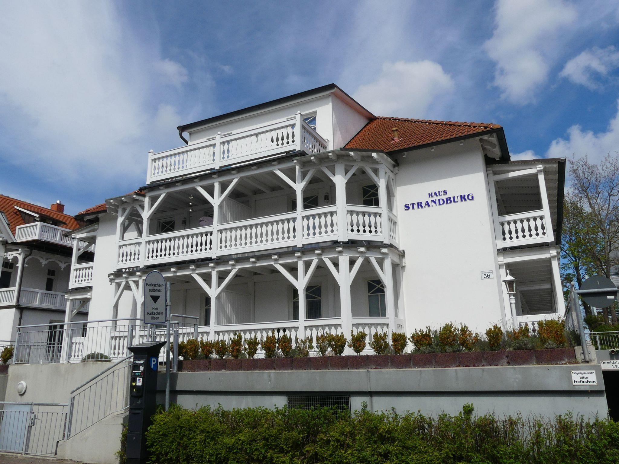 In der in Bäderarchitektur renovierten Villa Strandburg in Binz direkt an der Strandpromenade vermieten wir zwei sehr gut gelegene Wohnungen. Die Wohnung befindet sich in dem dahinter liegenden Appartementhaus (kein Fahrstuhl). Tiefgarage (Einfahrtshöhe 1,95 m, Breite der Einfahrt 2,70 m), Sauna (Gebühr), sowie Münzwaschmaschine und -trockner (Gebühr) im Haus. Haustiere sind nicht erlaubt.