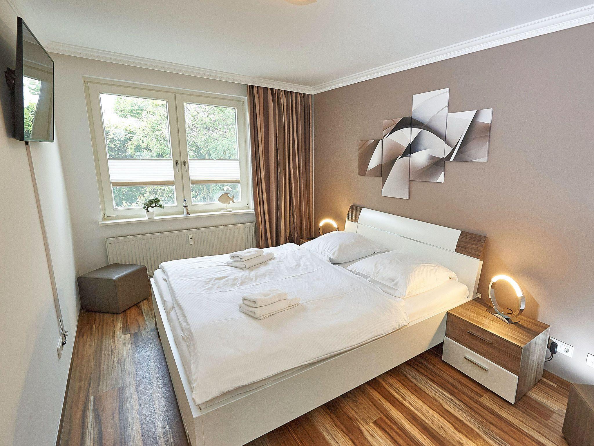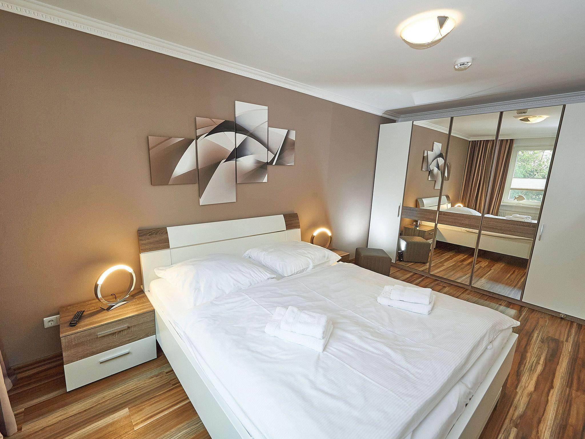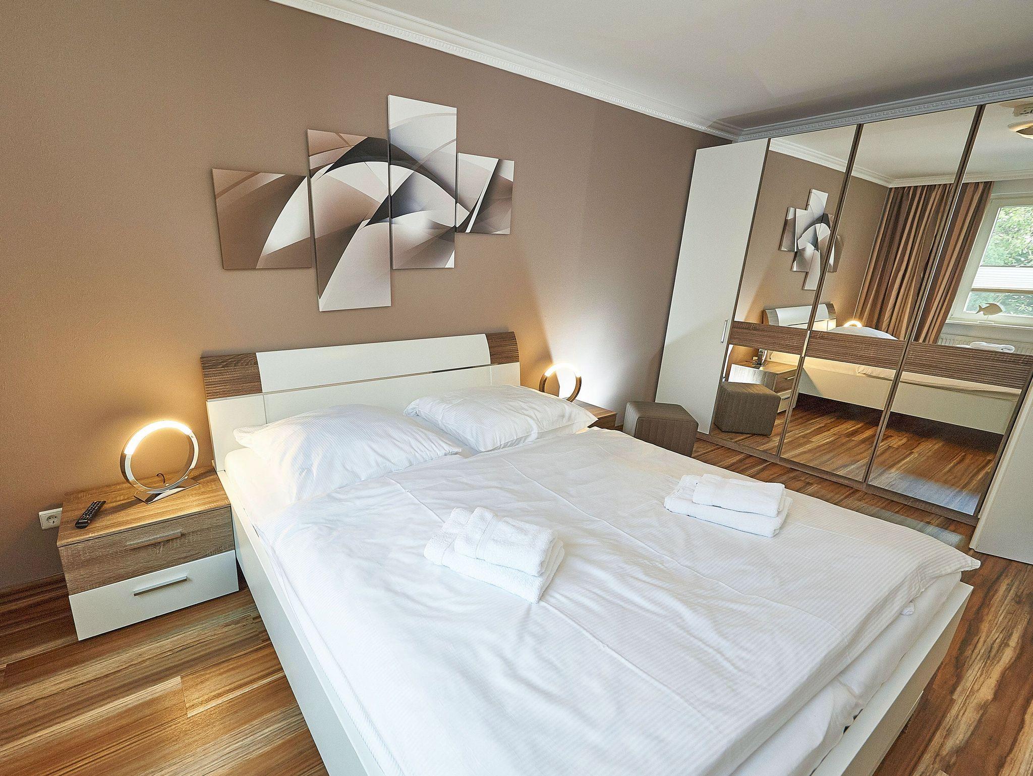 Im Schlafzimmer befinden sich ein Doppelbett (2 x 90 x 200 cm), ein großer Kleiderschrank und ein zusätzlicher Flachbild-TV.