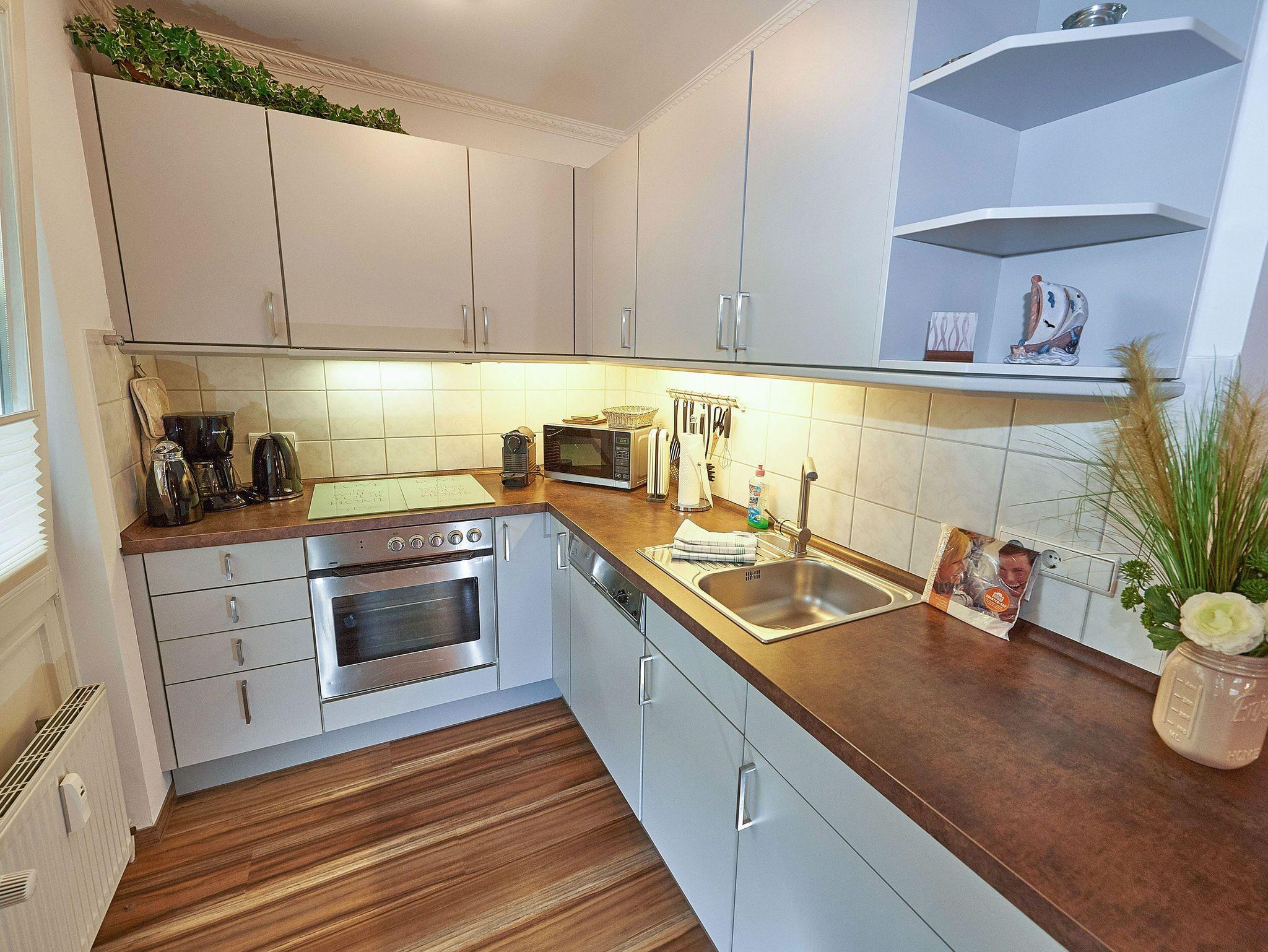 Die Küchenzeile ist in den Wohnbereich integriert. Hier finden Sie einen Kühlschrank mit Gefrierfach, eine Spülmaschine, eine Mikrowelle, eine Kaffeemaschine, einen NESPRESSO-Automat, einen Toaster, Backofen, 4-Platten-Ceranfeld sowie einen Wasserkocher und diverses Kleininventar, welches die Küchenausstattung komplettiert.