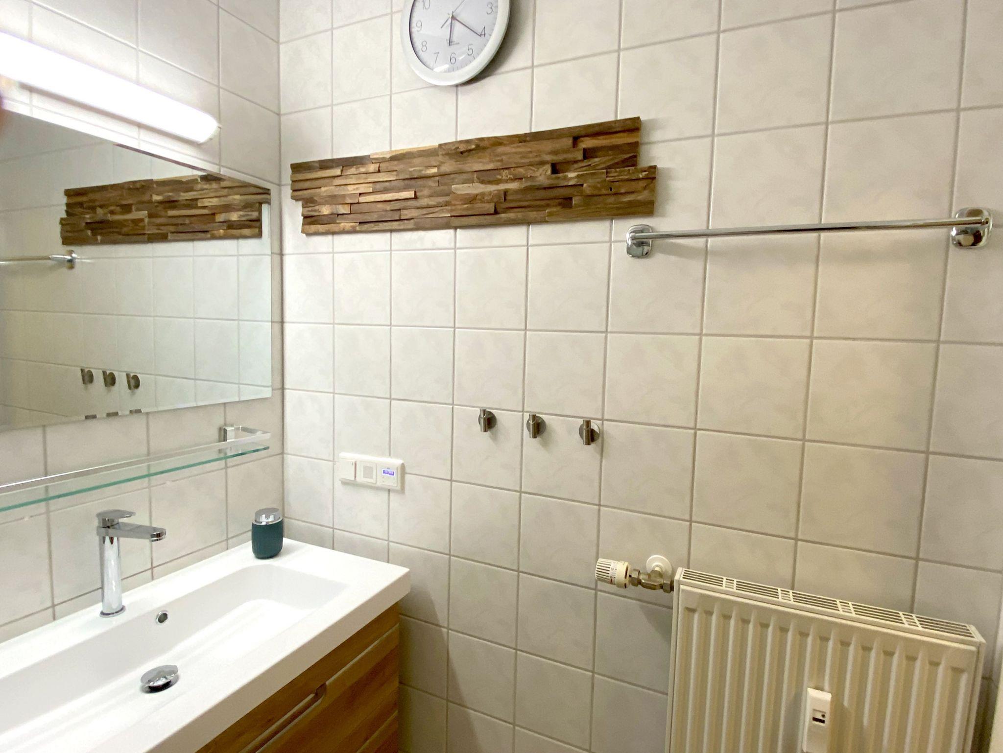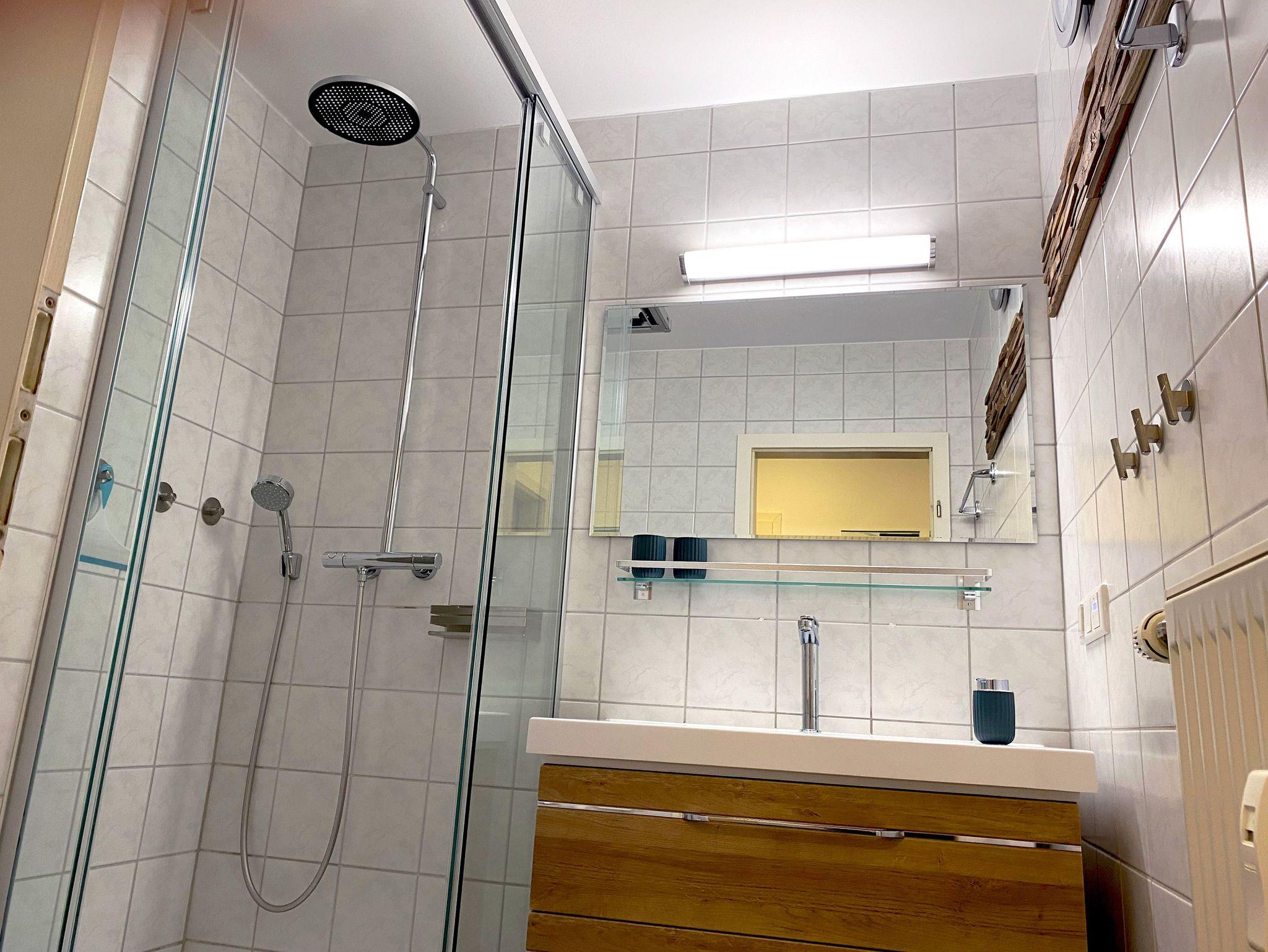 Das Appartement verfügt über ein modernes Duschbad, ausgestattet mit Regendusche, WC, Waschtisch, Kosmetikspiegel, Fön und Radio. Ein Safe für Ihre Wertsachen, ein Bügeleisen mit Bügelbrett, ein Kinderhochstuhl, Bücher, diverse DVD´s und Gesellschaftsspiele sowie ein Staubsauger gehören zur Ausstattung dazu.