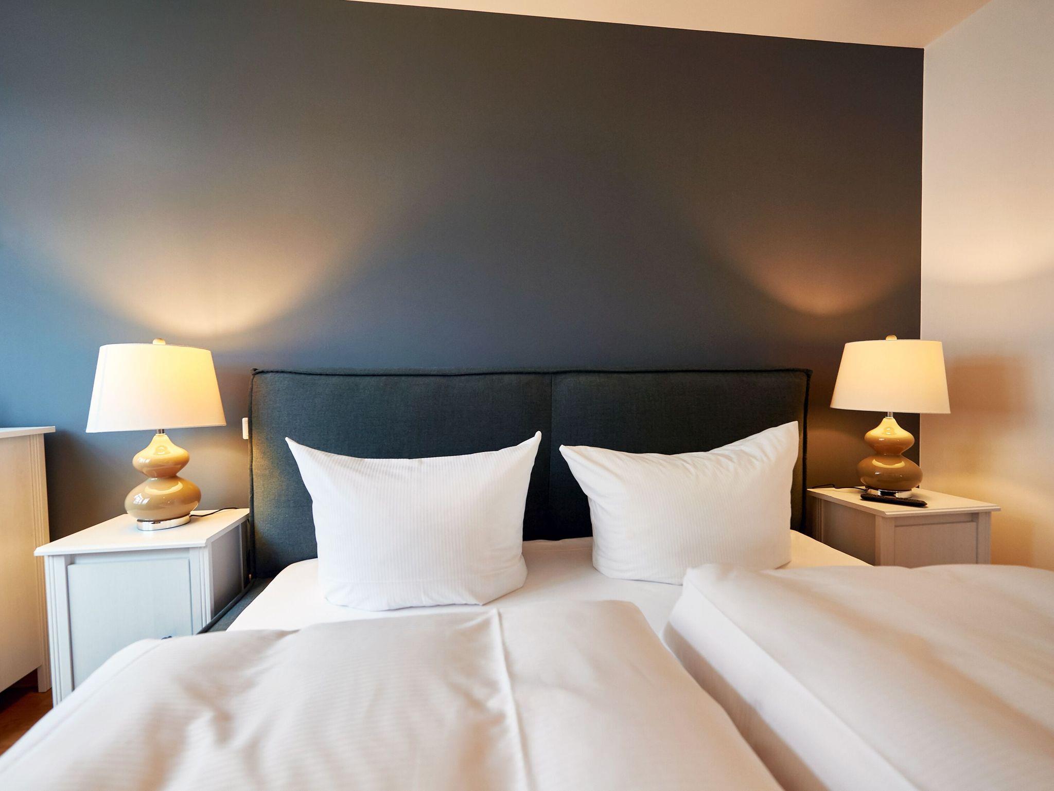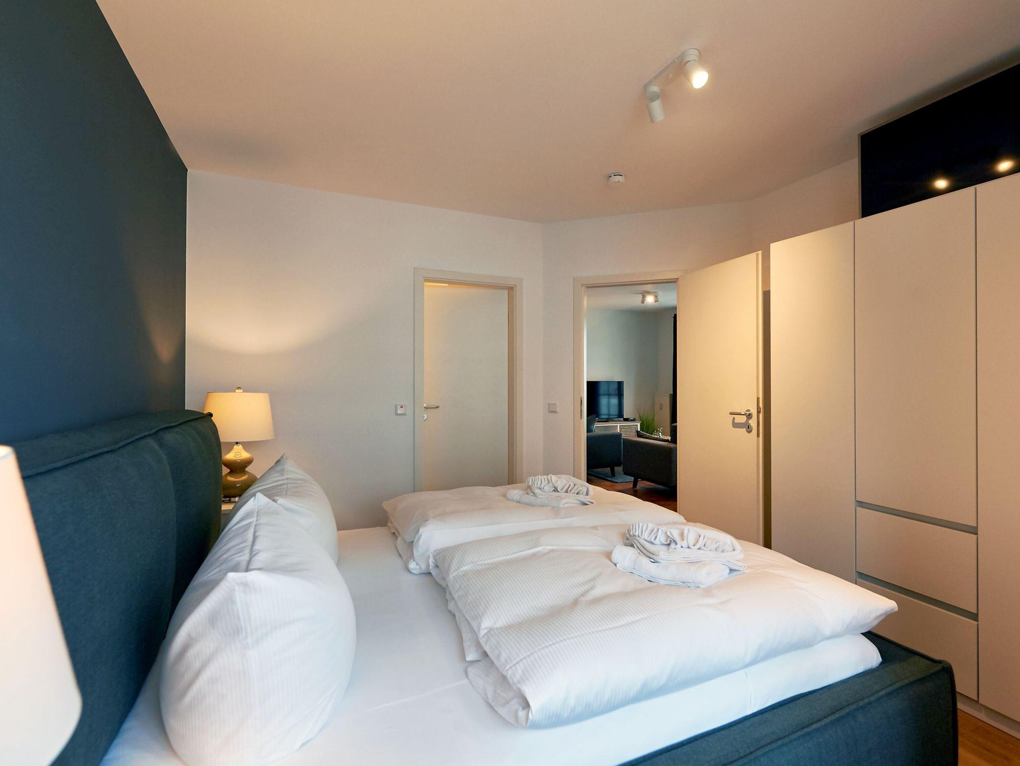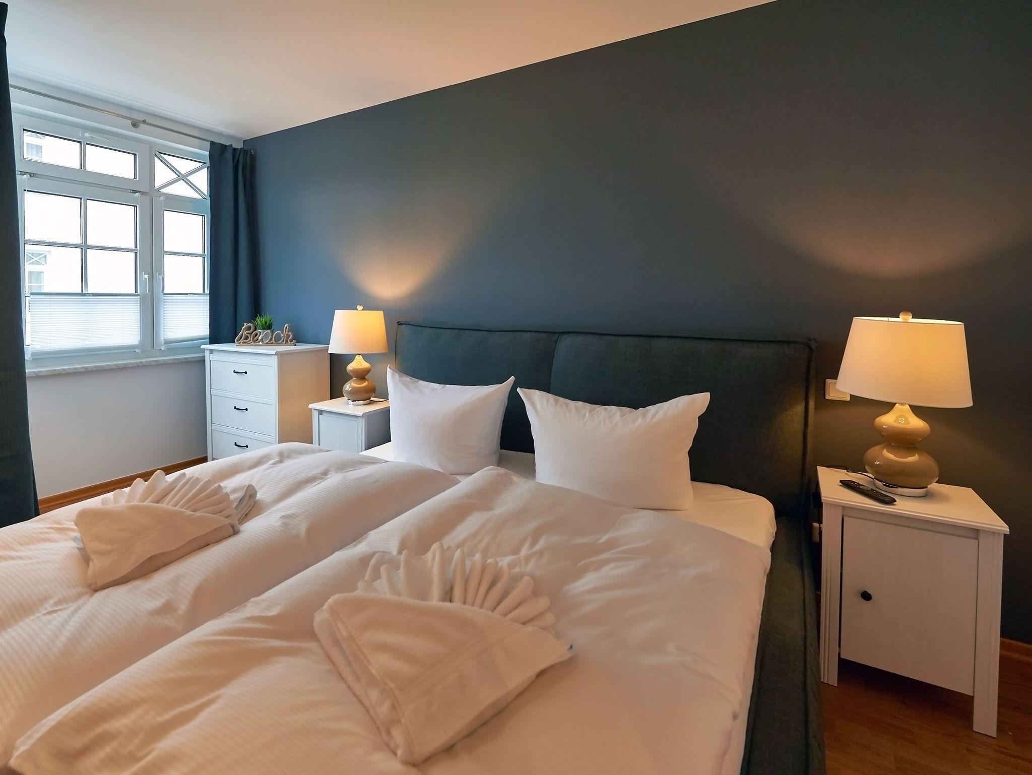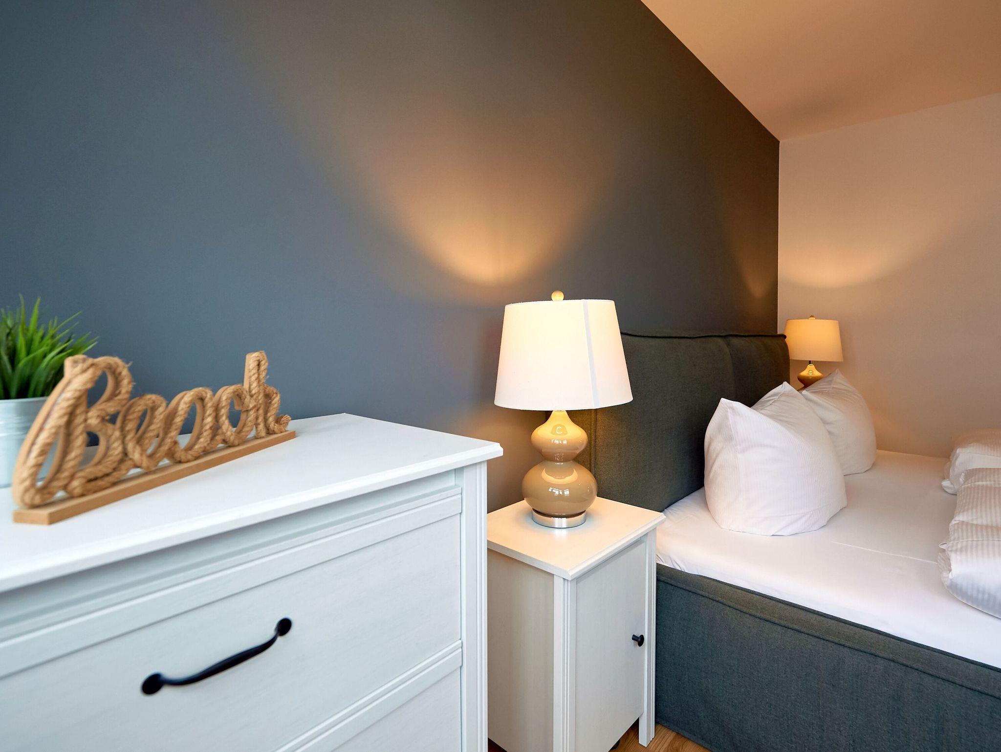 Das separate Schlafzimmer Ihrer Unterkunft verwöhnt Sie mit einem 1,80 x 2,00 m großen und sehr bequemen Doppelbett und einem zweiten Fernsehgerät. Die Fenster lassen sich selbstverständlich verdunkeln, so dass Langschläfer am frühen Morgen nicht von der Sonne geweckt werden. Ihre Urlaubsgarderobe findet im Kleiderschrank und weiteren Staufächern ausreichend Platz.