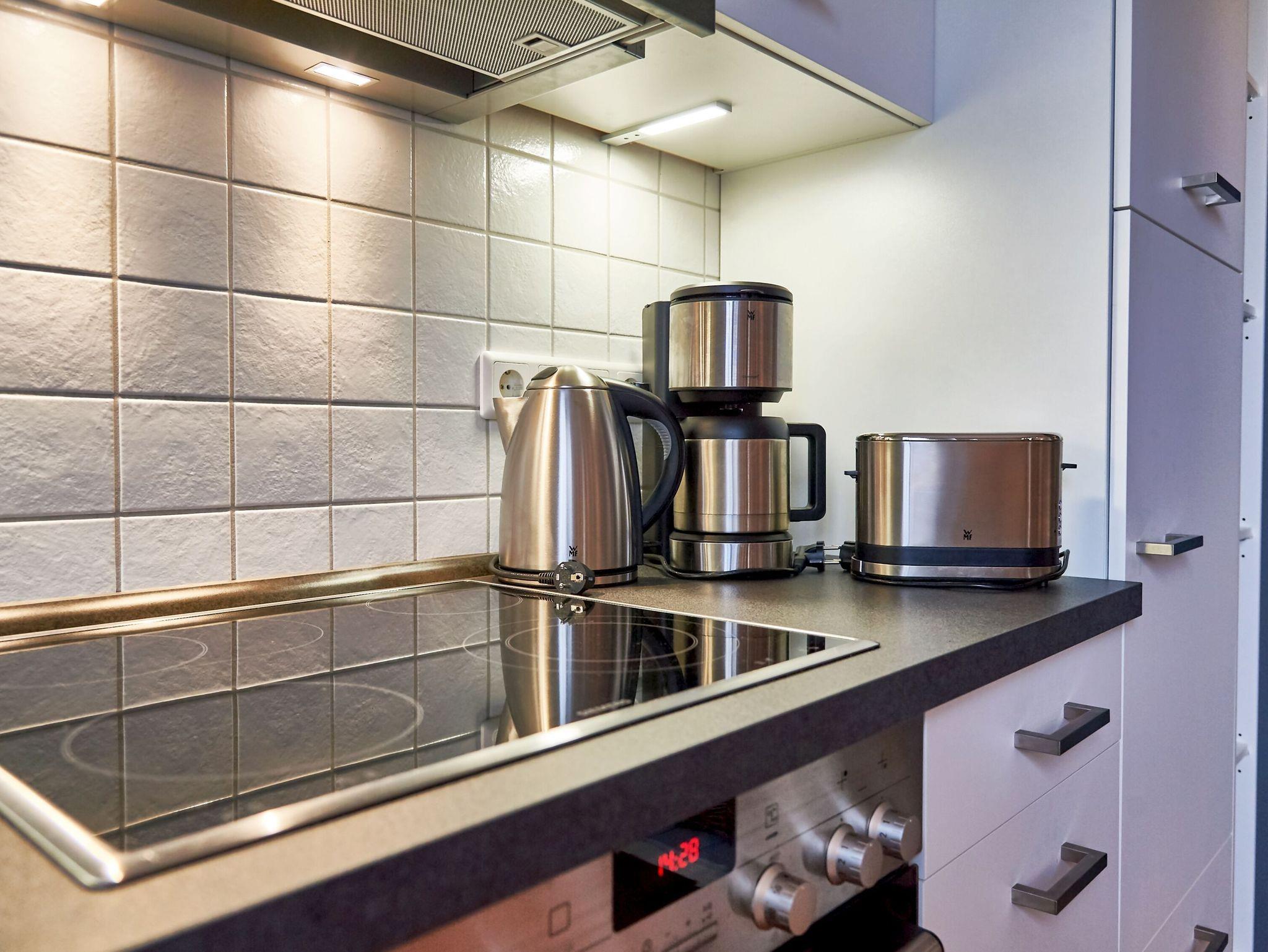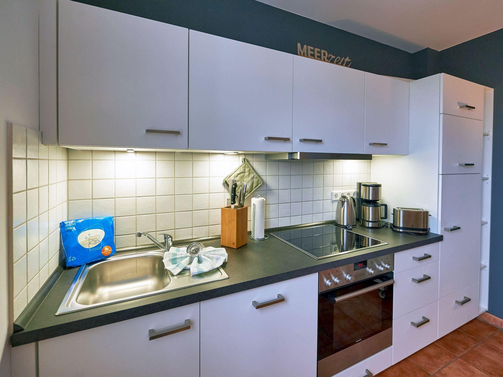 Die moderne Einbauküche ist mit einem 4-Zonen-Ceranherd inkl. Backofen und Abzugshaube, einem Kühlschrank mit Gefrierfach, einem Geschirrspüler, einer Mikrowelle sowie Kaffeemaschine, Wasserkocher und Toaster bestens gerüstet. Natürlich mangelt es auch nicht am passenden Geschirr oder an Pfannen, Töpfen und sonstigen Kleinteilen. Der nächste Einkaufsmarkt mit Backshop befindet sich übrigens nur ca. 650 m vom Haus entfernt.