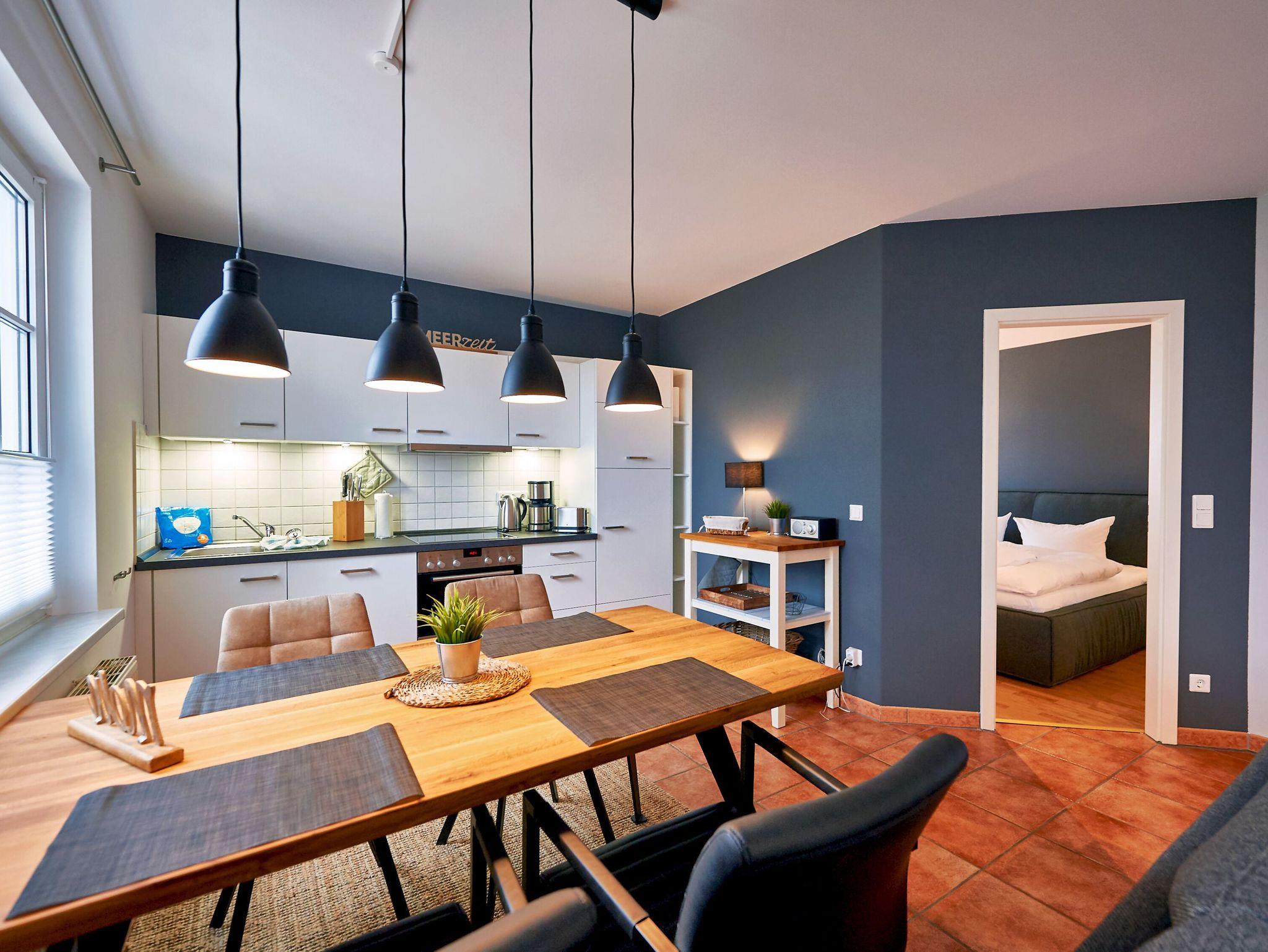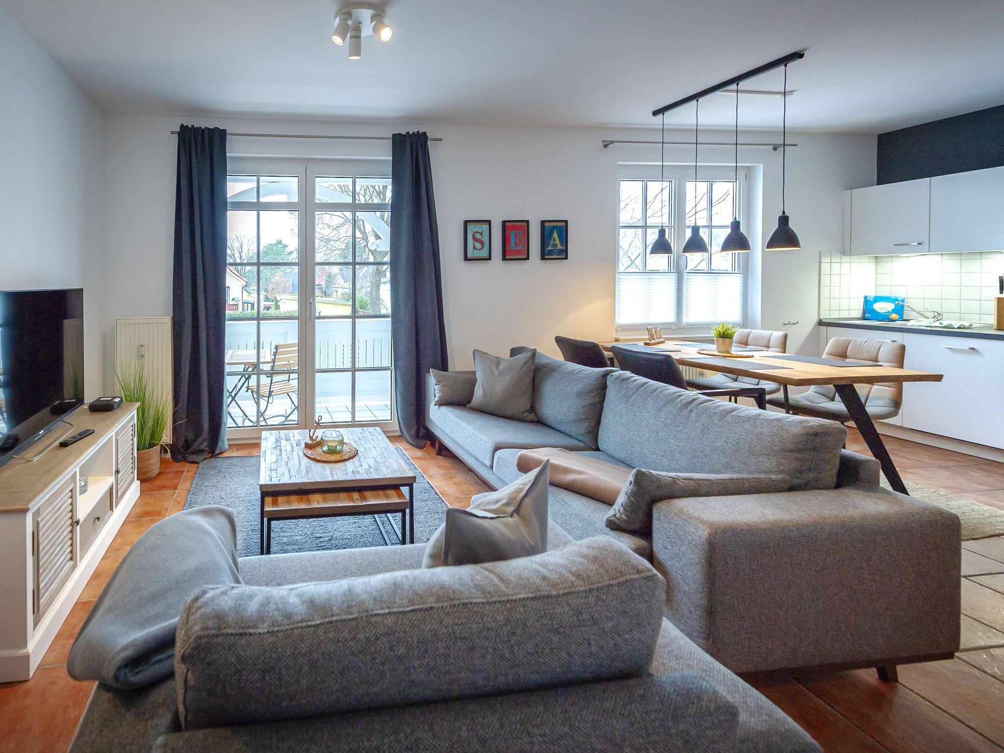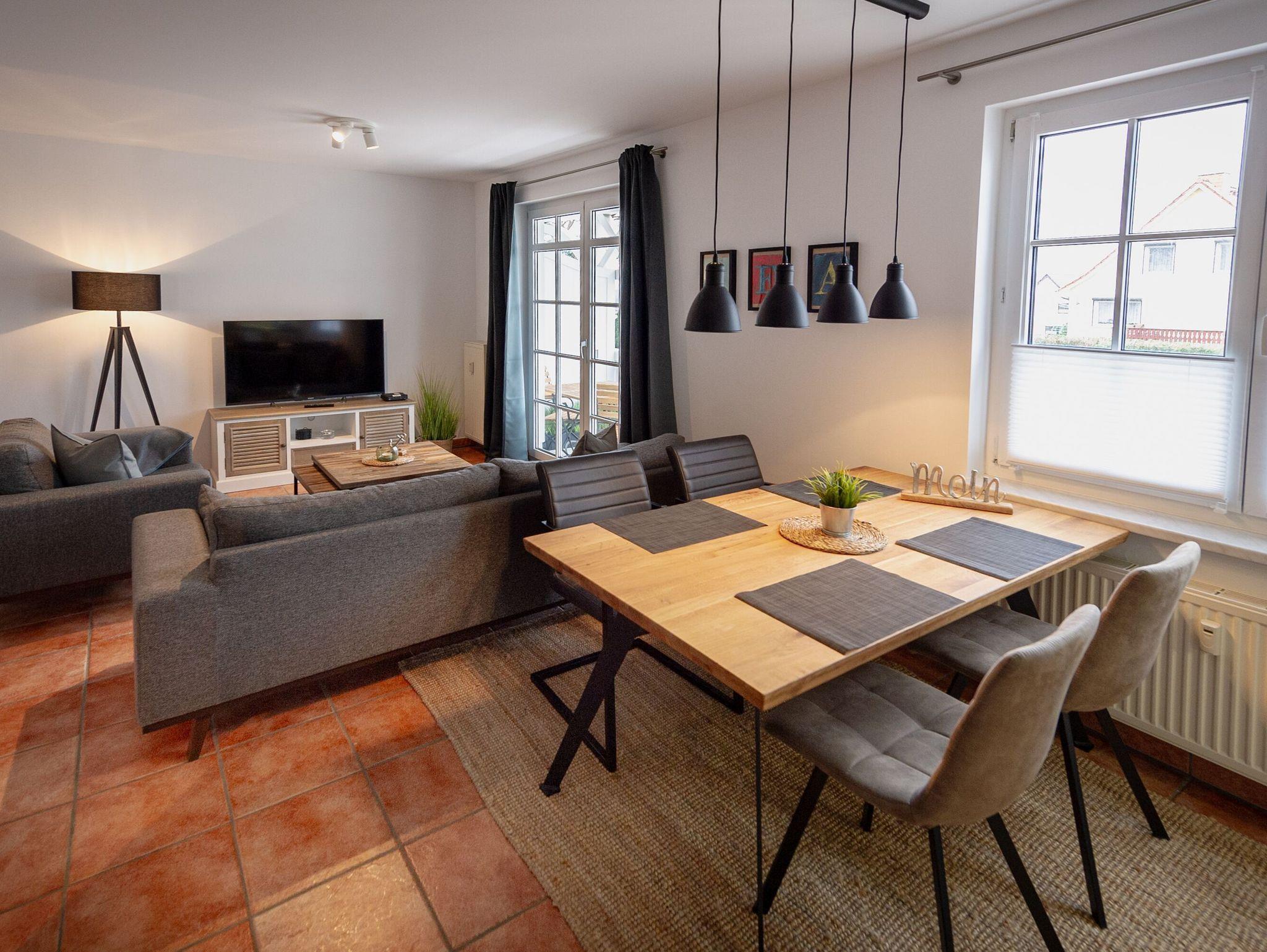 Das großzügige Wohn- und Esszimmer mit integrierter Küchenzeile ist räumlich geschickt in die verschiedenen Bereiche aufgeteilt. Machen Sie es sich auf der bequemen Polstergarnitur vor dem großen Smart-TV bequem, lesen Sie ein gutes Buch, hören etwas Musik und planen Sie den nächsten Ausflug. Der WLAN-Zugang steht Ihnen selbstverständlich ebenfalls kostenfrei zur Verfügung.