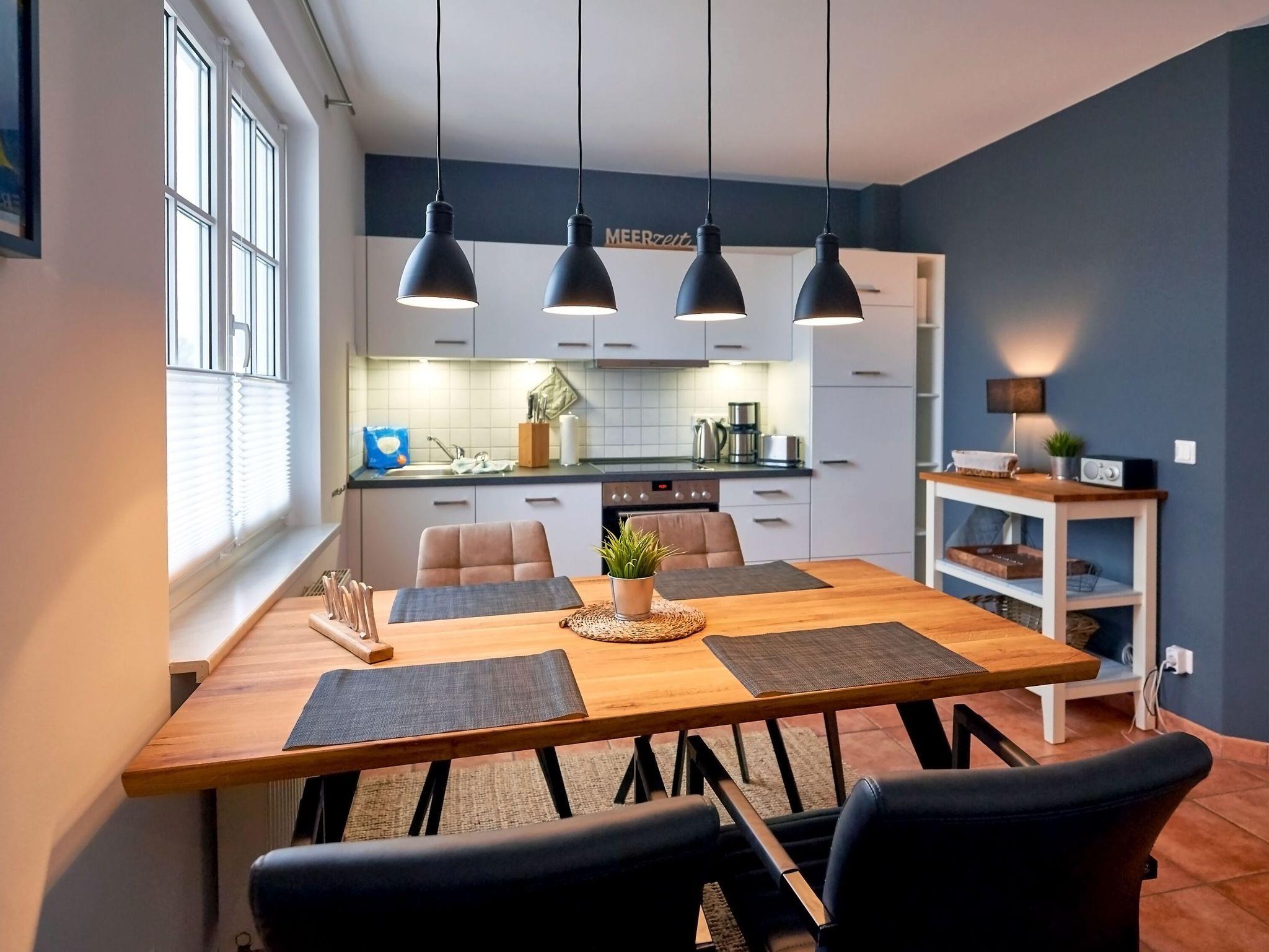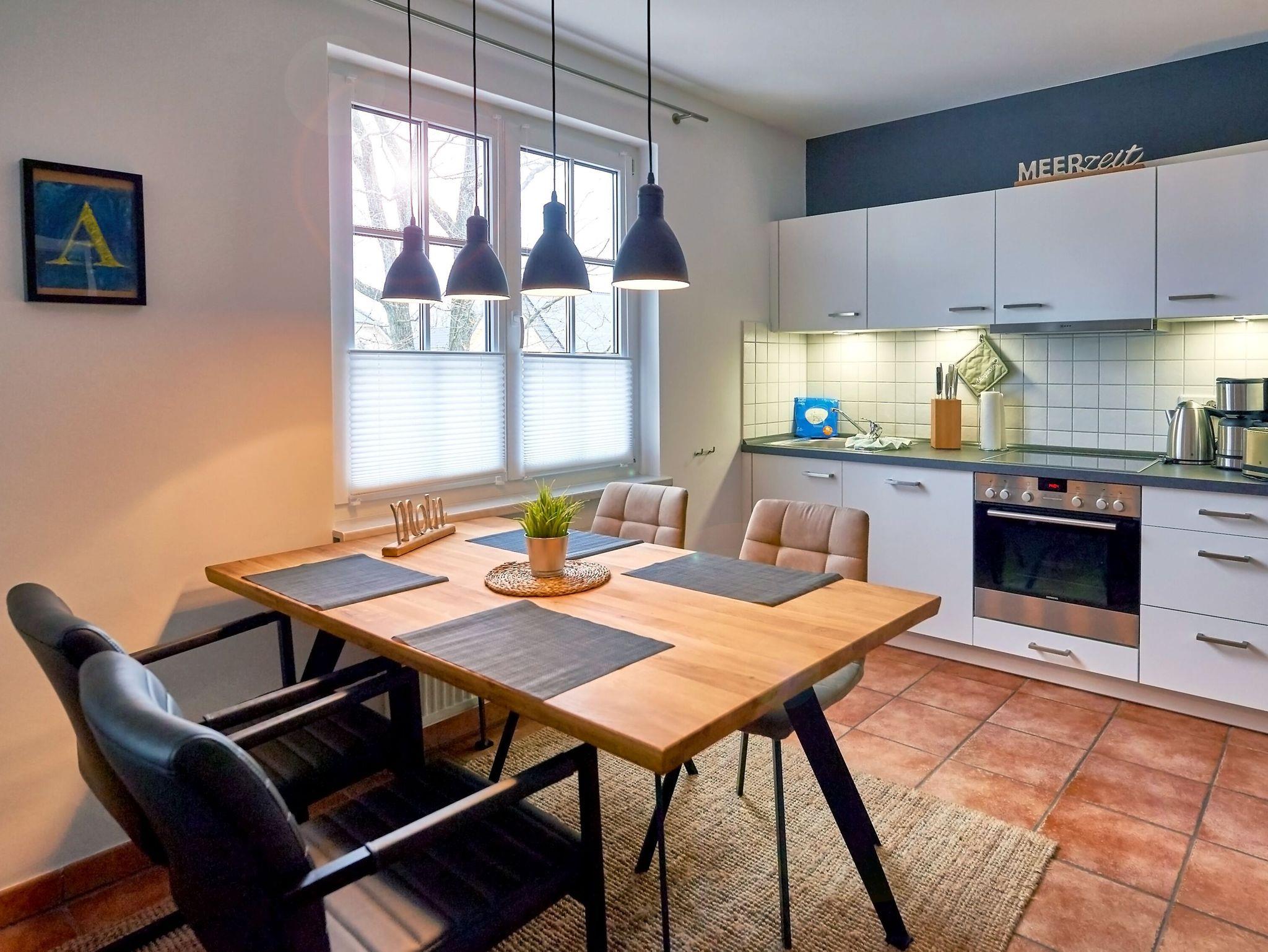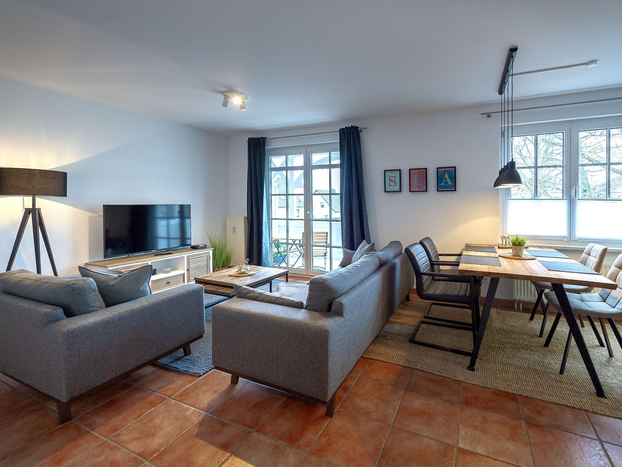 Das großzügige Wohn- und Esszimmer mit integrierter Küchenzeile ist räumlich geschickt in die verschiedenen Bereiche aufgeteilt. Machen Sie es sich auf der bequemen Polstergarnitur vor dem großen Smart-TV bequem, lesen Sie ein gutes Buch, hören etwas Musik und planen Sie den nächsten Ausflug. Der WLAN-Zugang steht Ihnen selbstverständlich ebenfalls kostenfrei zur Verfügung.