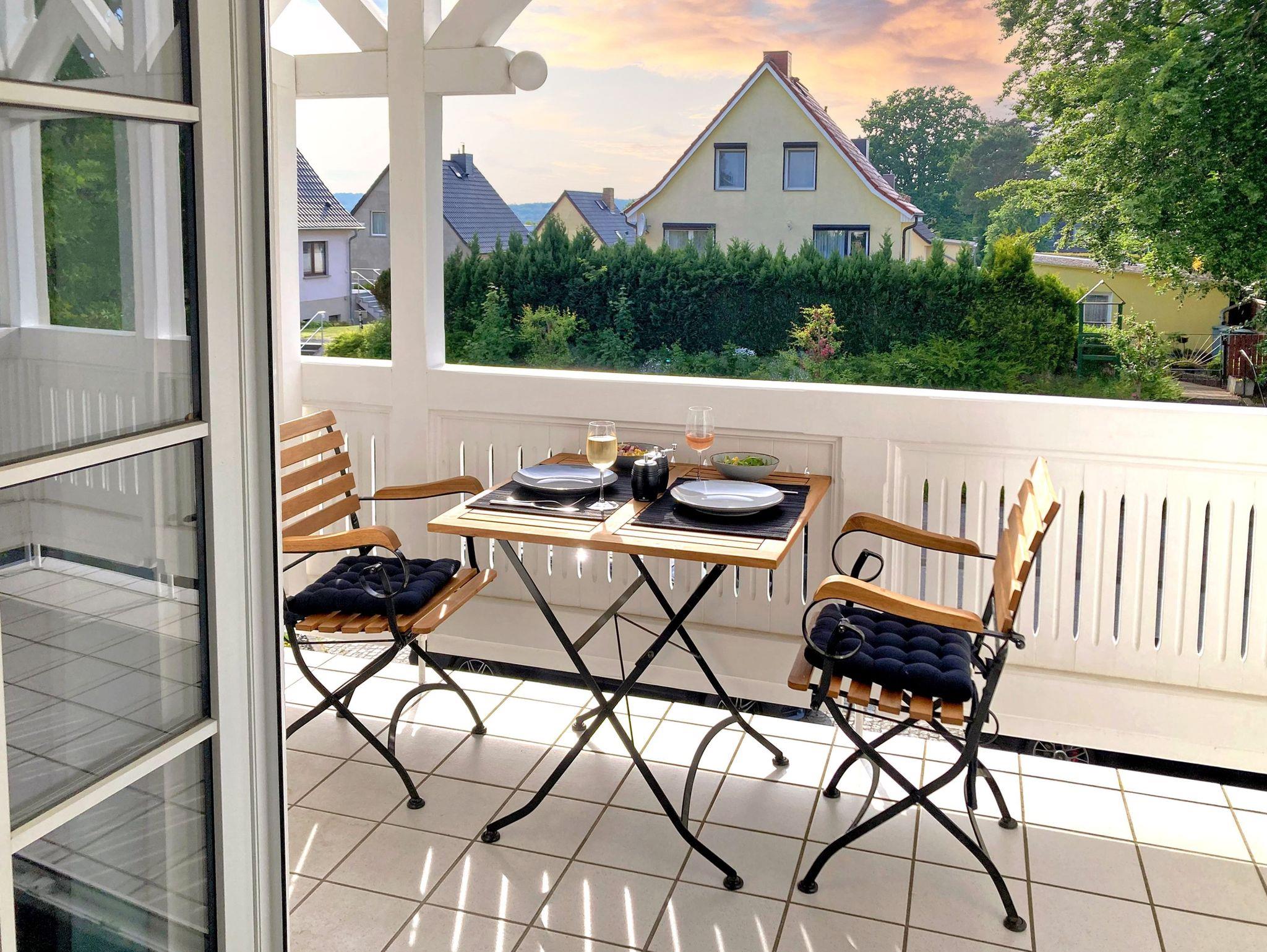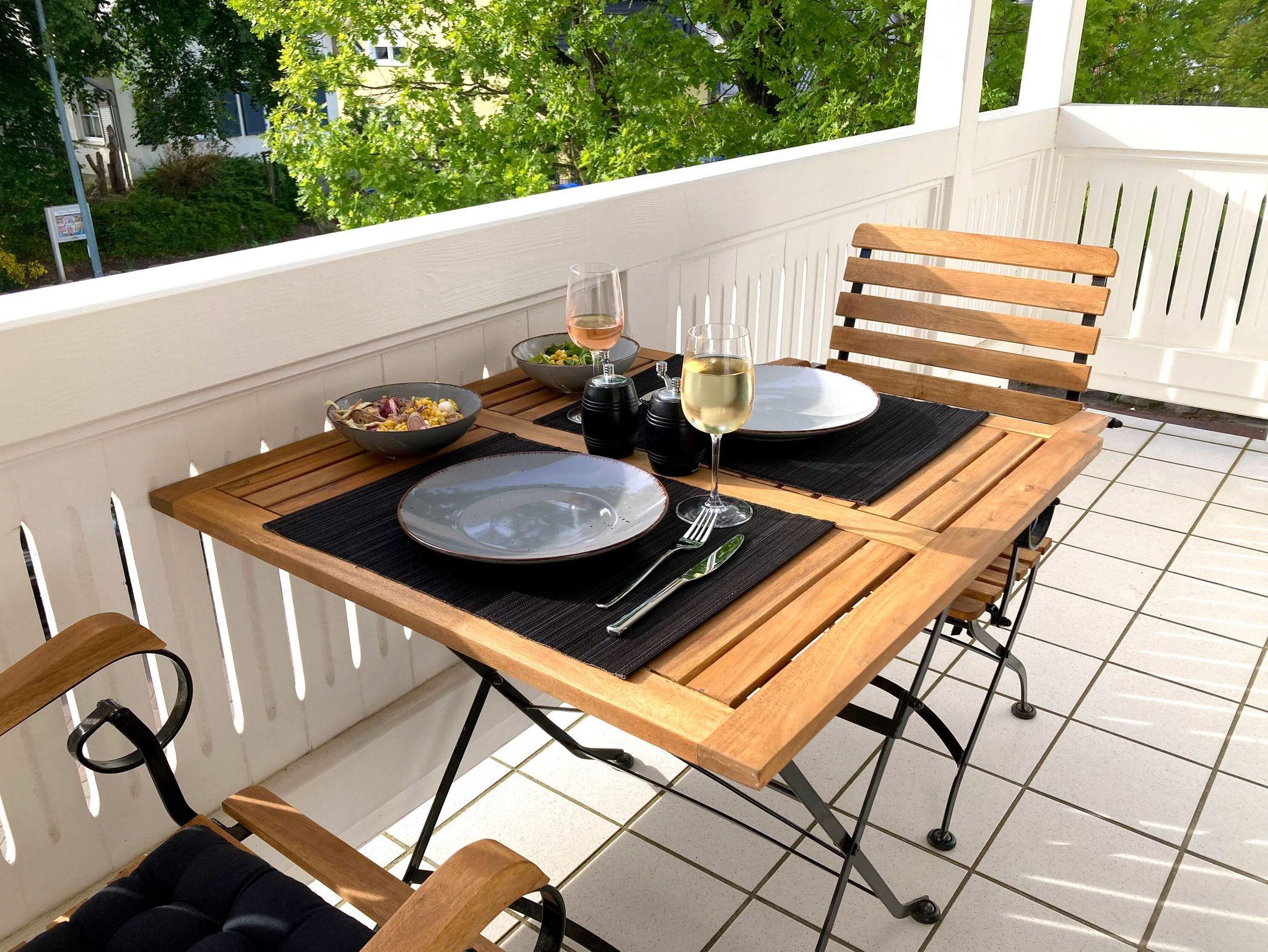 Speisen können Sie wahlweise am großen Esstisch im Wohnzimmer oder auf dem Balkon, auf dem die Sonne am Nachmittag und Abend zu Gast ist.