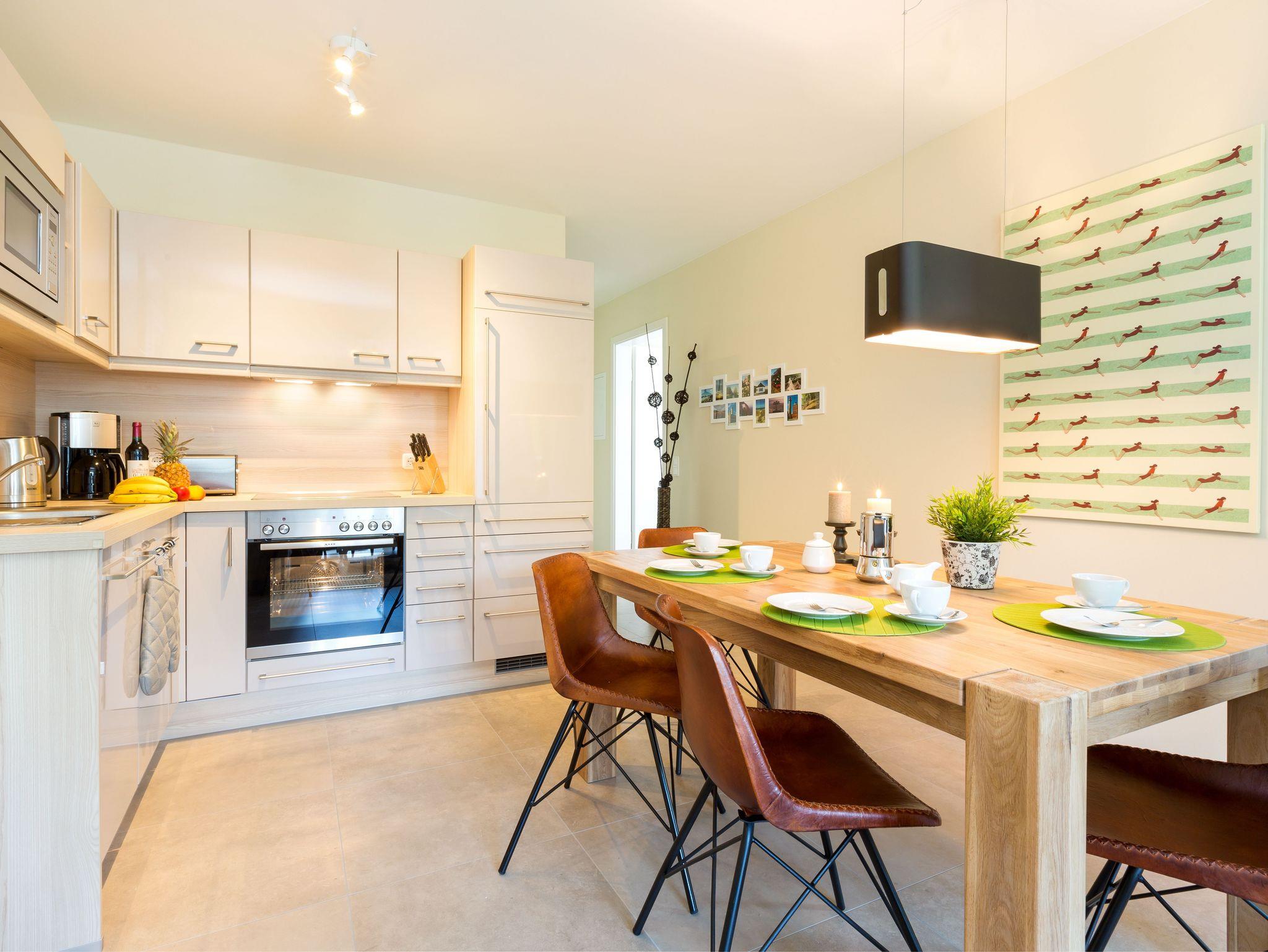 Die Einbauküche ist mit Cerankochfeld, Backherd, Geschirrspüler, Mikrowelle, Nespresso Kapselmaschine von der Firma „DeLonghi“ und weiteren nützlichen Geräten wie Kaffeemaschine, Toaster, Wasserkocher etc. ausgestattet. Das Bad verfügt über eine bodentiefe Dusche. Safe und ein Fön gehören ebenfalls zur Ausstattung des Apartments.