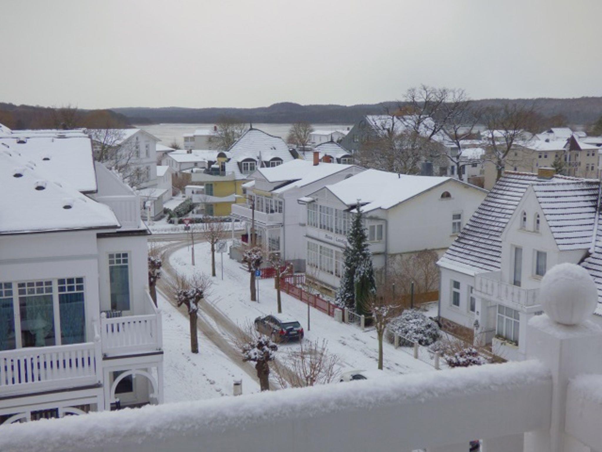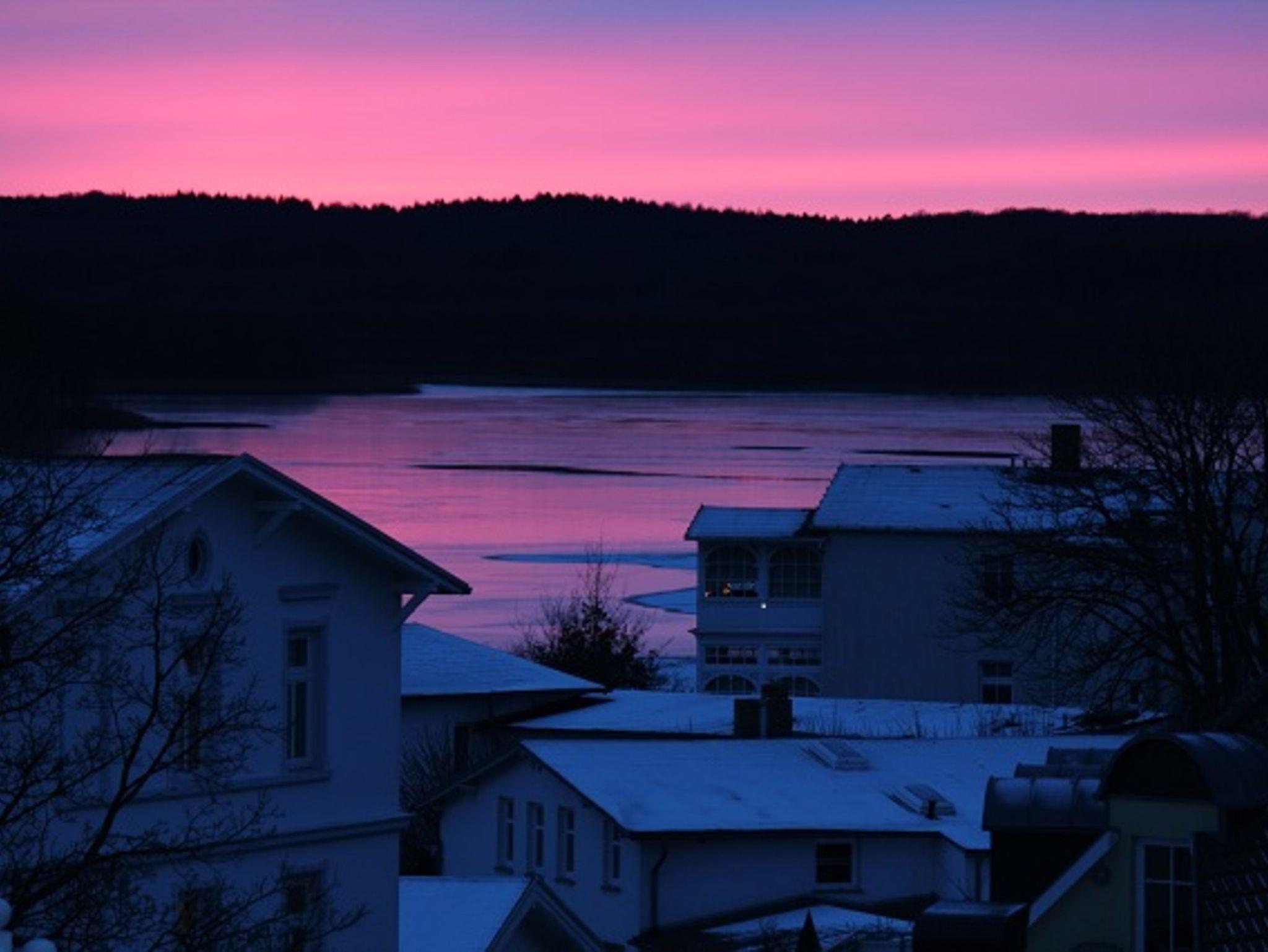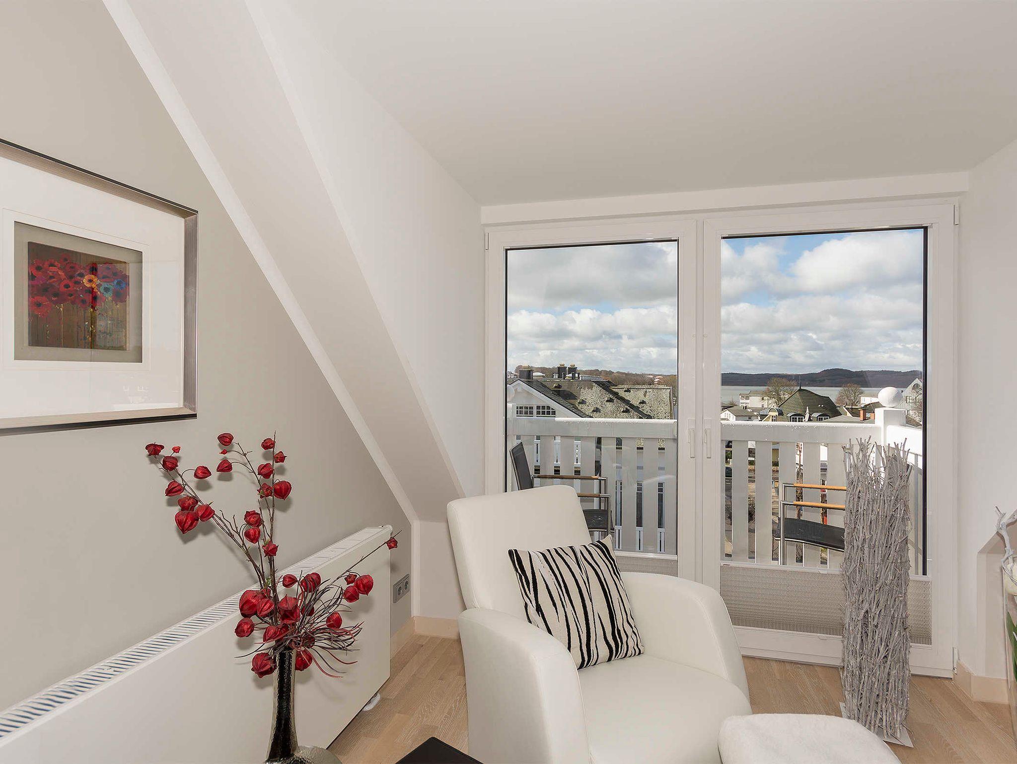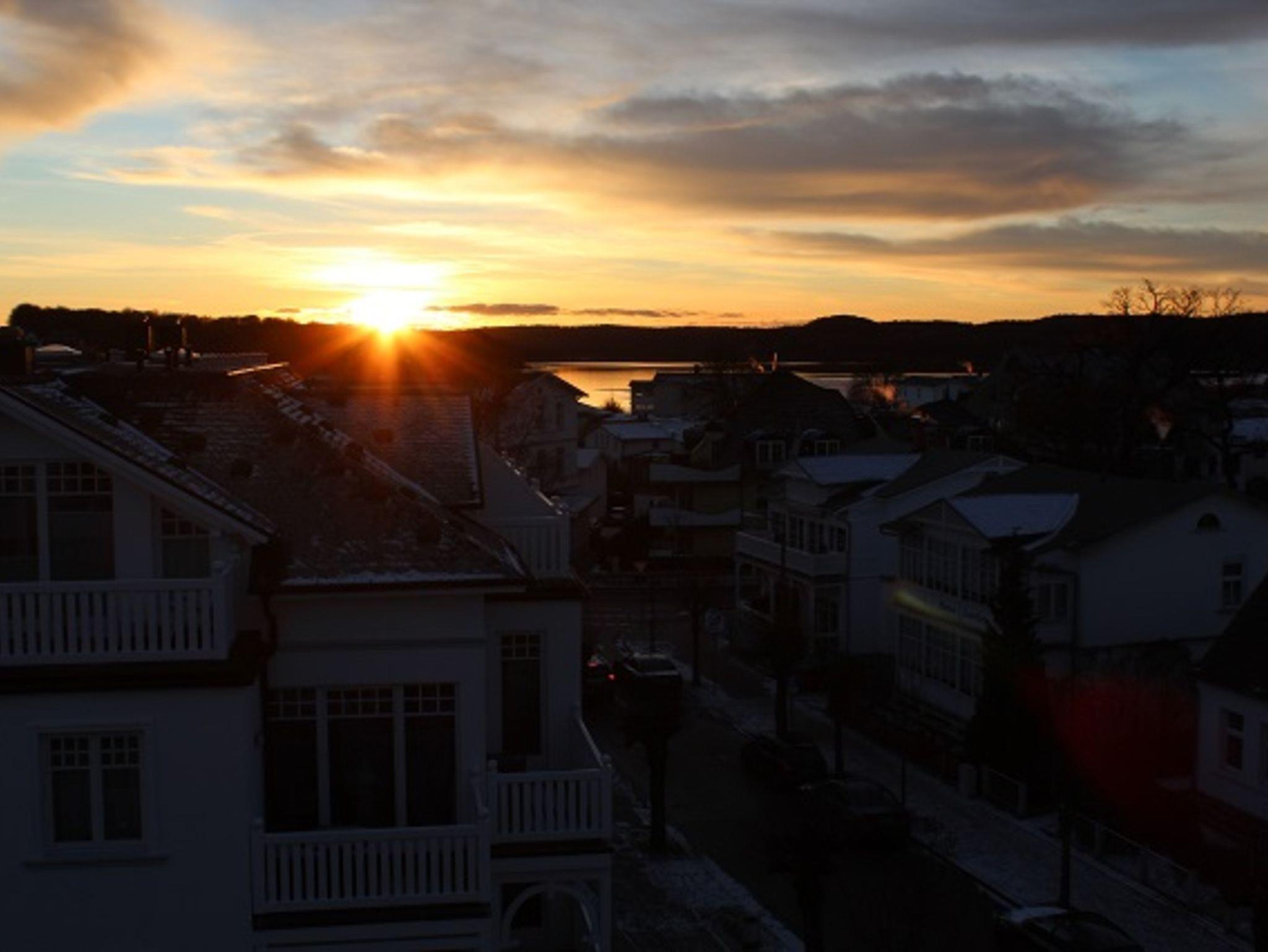 Vom kleinen, sehr gemütlichen Balkon genießen Sie unvergessliche Abende mit einzigartigem Blick über die Dächer von Binz mit beeindruckenden Sonnenuntergängen am Schmachter See.