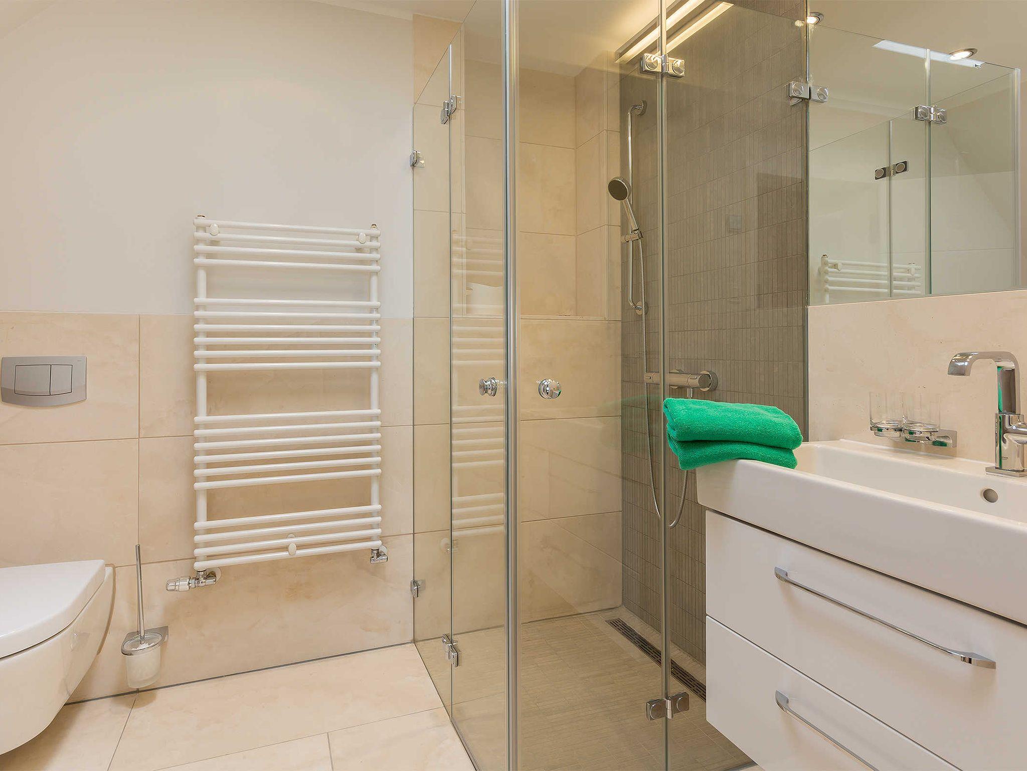 Das Bad mit Dusche ist elegant mit hellem Marmor und Fußbodenheizung ausgestattet.