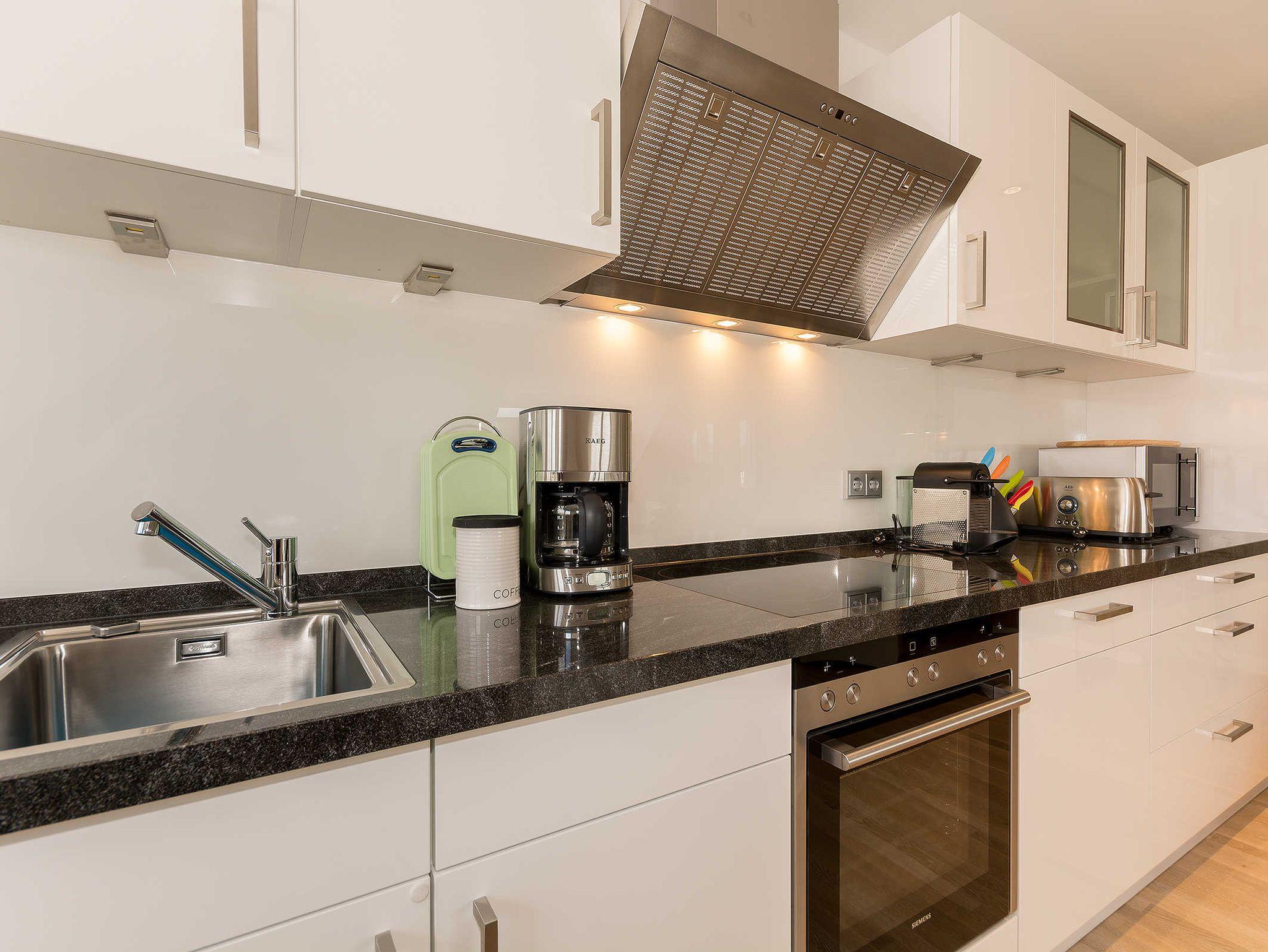 Die geräumige, hochwertige Küche mit Mikrowelle, Cerankochfeld, Backofen, Kühl-und Gefrierschrank, Geschirrspüler, Kaffeemaschine, Nespressoautomat etc. läßt keine Wünsche offen.