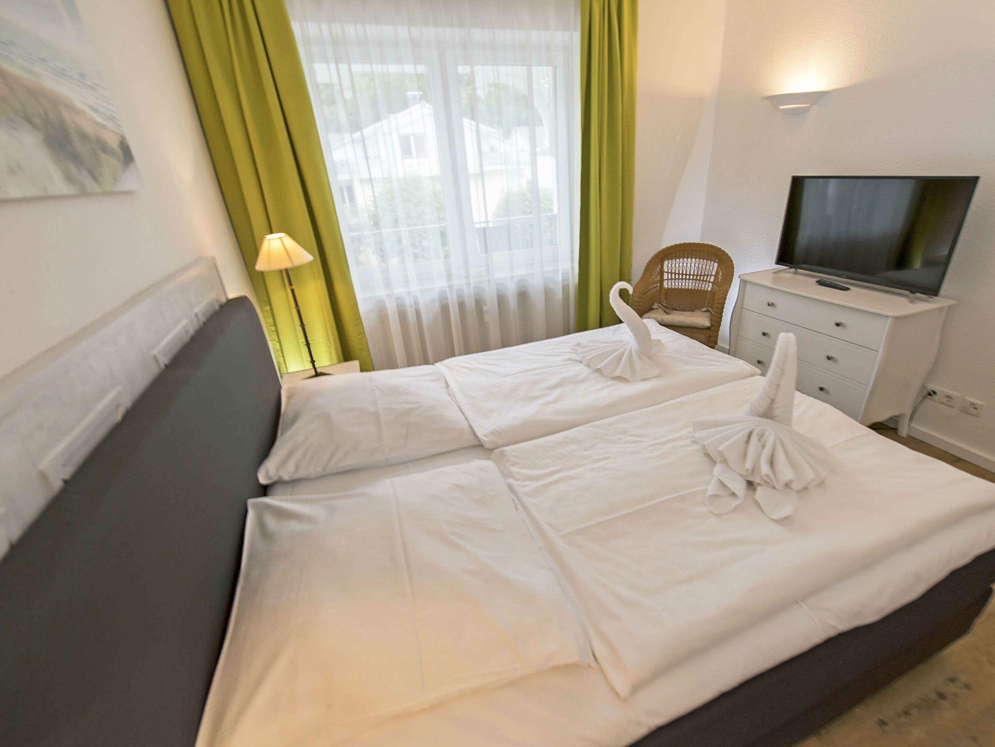Das Appartement verfügt über zwei Schlafzimmer. Das größere ist zum Laubengang gelegen - hier gibt es ein Boxspringbett 1,80 x 2,00 m, einen zusätzlichen Flachbild-TV und ausreichend Stauraum für Ihre Urlaubsgarderobe. Das zweite Schlafzimmer mit Meerblick ist durch eine Schiebetür vom Wohnbereich getrennt und mit einem Boxspringbett 1,60 x 2,00 m ausgestattet.