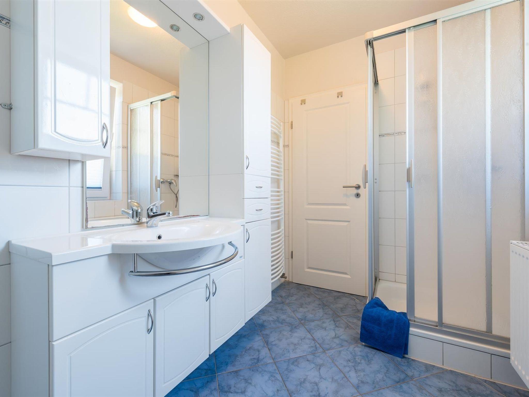 Bad mit Fenster, Dusche, WC sowie großzügigem Waschtisch- und Schrank